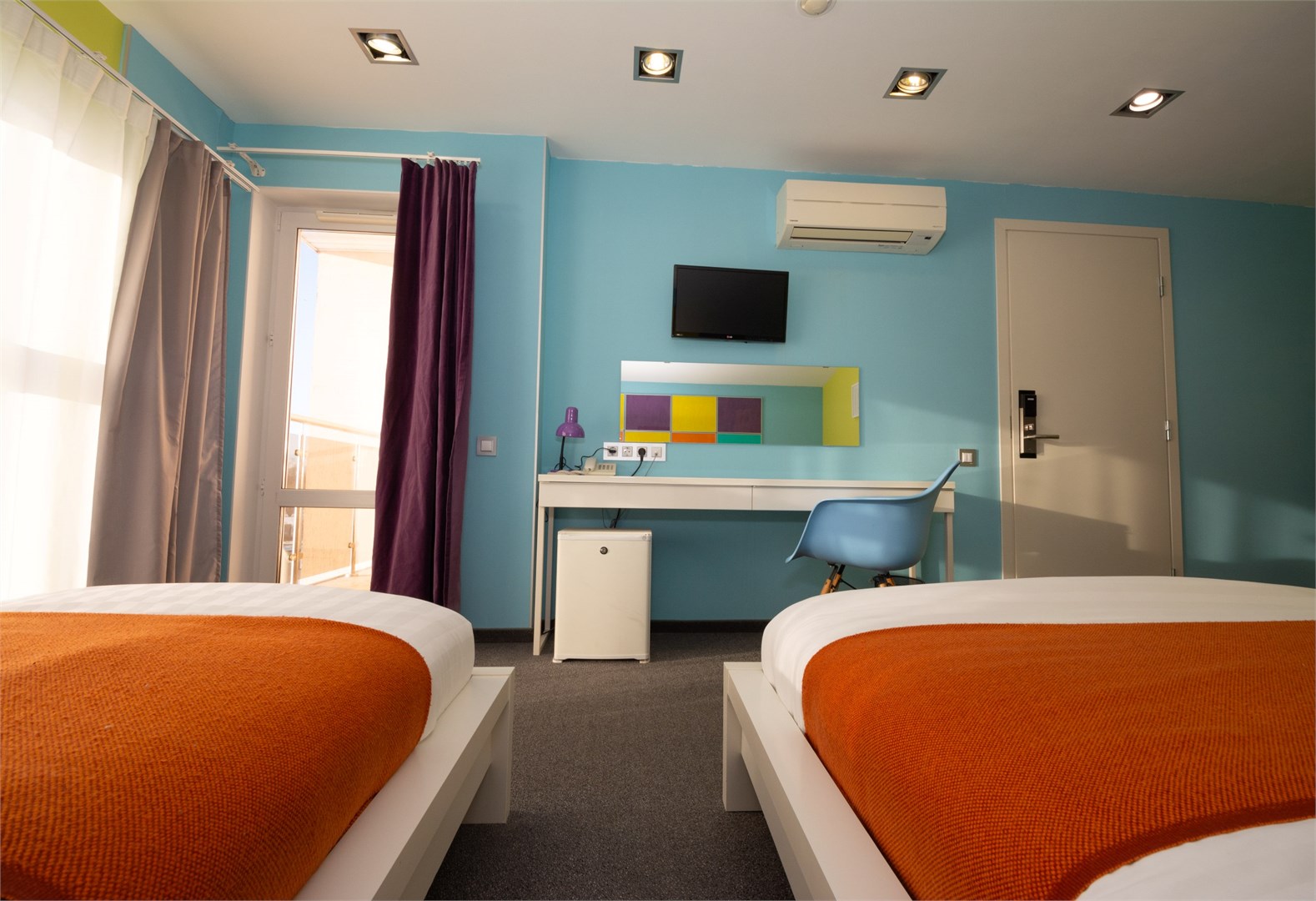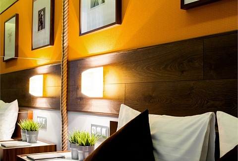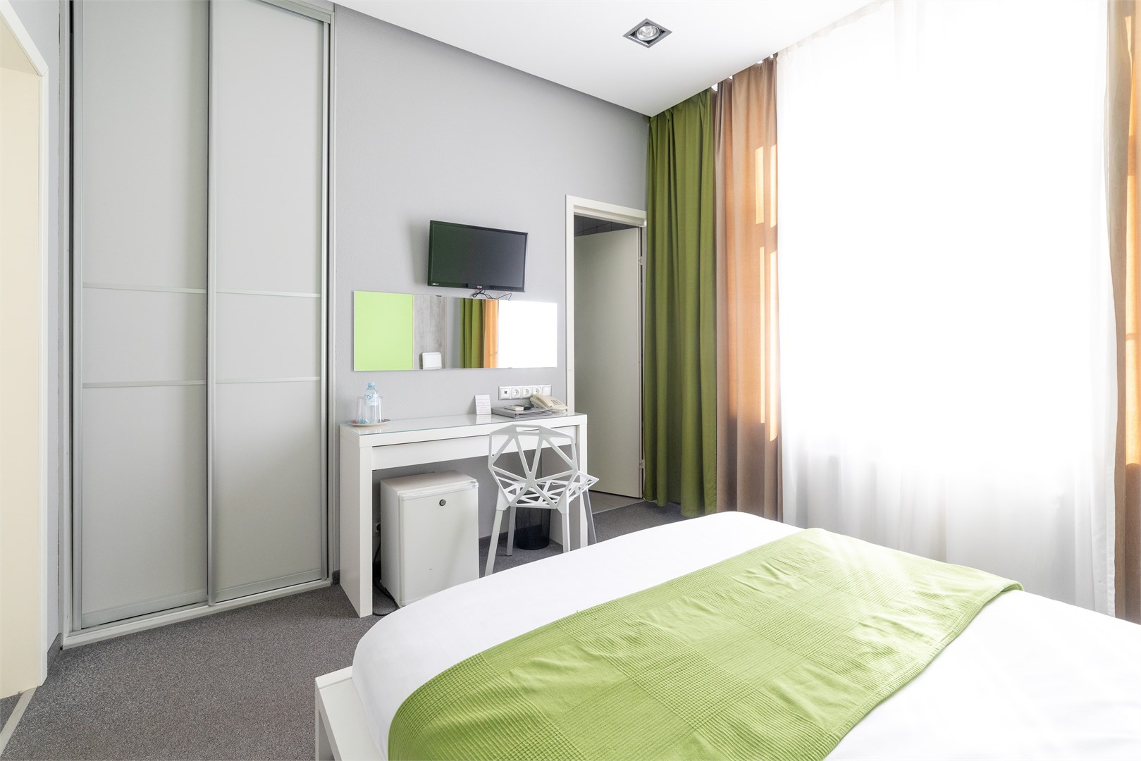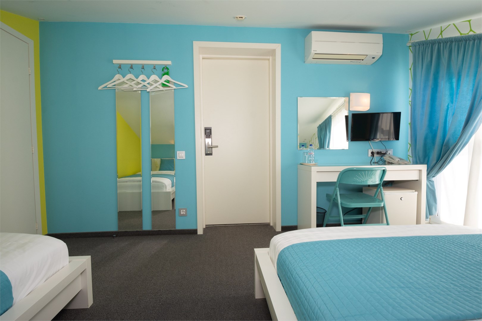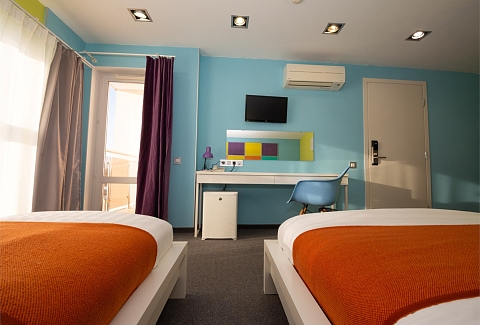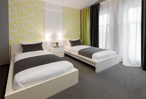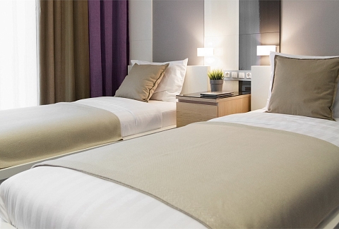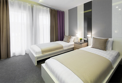 В номере: вешалка, зеркало, кровати односпальные, прикроватные тумбочки, стол, стул, шкаф, кондиционер, мини-холодильник, телевизор ЖК, телефон, чайный набор посуды, электрочайник