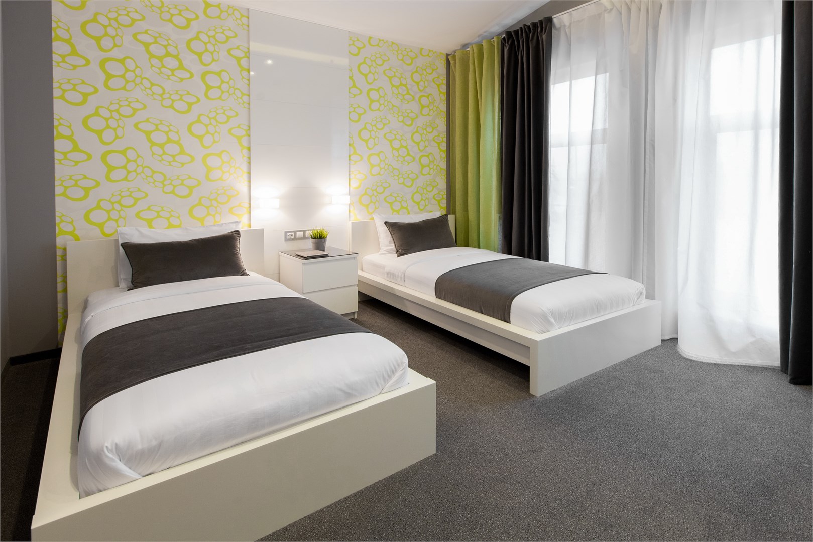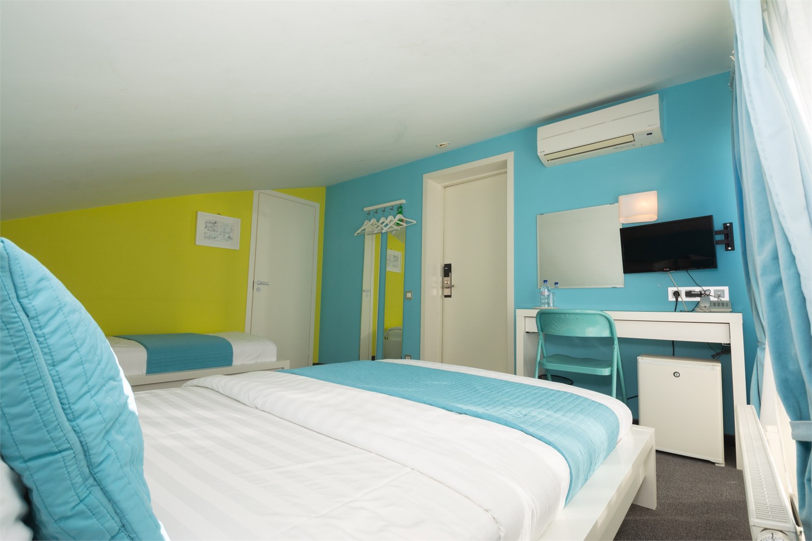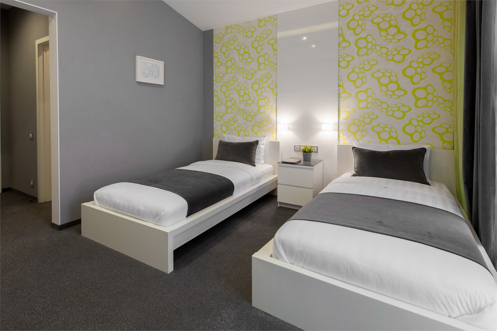 В номере: вешалка, зеркало, кровати односпальные, прикроватные тумбочки, стол, стул, шкаф, кондиционер, мини-холодильник, телевизор ЖК, телефон, чайный набор посуды, электрочайник