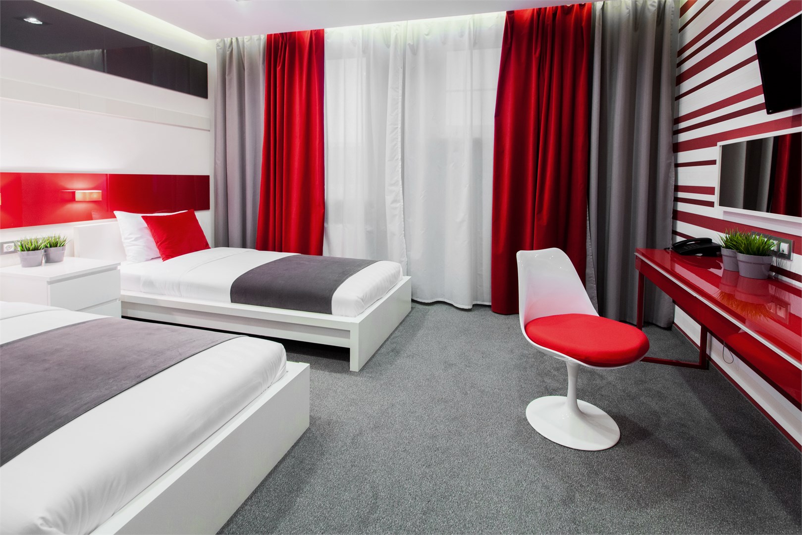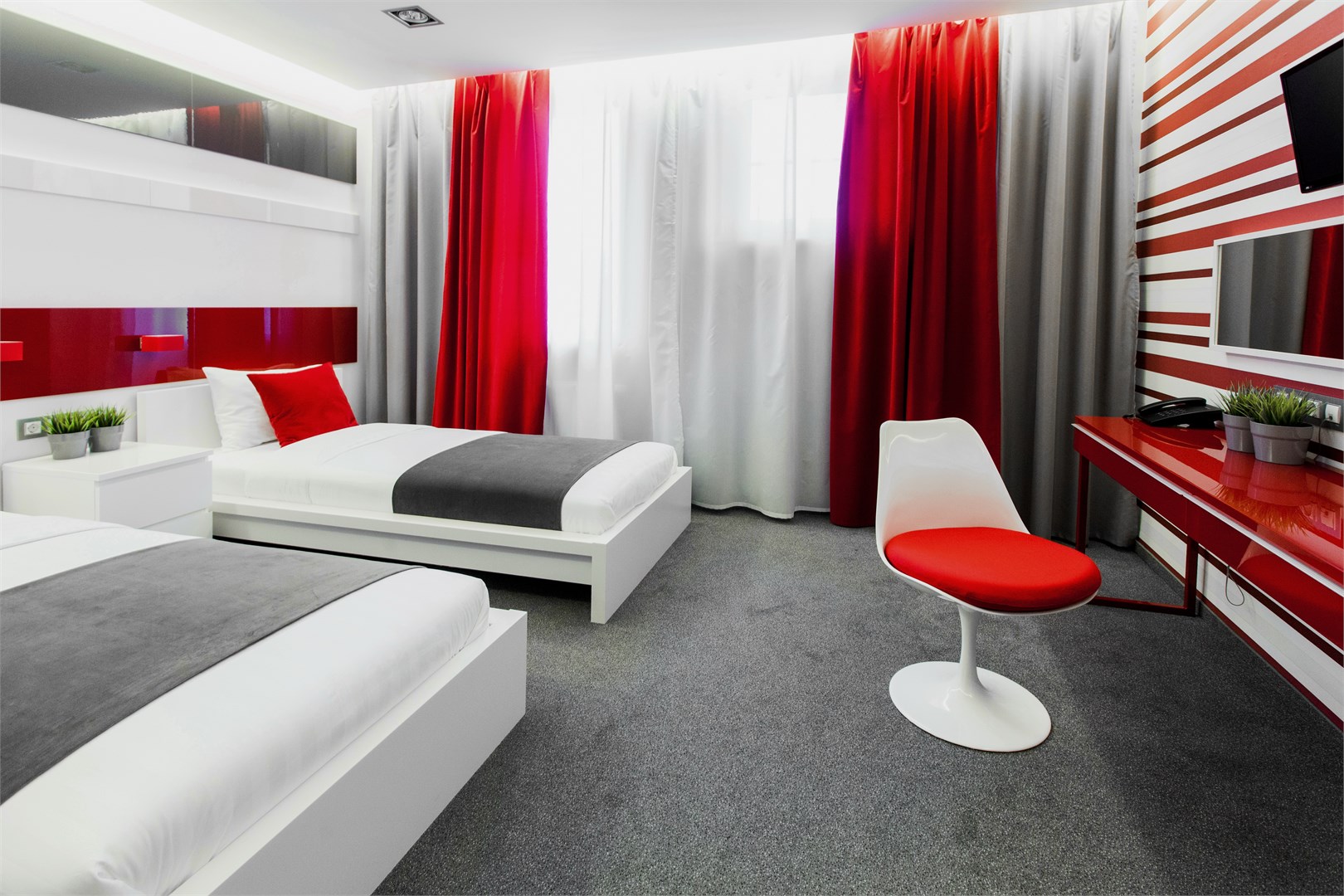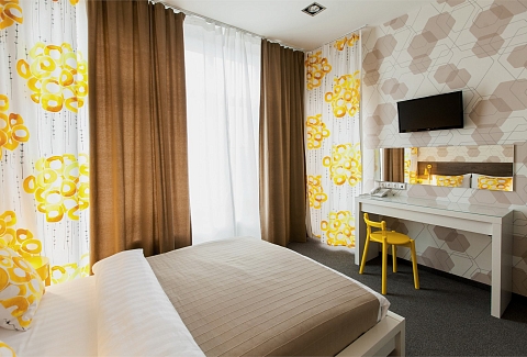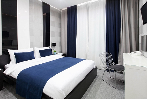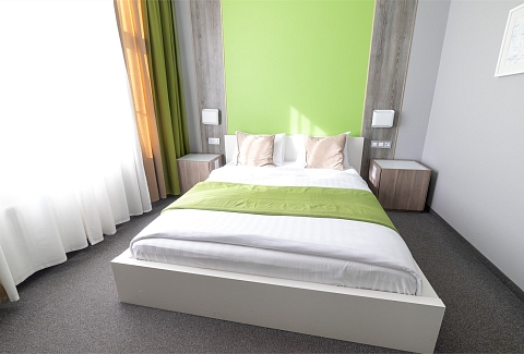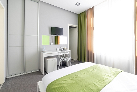 В номере: вешалка, зеркало, кровати односпальные /одна двуспальная кровать, прикроватные тумбочки, стол, стул, шкаф, кондиционер, мини-холодильник, телевизор ЖК, телефон, чайный набор посуды, электрочайник
