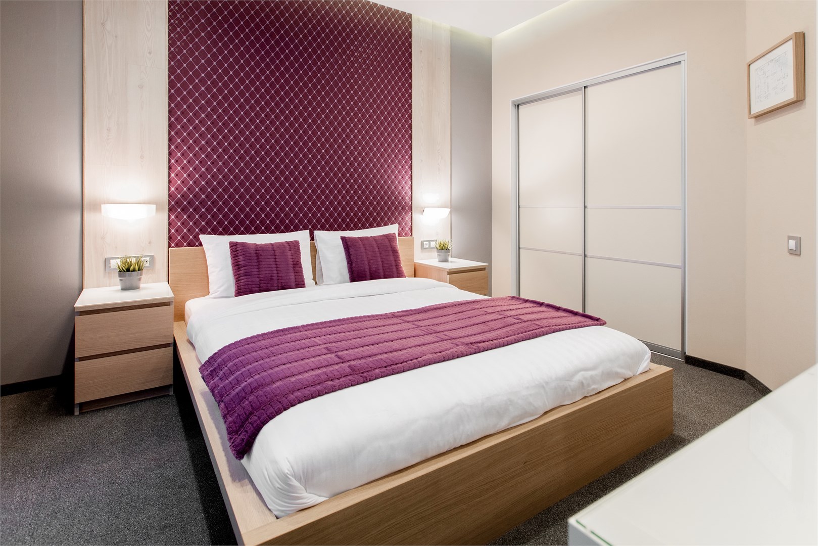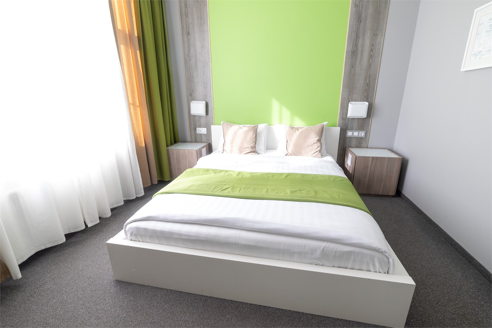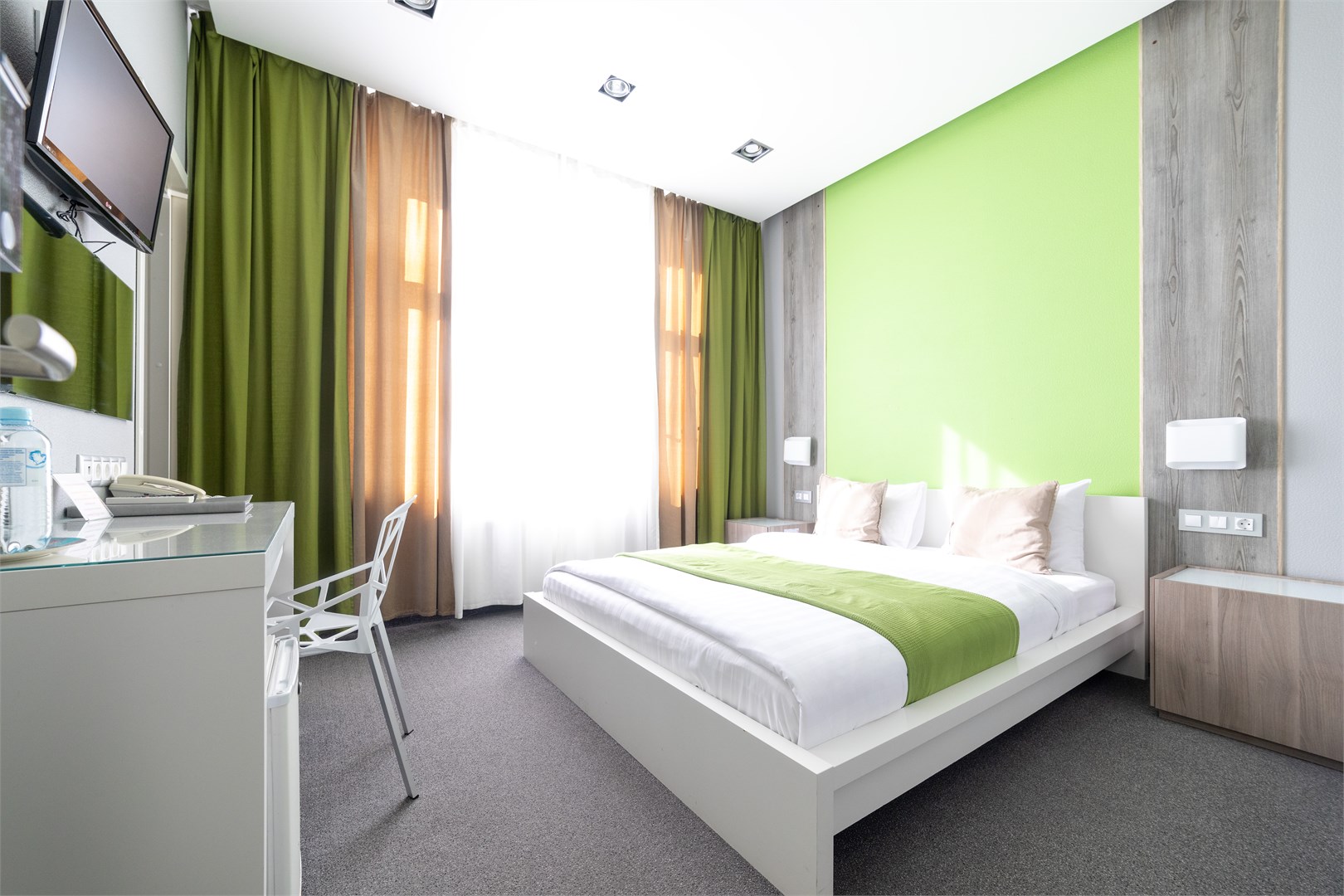 В номере: вешалка, зеркало, кровати односпальные /одна двуспальная кровать, прикроватные тумбочки, стол, стул, шкаф, кондиционер, мини-холодильник, телевизор ЖК, телефон, чайный набор посуды, электрочайник