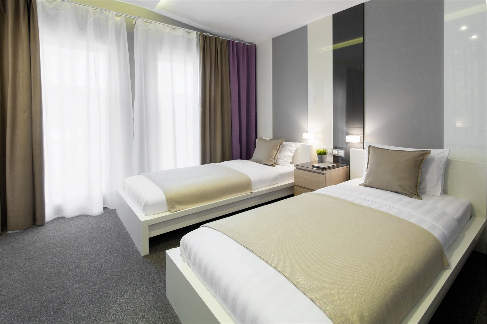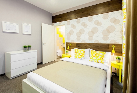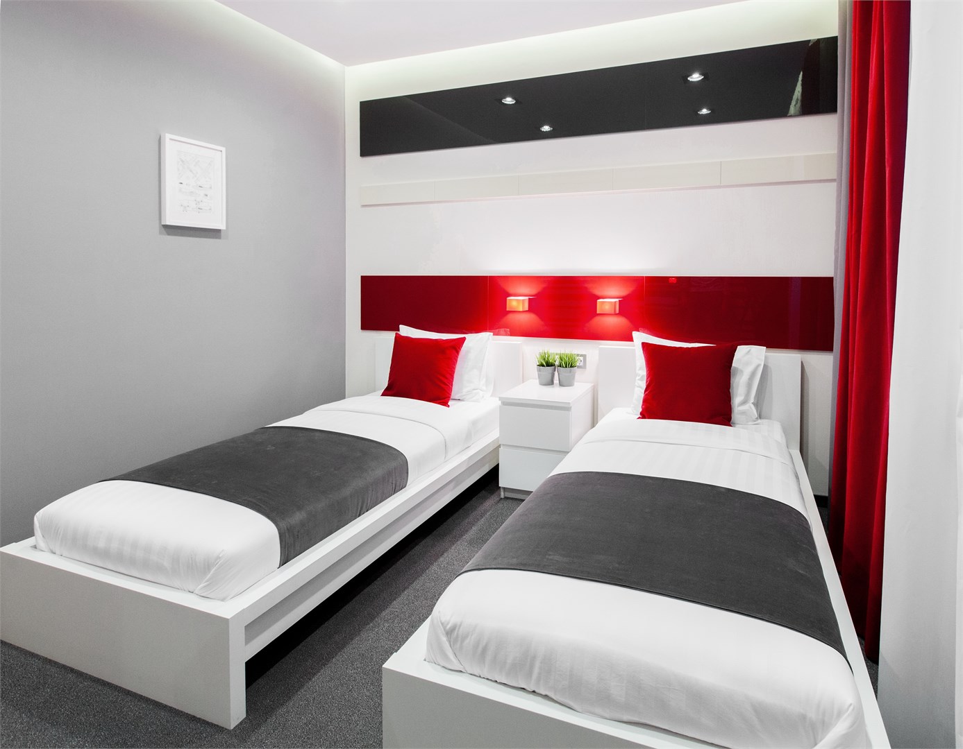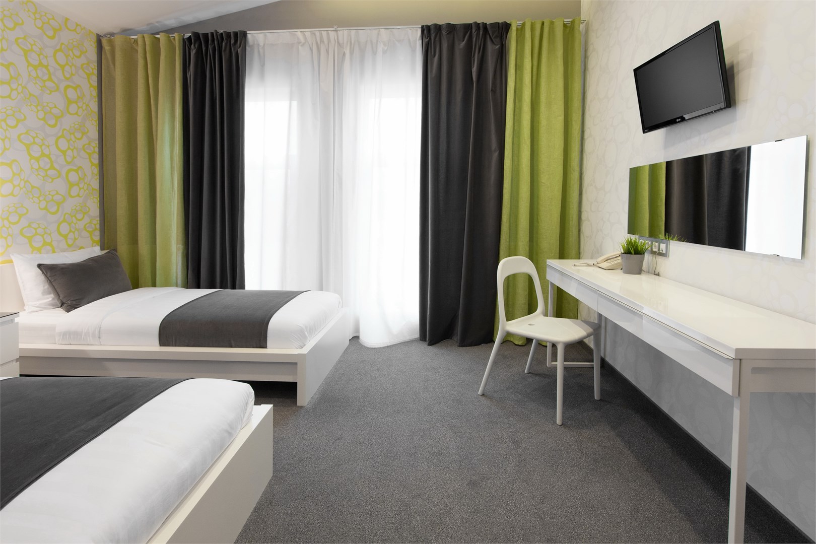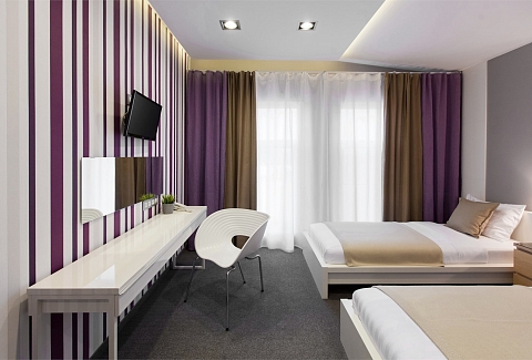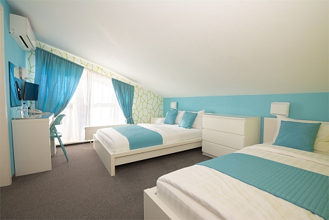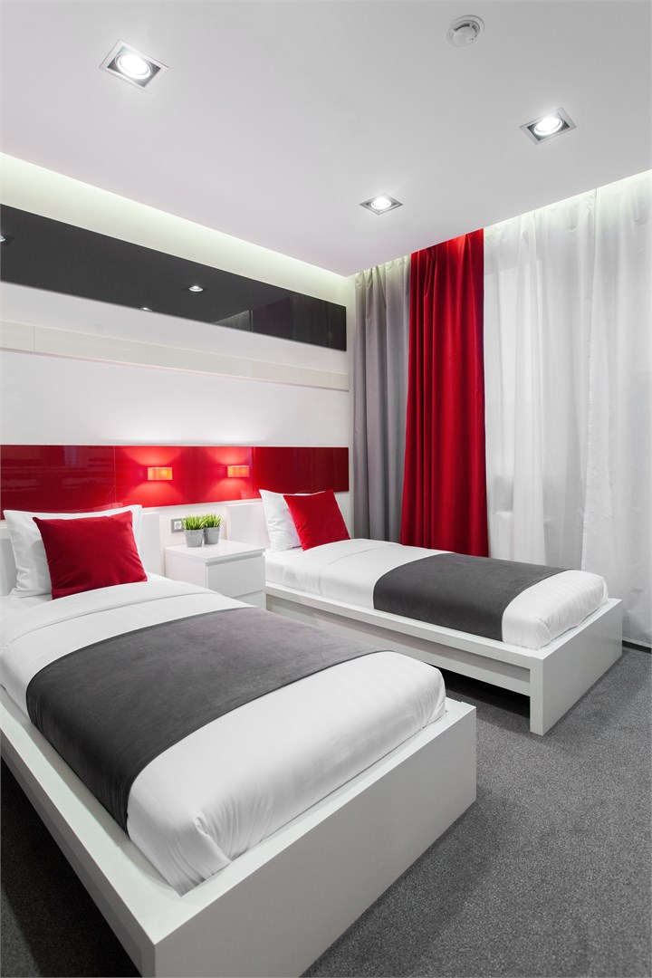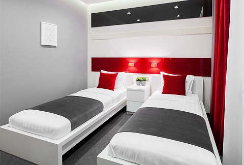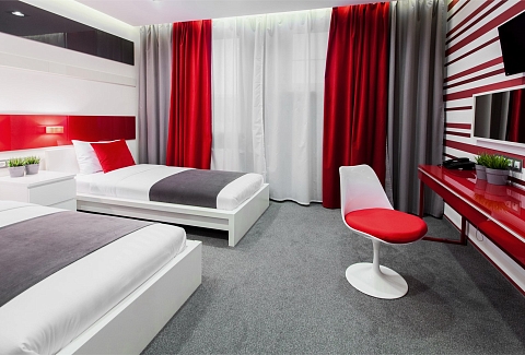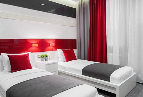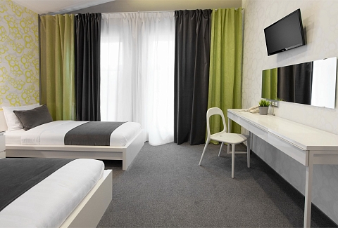 В номере: вешалка, кровати односпальные, прикроватные тумбочки, стол, стулья, шкаф, кондиционер, мини-холодильник, телевизор ЖК, телефон, чайный набор посуды, электрочайник