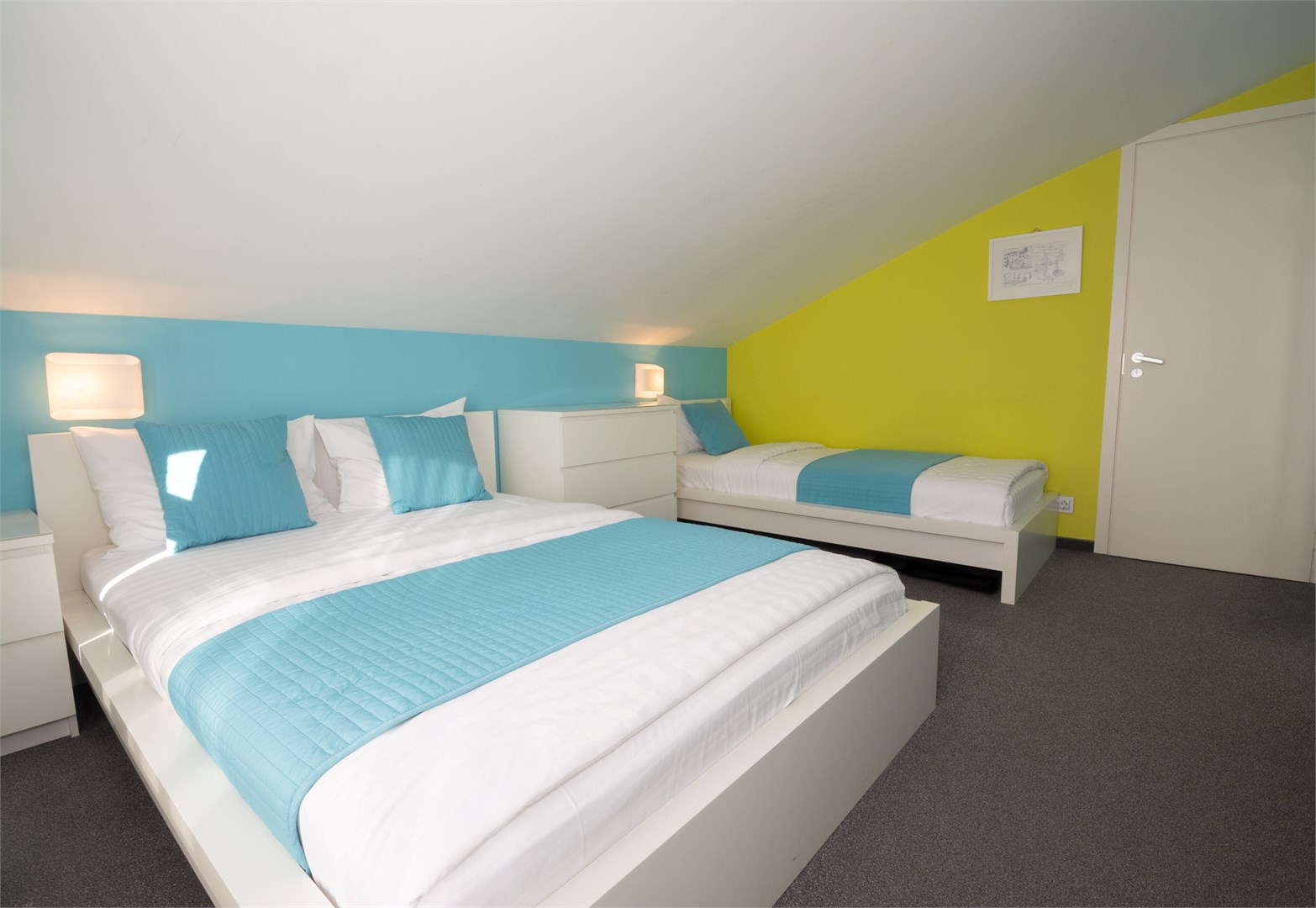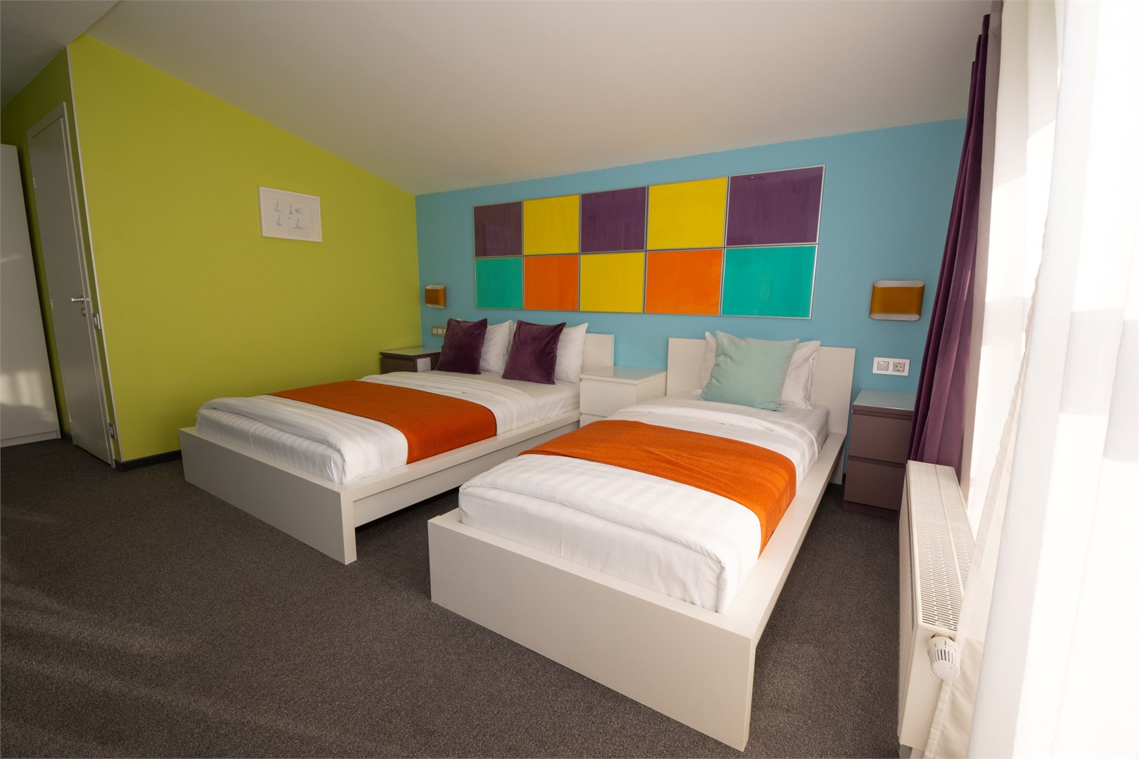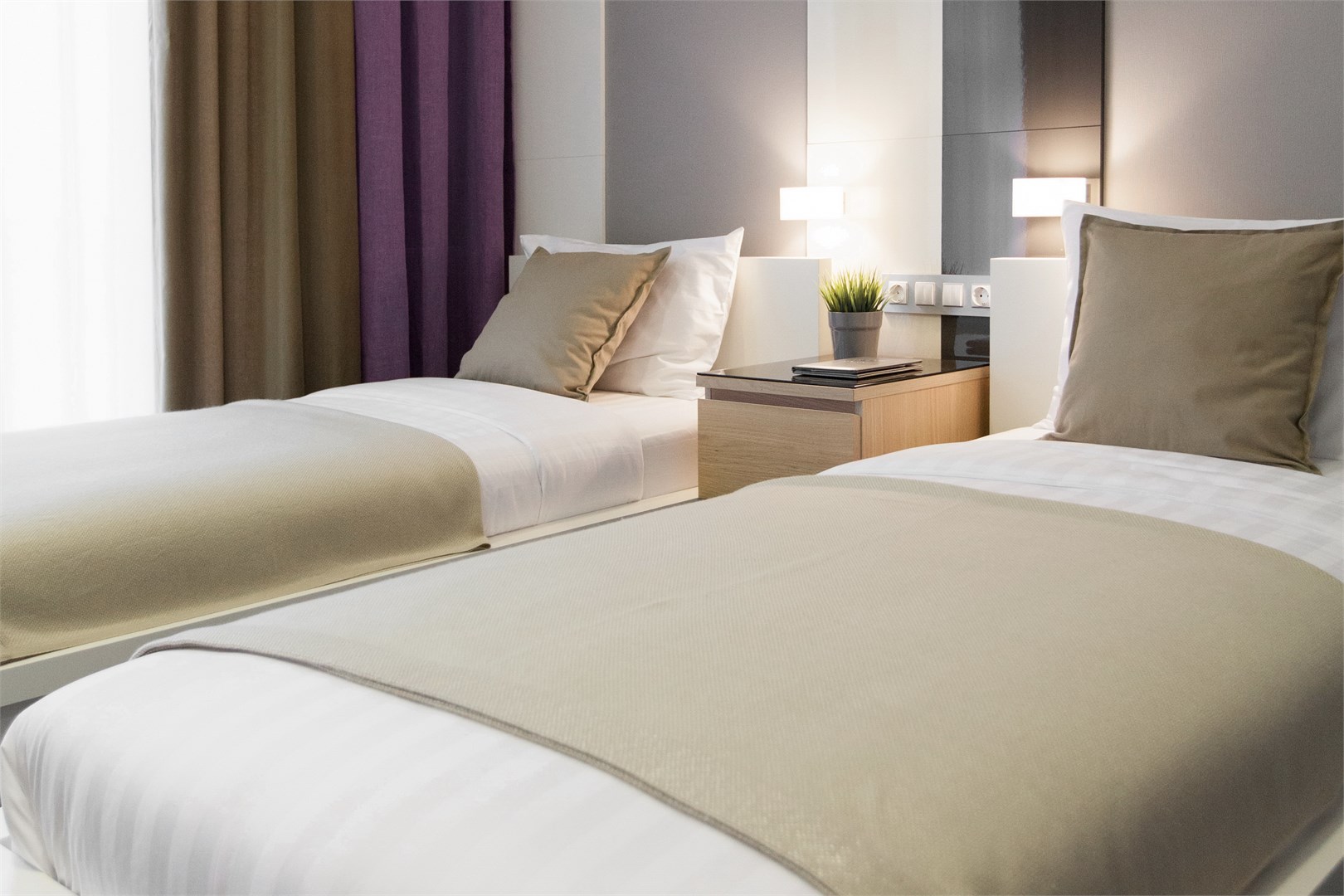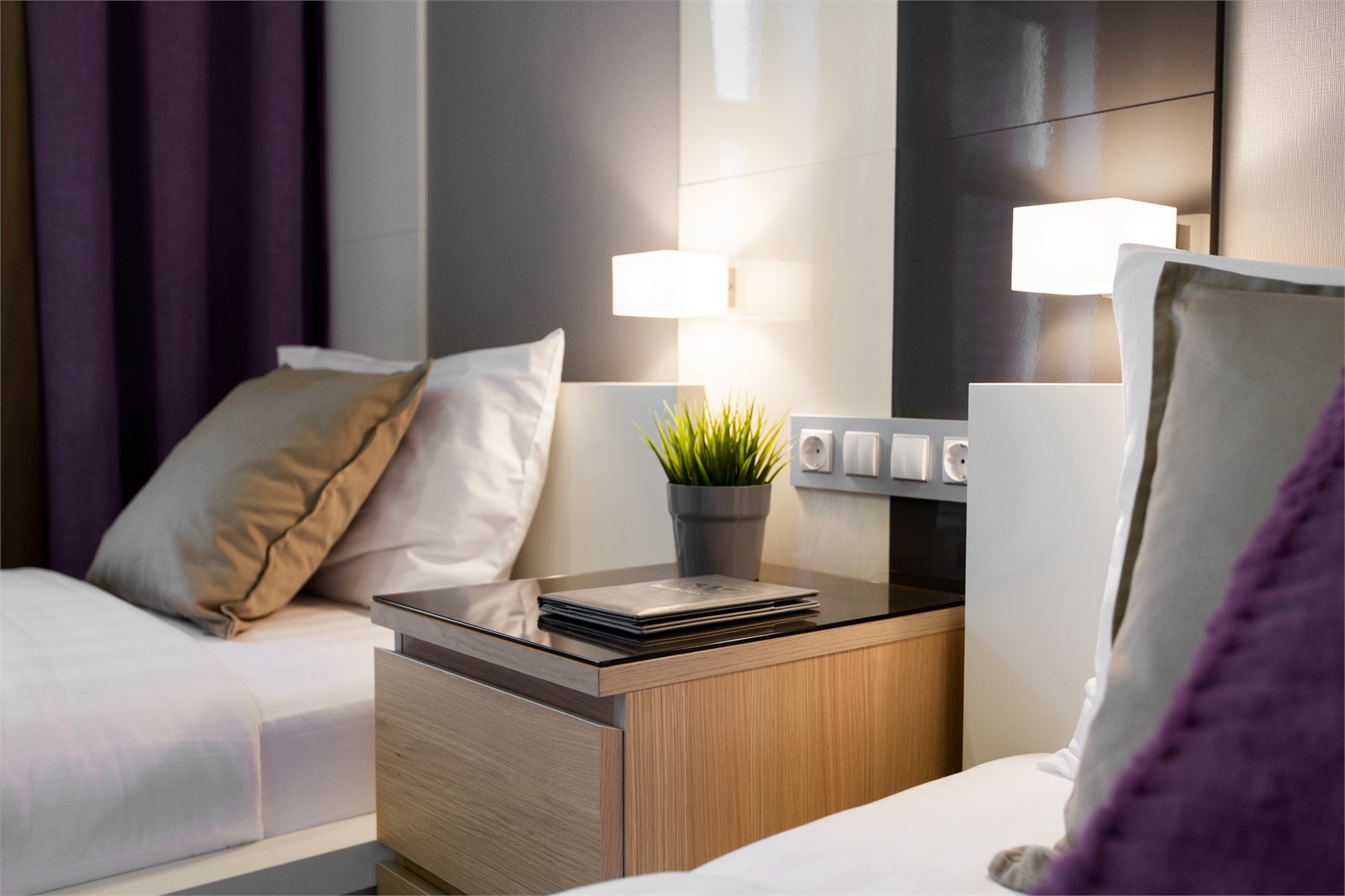 В номере: вешалка, кровати односпальные, прикроватные тумбочки, стол, стулья, шкаф, кондиционер, мини-холодильник, телевизор ЖК, телефон, чайный набор посуды, электрочайник