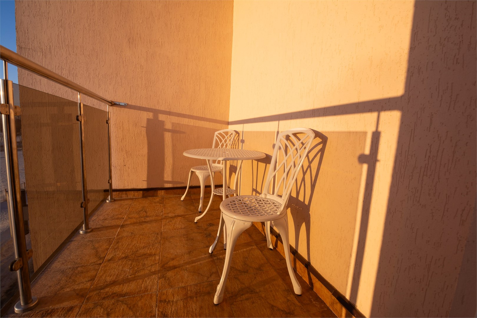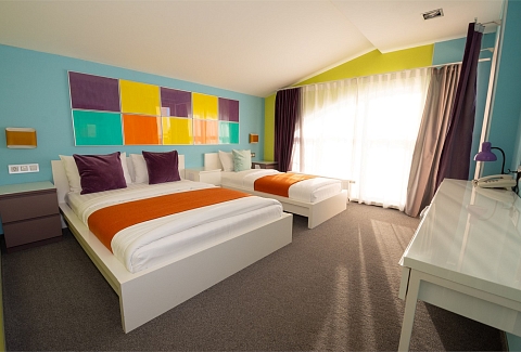 В номере: вешалка, зеркало, кровати односпальные /одна двуспальная кровать, прикроватные тумбочки, стол, стулья, шкаф, кондиционер, мини-холодильник, телевизор ЖК, телефон, чайный набор посуды, электрочайник