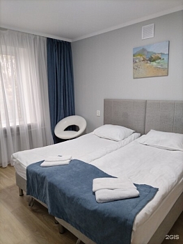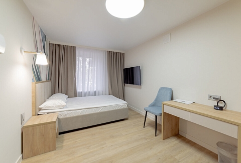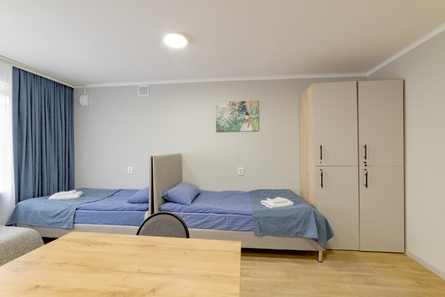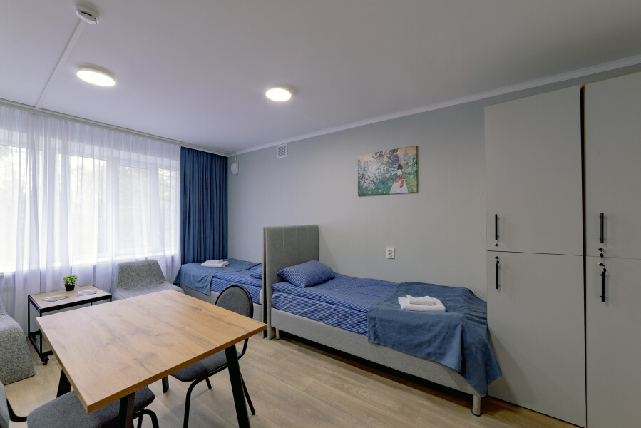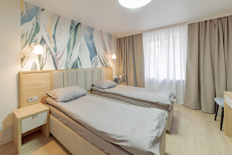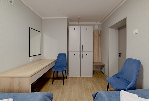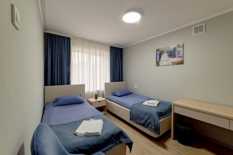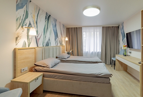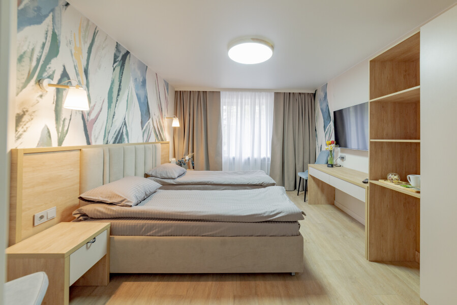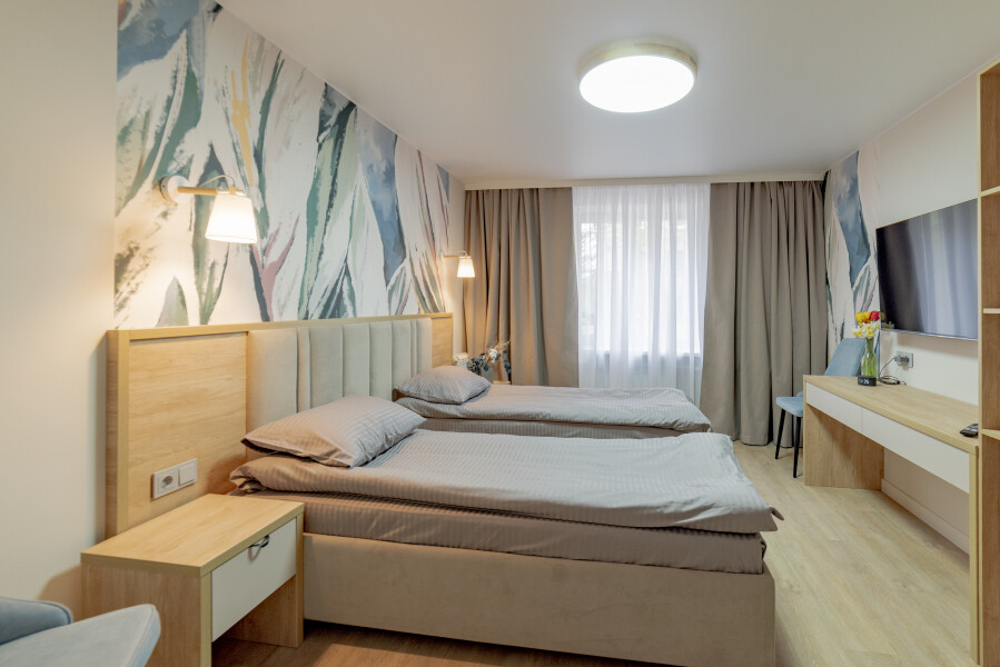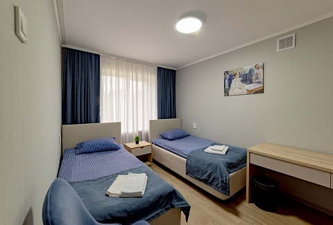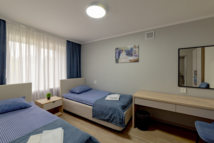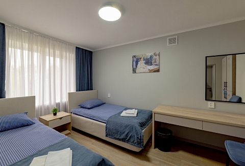 В номере: зеркало, кровати односпальные, прикроватные тумбочки, стол, стулья, шкаф, кондиционер, телевизор ЖК, электрочайник