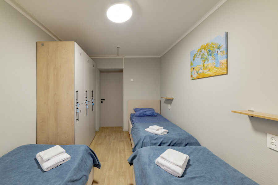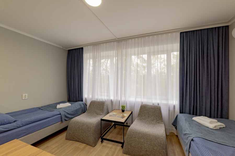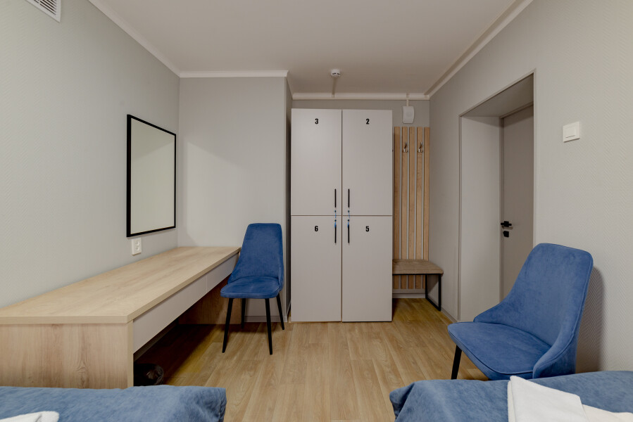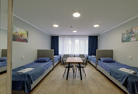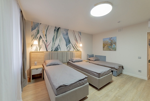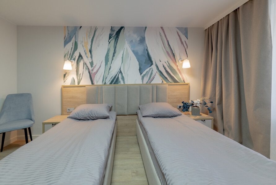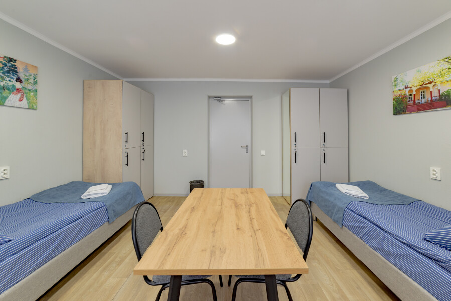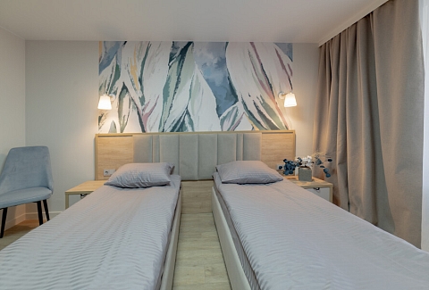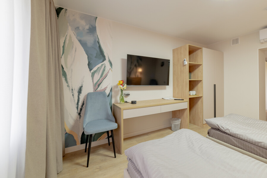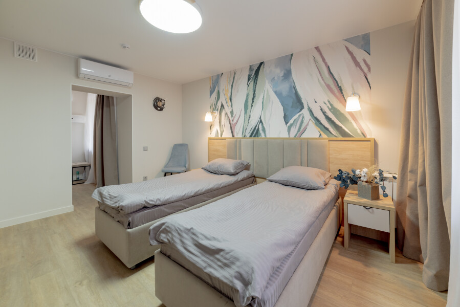 В номере: зеркало, кровати односпальные, прикроватные тумбочки, стол, стулья, шкаф, кондиционер, телевизор ЖК, электрочайник