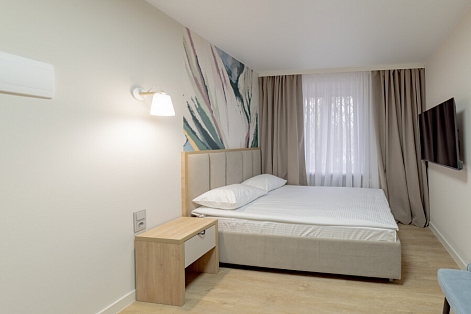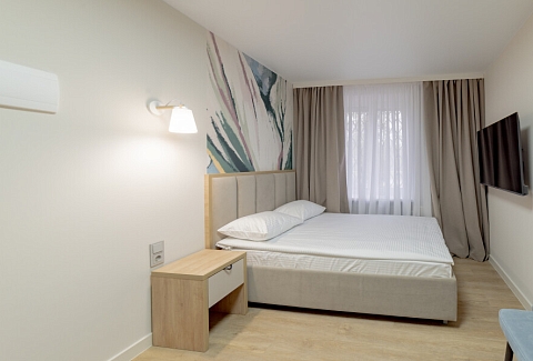 В номере: зеркало, кровать двуспальная, прикроватные тумбочки, стол, стулья, шкаф, кондиционер, телевизор ЖК, электрочайник
