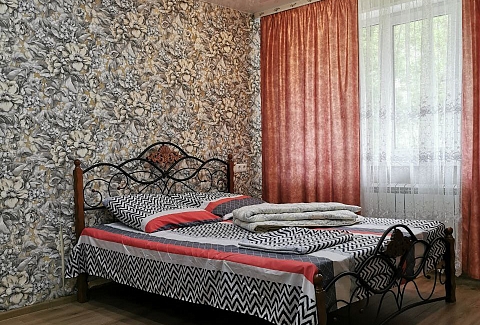 В номере: диван, зеркало, кровать двуспальная, стол, стулья, шкаф, микроволновая печь, набор посуды, плита газовая, стиральная машина, сушилка для белья, телевизор ЖК, утюг, холодильник, чайный набор посуды, электрочайник