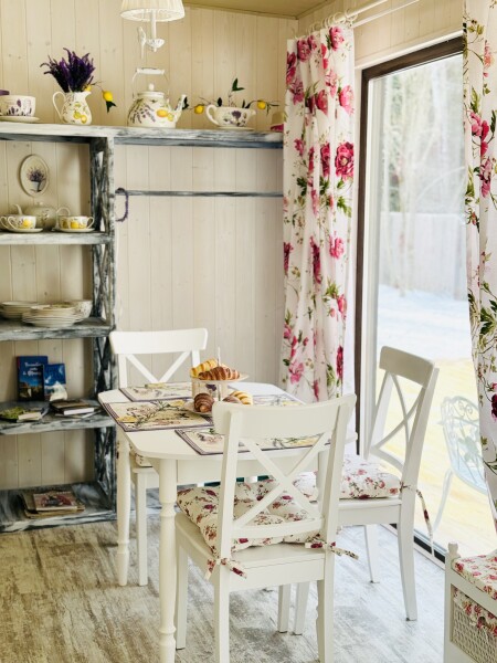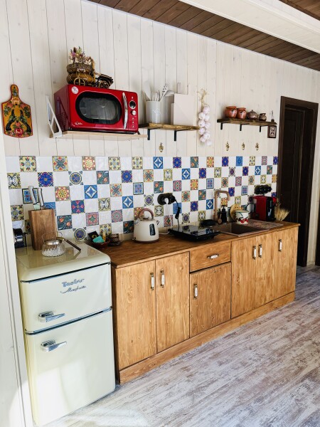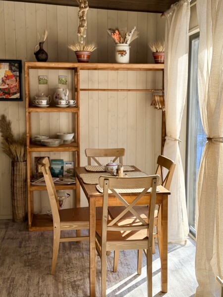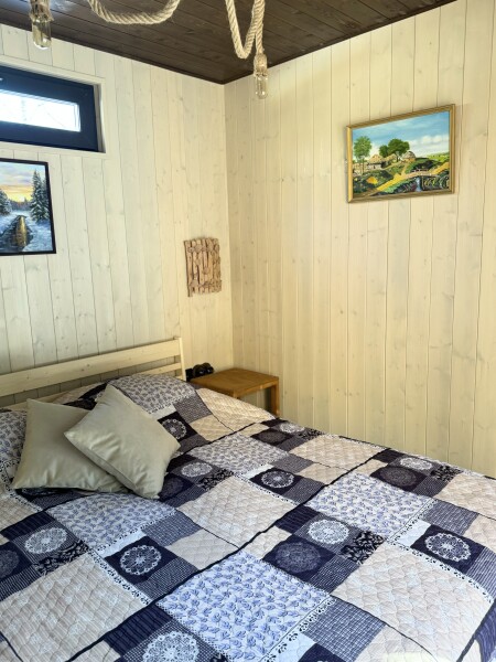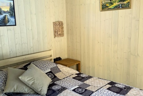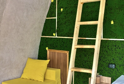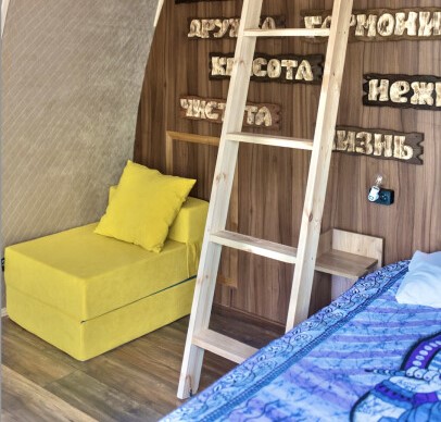 В номере: вешалка, зеркало, кровать двуспальная, кровать двухъярусная, прикроватные тумбочки, стол, стулья, шкаф, кофемашина, микроволновая печь, набор посуды, плита электрическая, холодильник, электрочайник