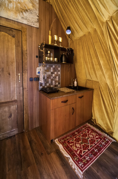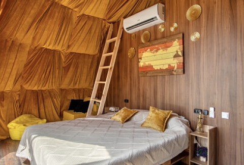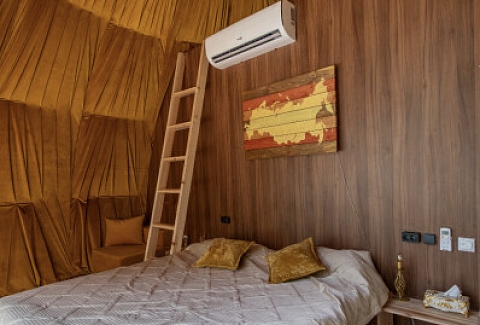В номере: вешалка, зеркало, кровать двуспальная, прикроватные тумбочки, стол, стулья, шкаф, кондиционер, кофемашина, плита электрическая, теплый пол, холодильник, электрочайник