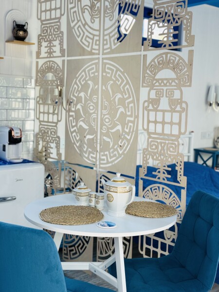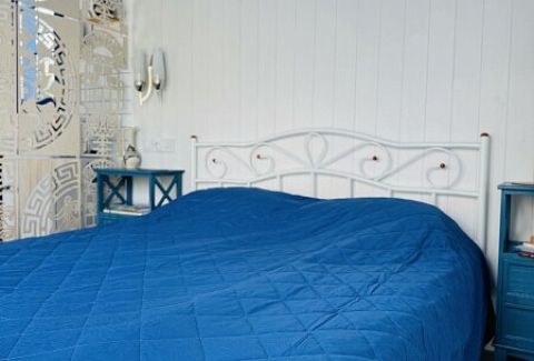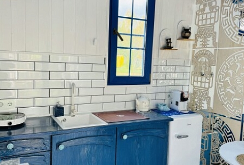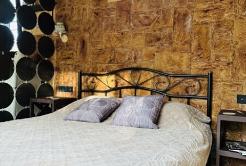 В номере: вешалка, зеркало, кровать двуспальная, прикроватные тумбочки, стол, стулья, шкаф, кондиционер, кофемашина, набор посуды, плита электрическая, теплый пол, холодильник, электрочайник