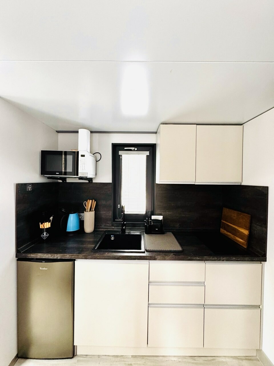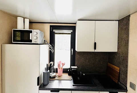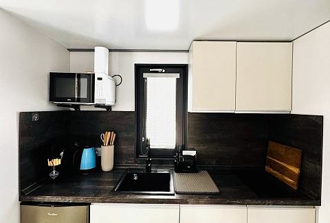 В номере: диван, зеркало, кровать двуспальная, стол, стулья, шкаф, кондиционер, микроволновая печь, мини-холодильник, набор посуды, плита электрическая, телевизор ЖК, электрочайник