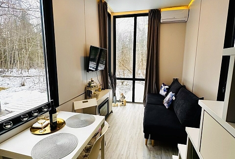 В номере: диван, зеркало, кровать двуспальная, стол, стулья, шкаф, кондиционер, микроволновая печь, мини-холодильник, набор посуды, телевизор ЖК, электрочайник