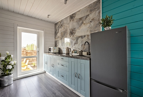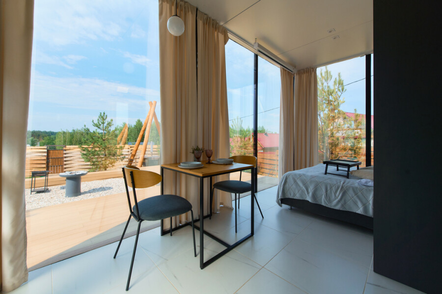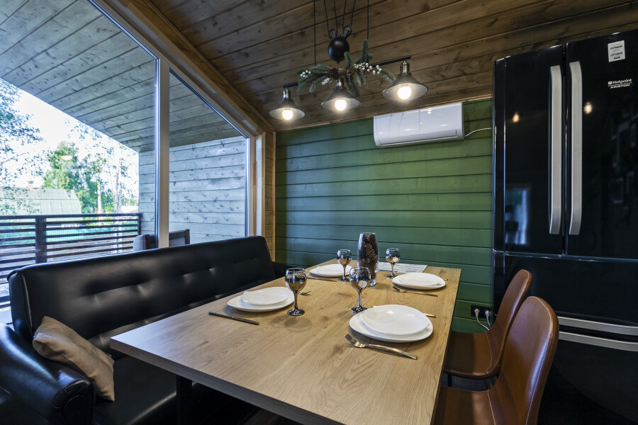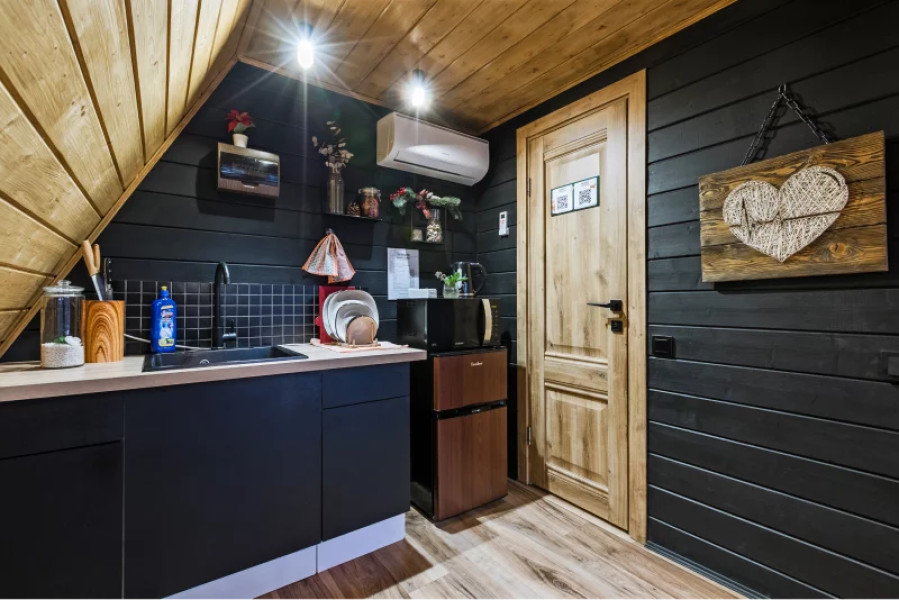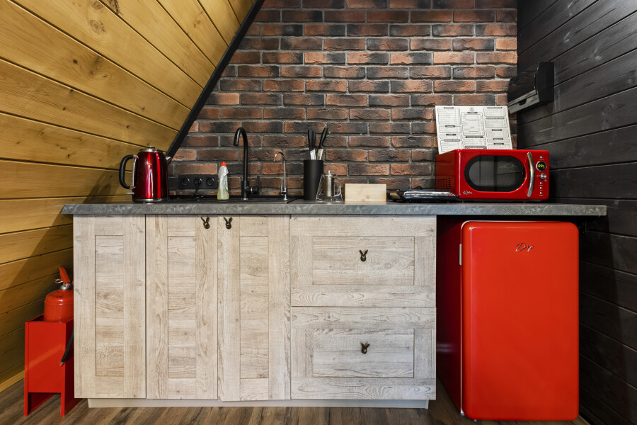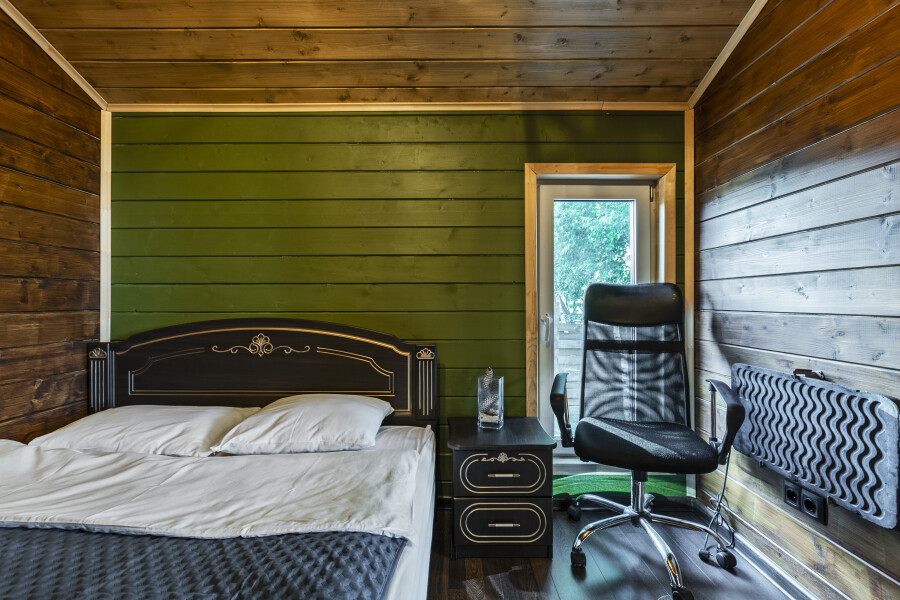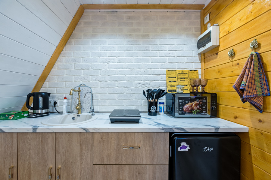 В номере: зеркало, кровать двуспальная, стол, стулья, шкаф, микроволновая печь, мини-холодильник, набор посуды, плита электрическая, телевизор ЖК, чайный набор посуды, электрочайник