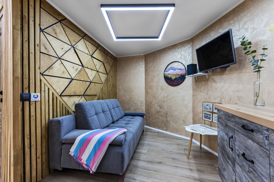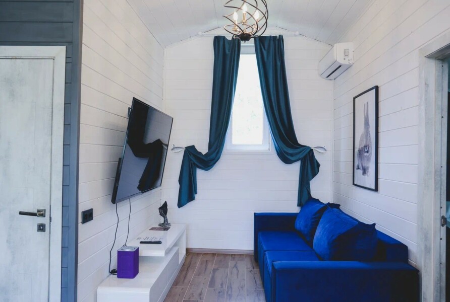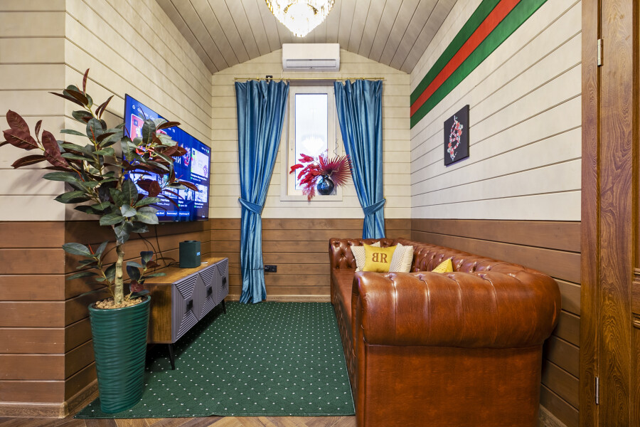 В номере: диван, зеркало, кровать двуспальная, стол, стулья, шкаф, кондиционер, микроволновая печь, мини-холодильник, плита электрическая, телевизор ЖК, чайный набор посуды, электрочайник