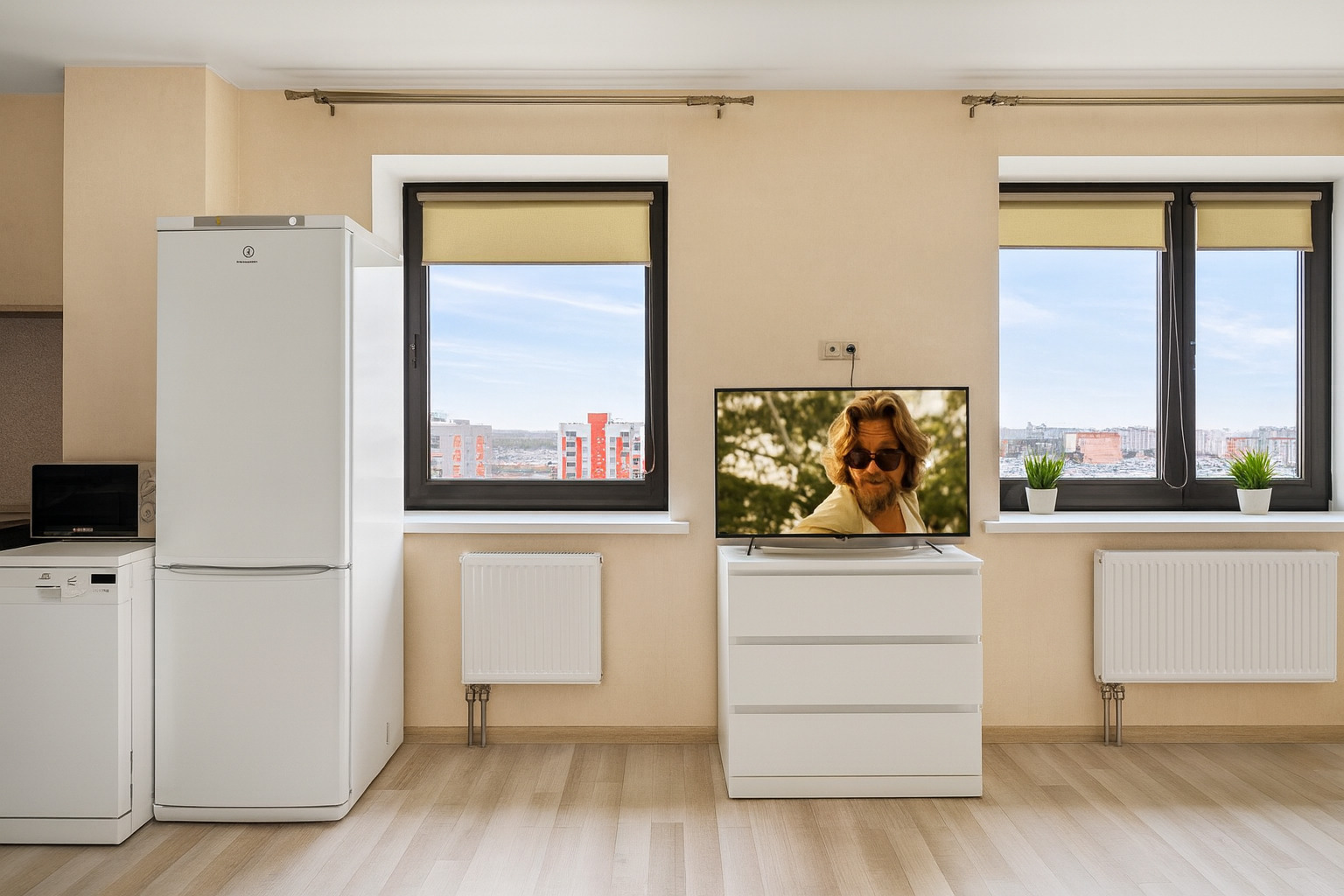 В номере: микроволновая печь, стиральная машина, телевизор, утюг, холодильник