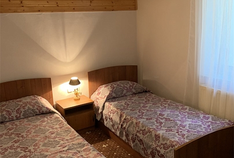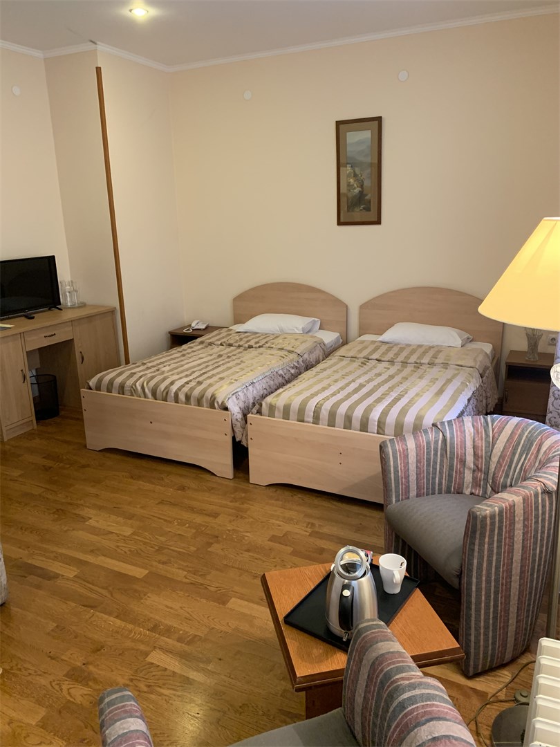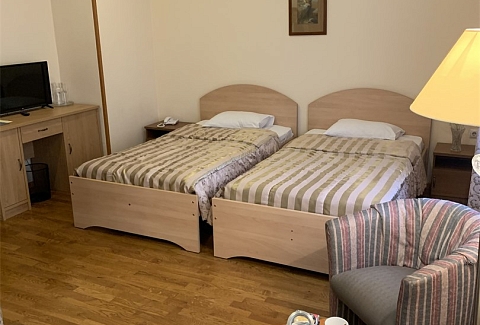 В номере: вешалка, зеркало, кровати односпальные /одна двуспальная кровать, прикроватные тумбочки, столик журнальный, стулья, тумба под телевизор, шкаф встроенный, набор посуды, телевизор, телефон, холодильник