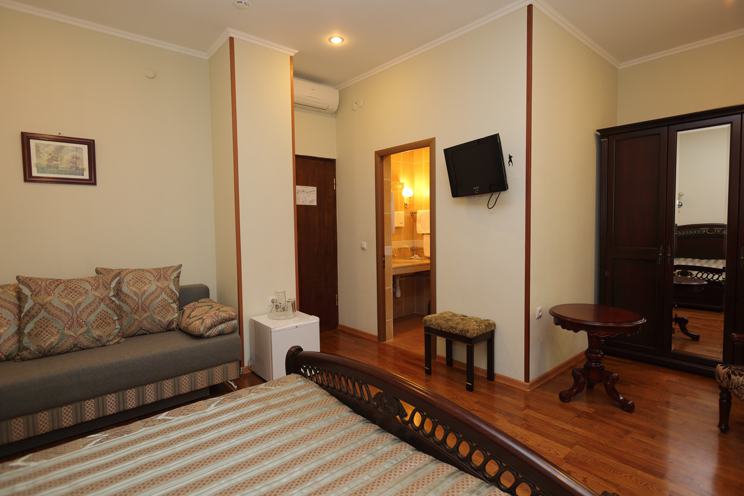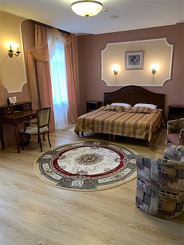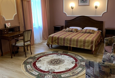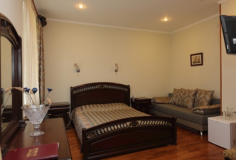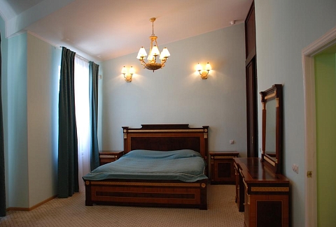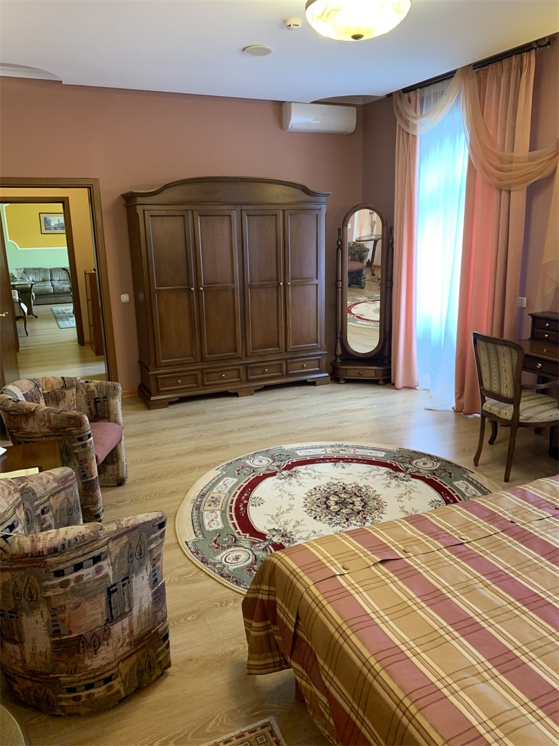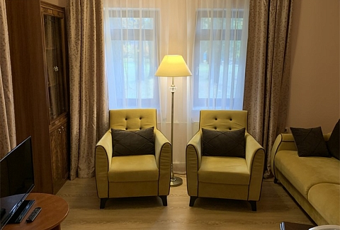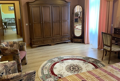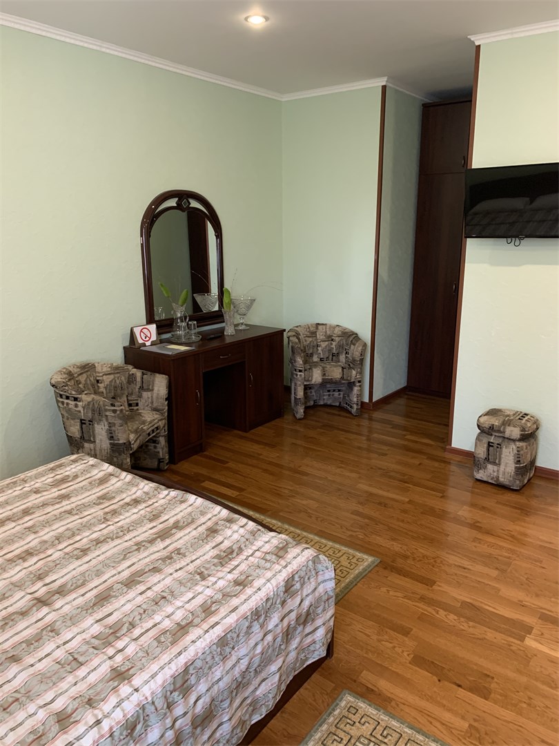 В номере: вешалка, диван, зеркало, кресла, кровать двуспальная, прикроватные тумбочки, стол, столик журнальный, столик туалетный, стулья, шкаф, шкаф для посуды, кондиционер, набор посуды, телевизор ЖК, телефон