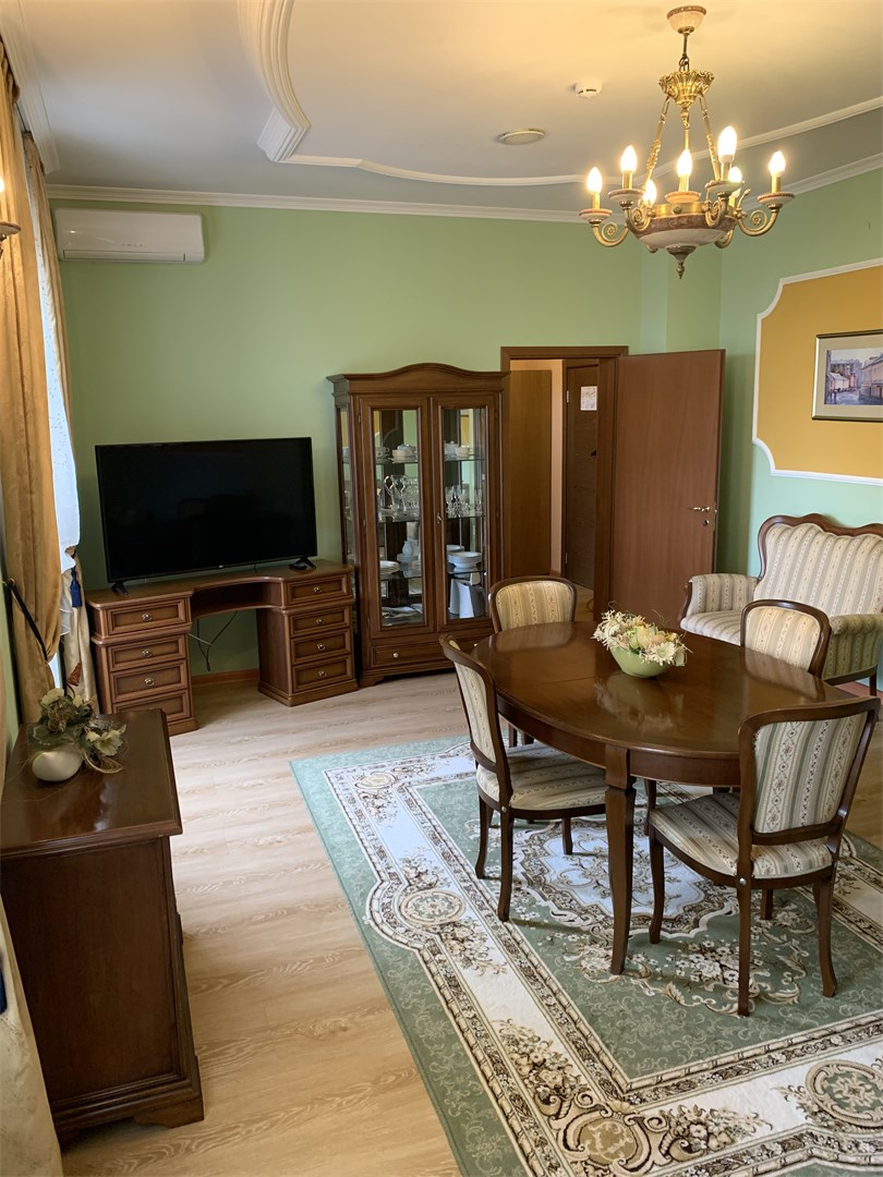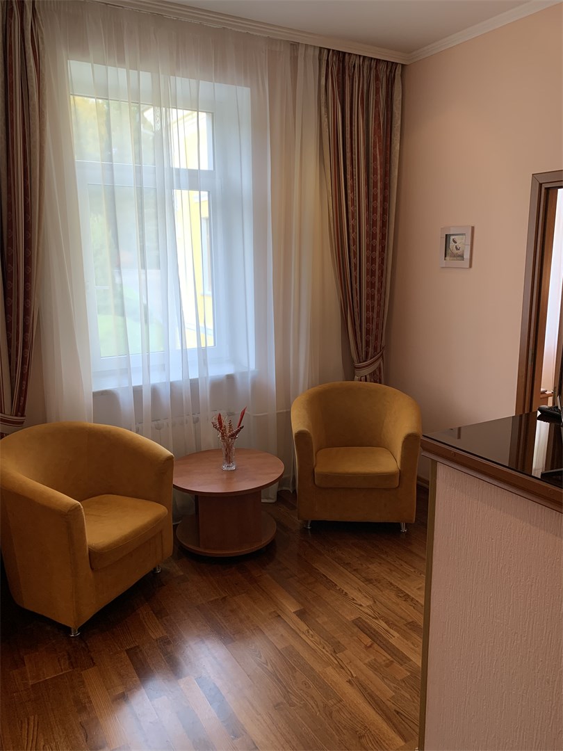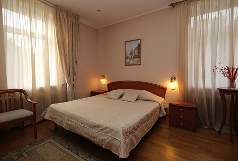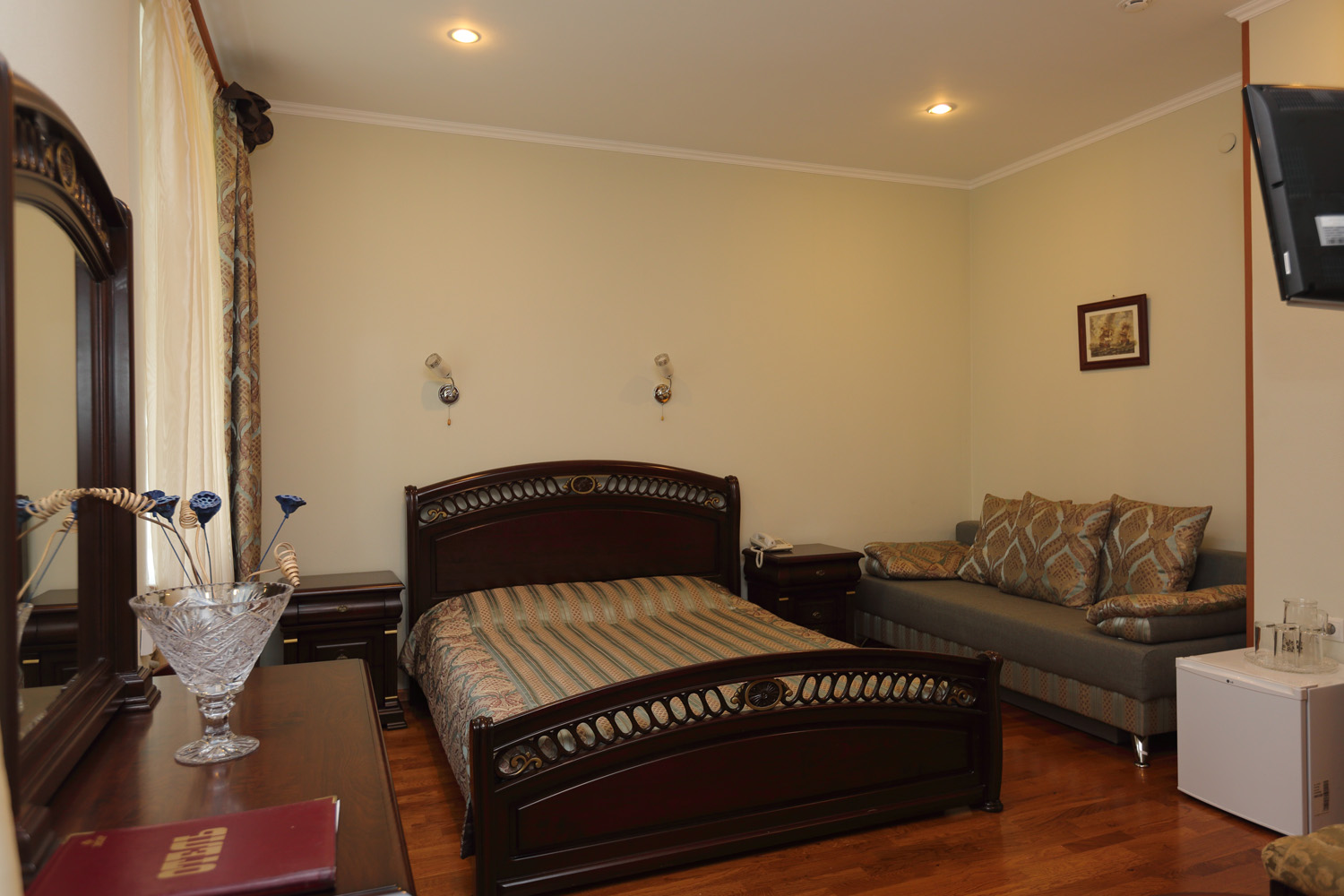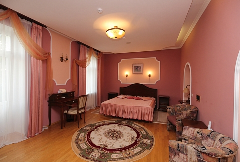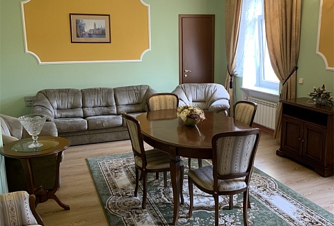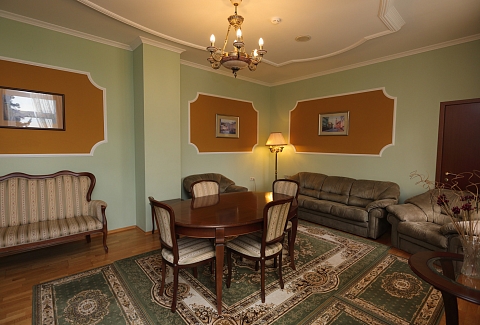 В номере: вешалка, диван, зеркало, кресла, кровать двуспальная, прикроватные тумбочки, стол, столик журнальный, столик туалетный, стулья, шкаф, шкаф для посуды, кондиционер, набор посуды, телевизор ЖК, телефон