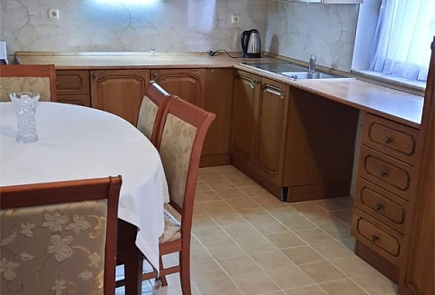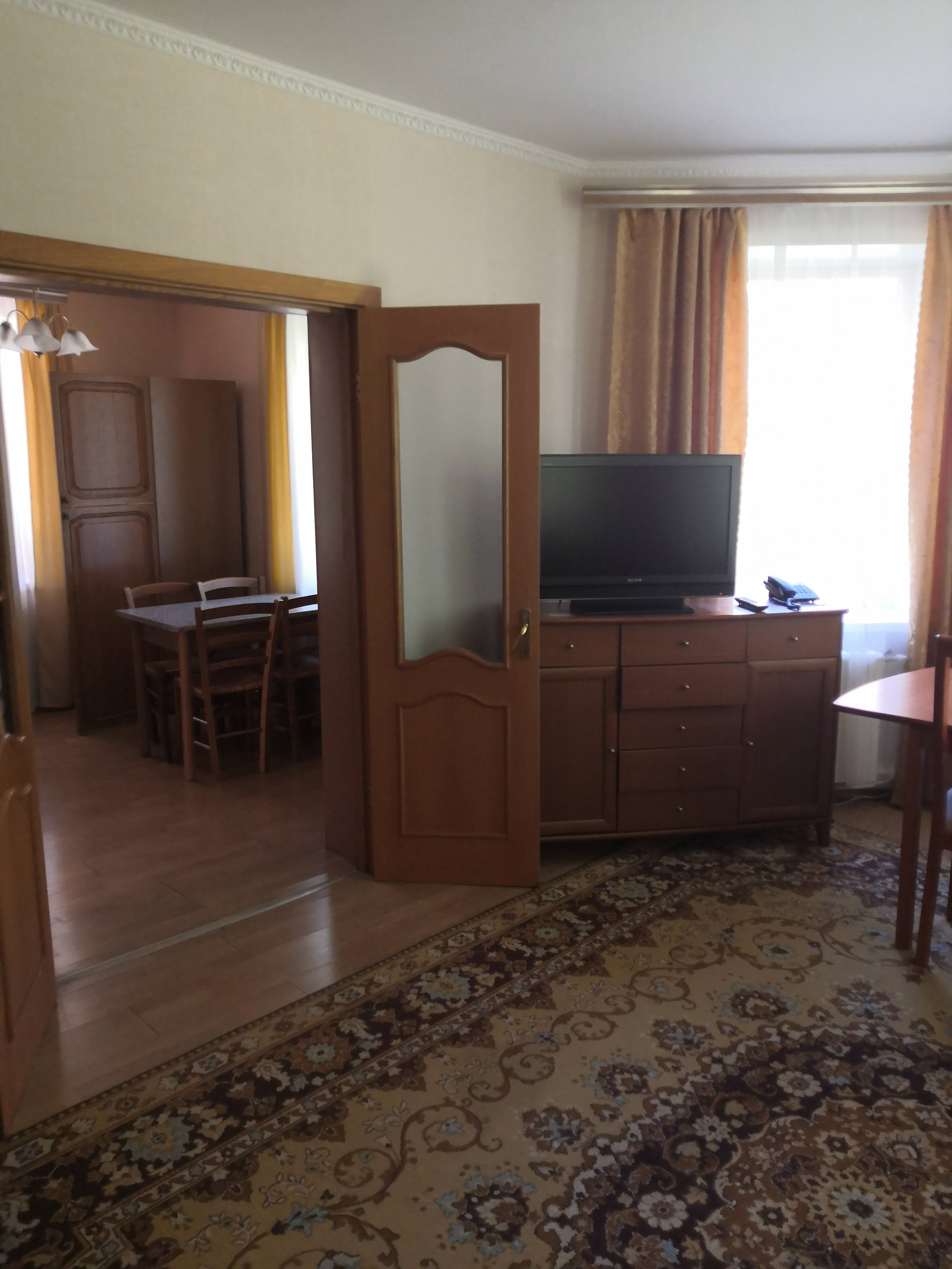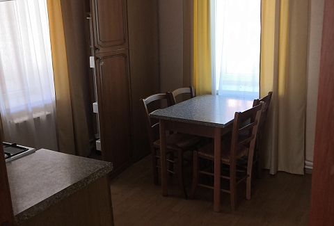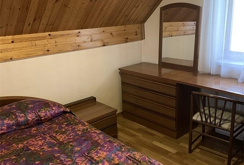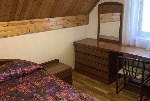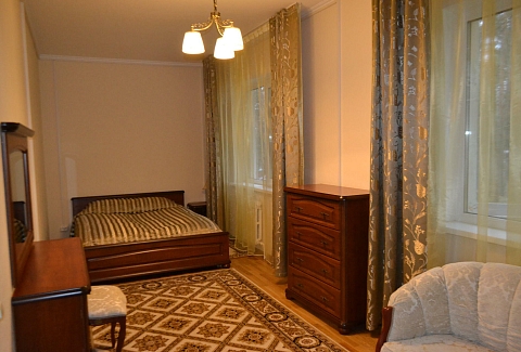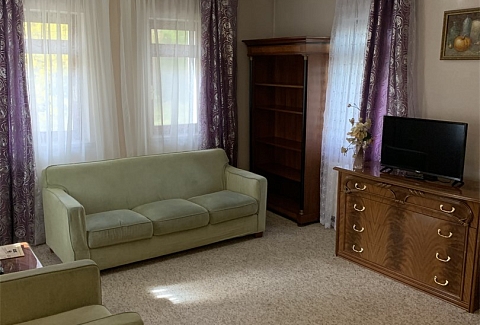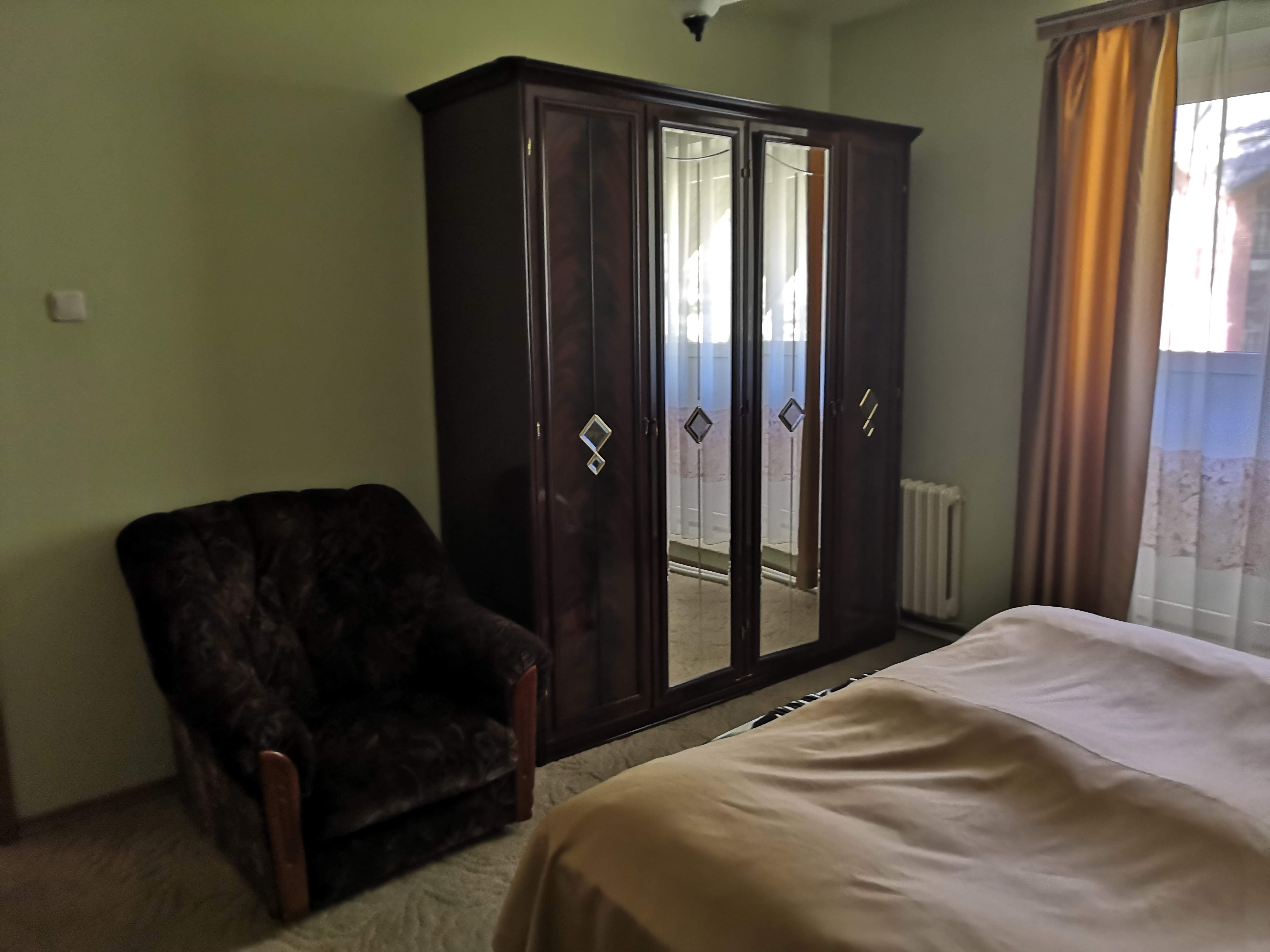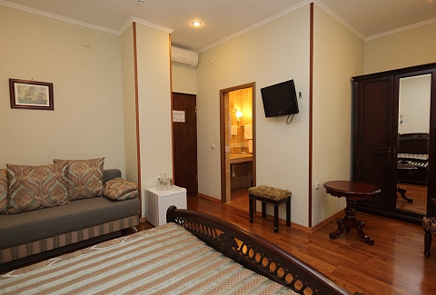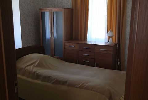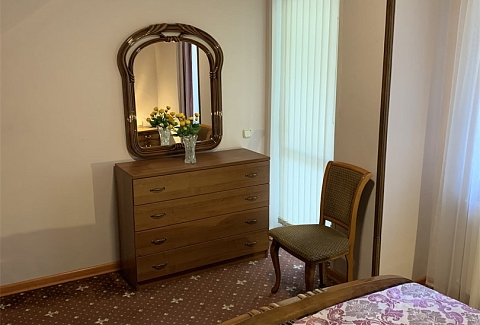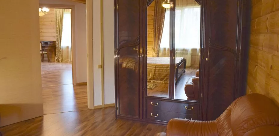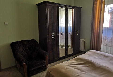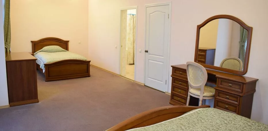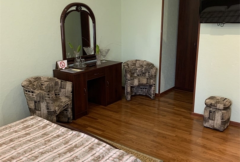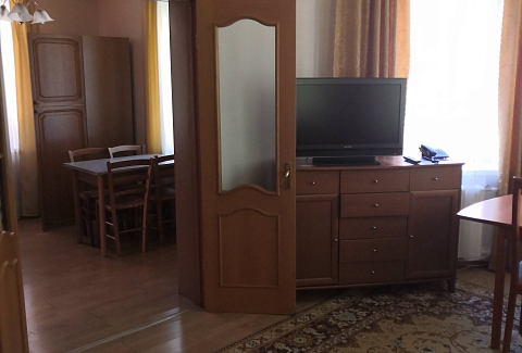 В номере: вешалка, диван, зеркало, кресло, кровать двуспальная, кровать односпальная, кухонная мебель, прикроватные тумбочки, стол, стол обеденный, стулья, шкаф, набор посуды, плита газовая, телевизор, телефон, холодильник