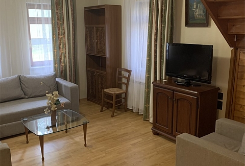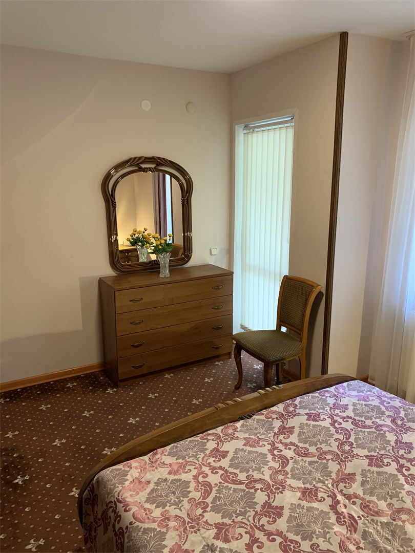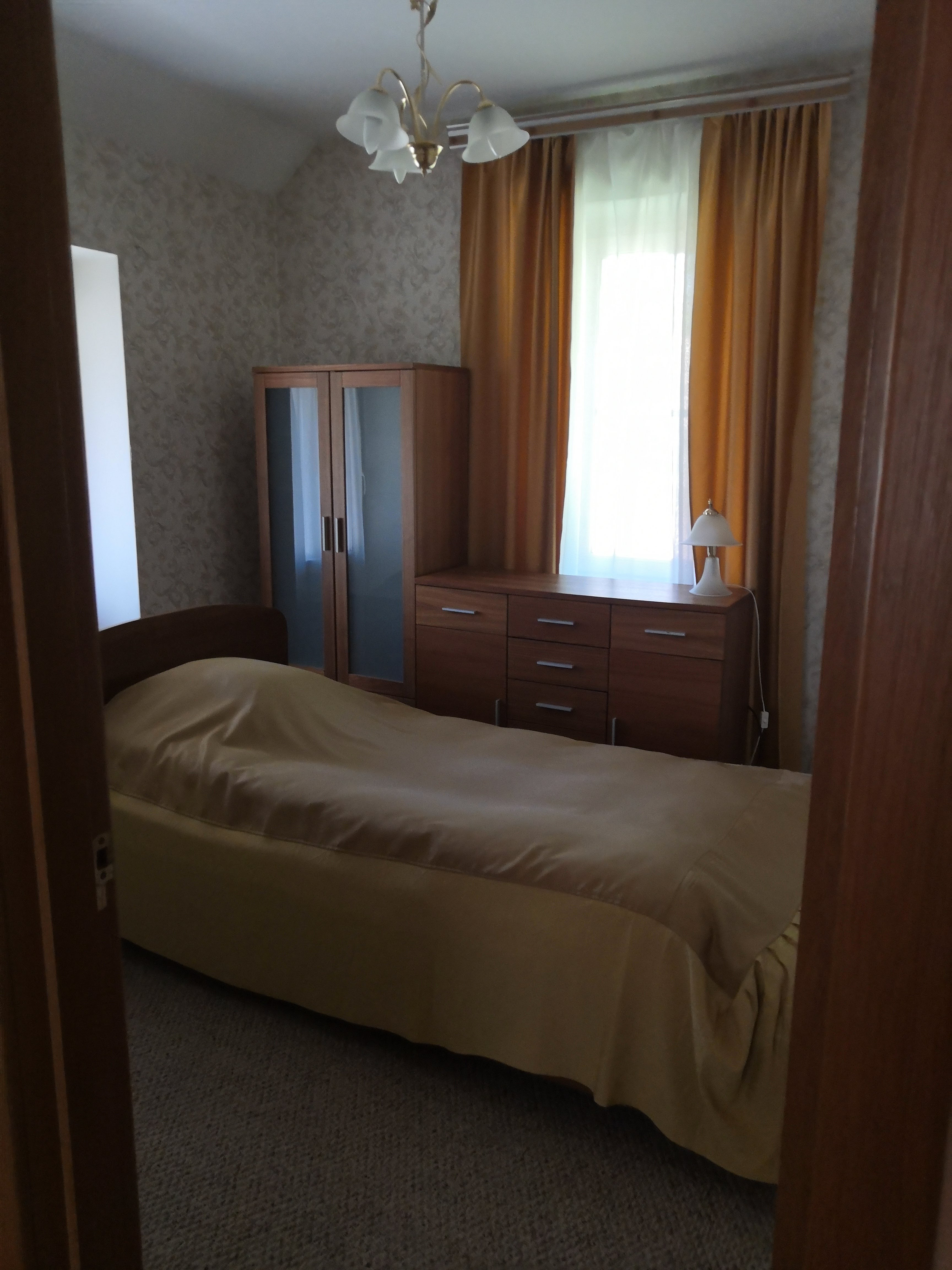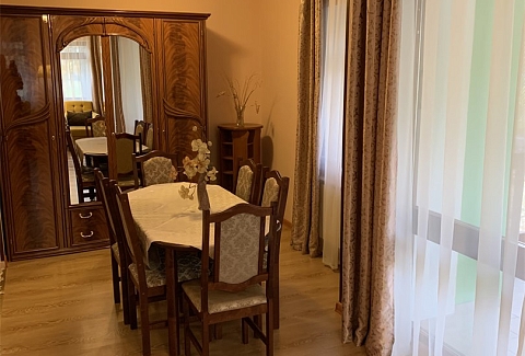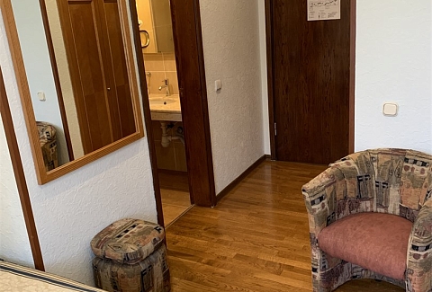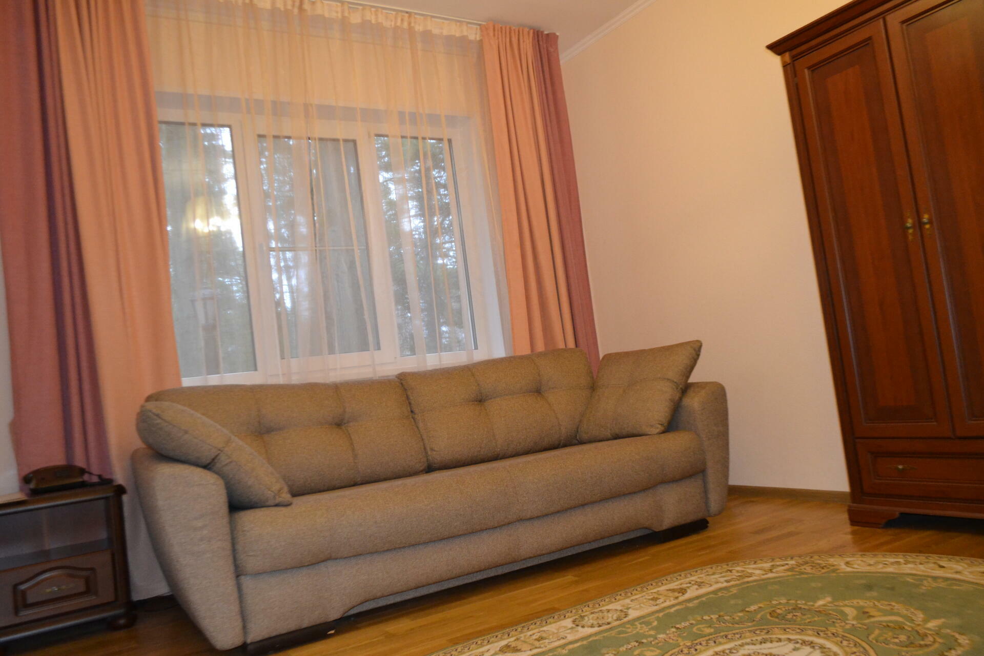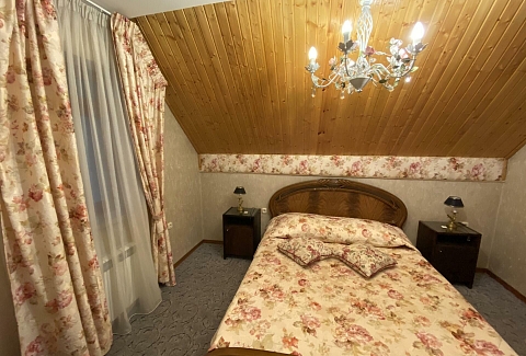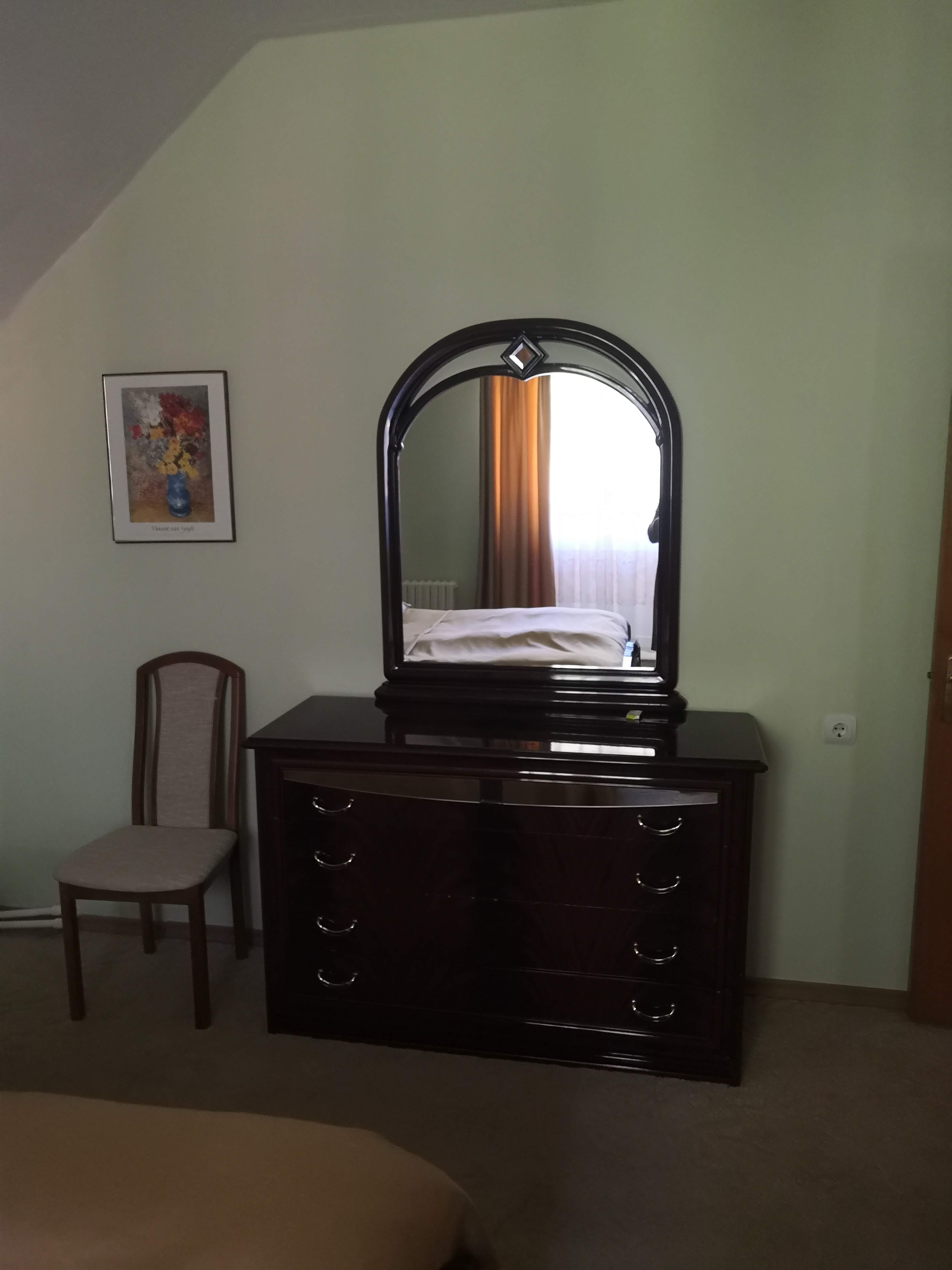 В номере: вешалка, диван, зеркало, кресло, кровать двуспальная, кровать односпальная, кухонная мебель, прикроватные тумбочки, стол, стол обеденный, стулья, шкаф, набор посуды, плита газовая, телевизор, телефон, холодильник