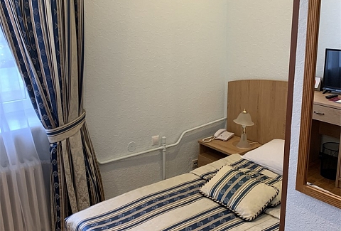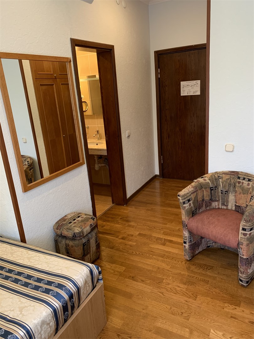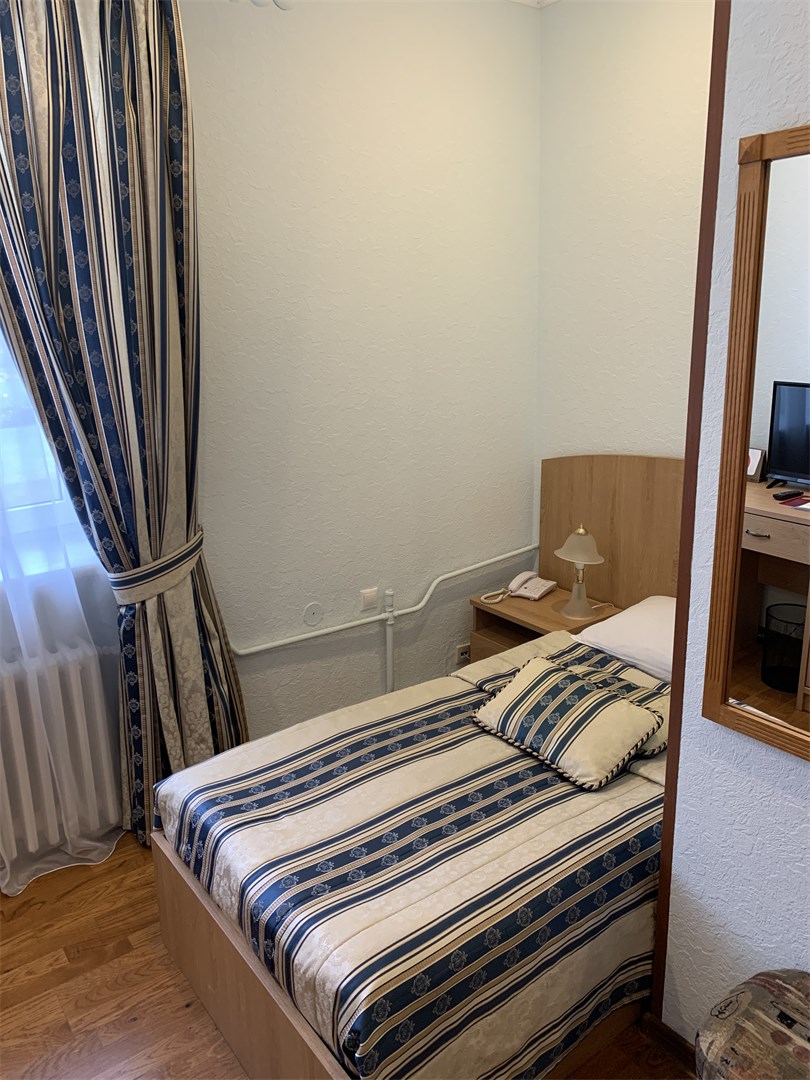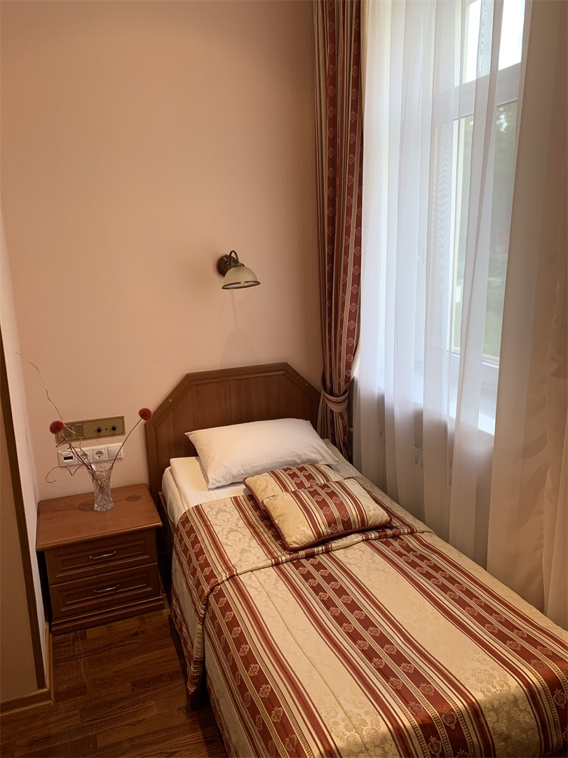 В номере: зеркало, кресло, кровать односпальная, прикроватная тумбочка, столик кофейный, шкаф, набор посуды, телевизор, телефон, холодильник