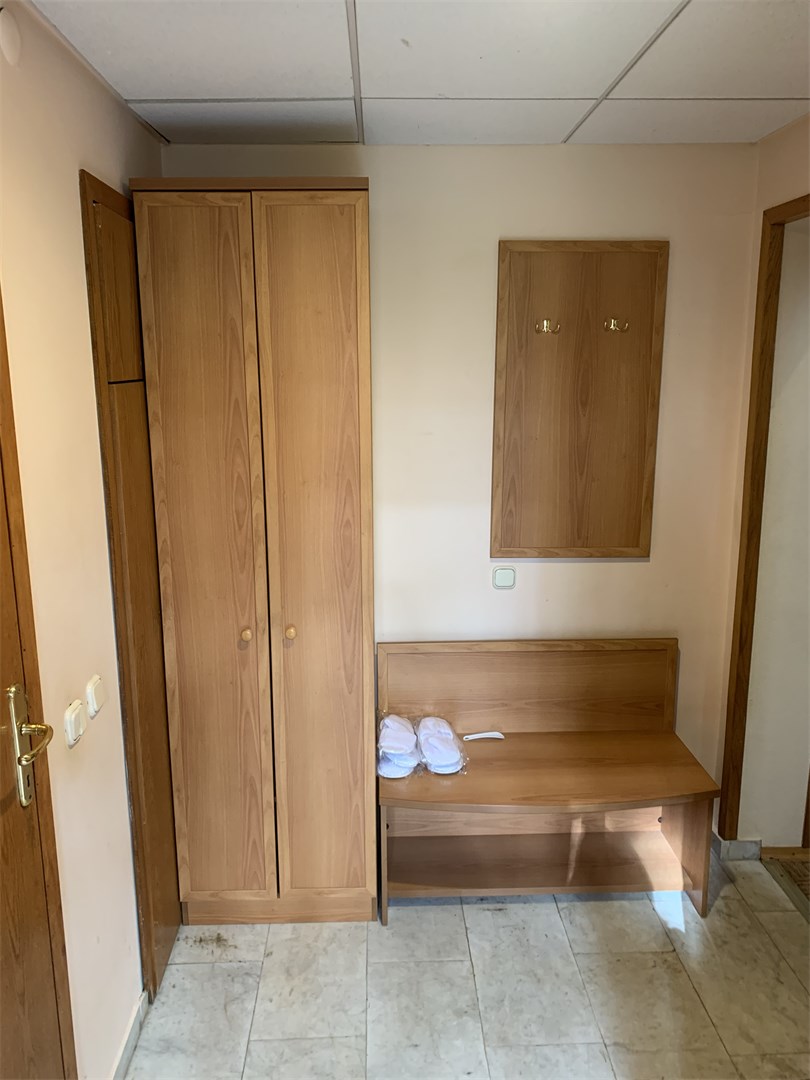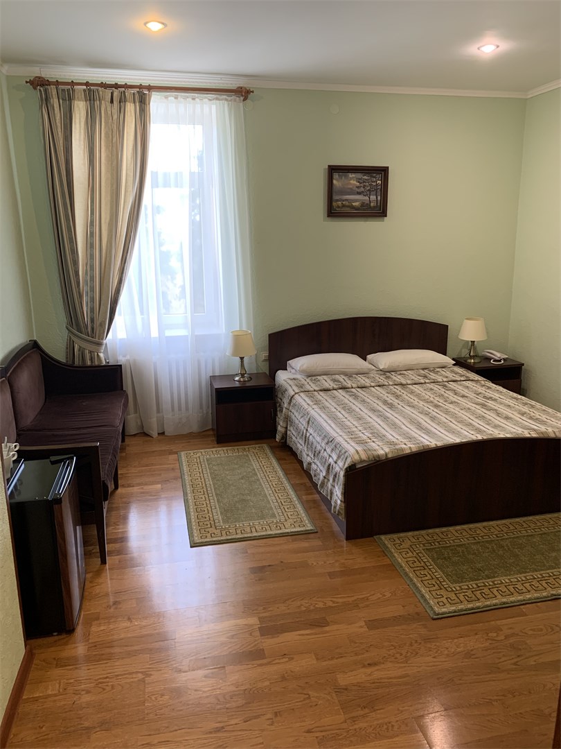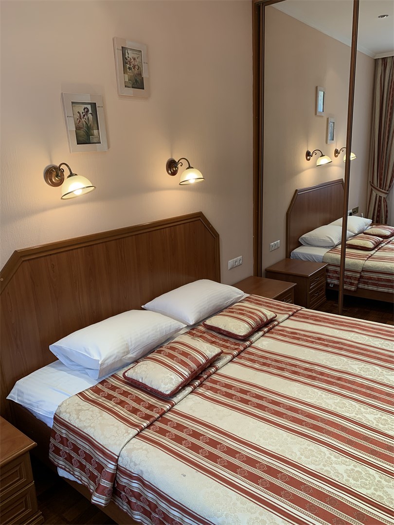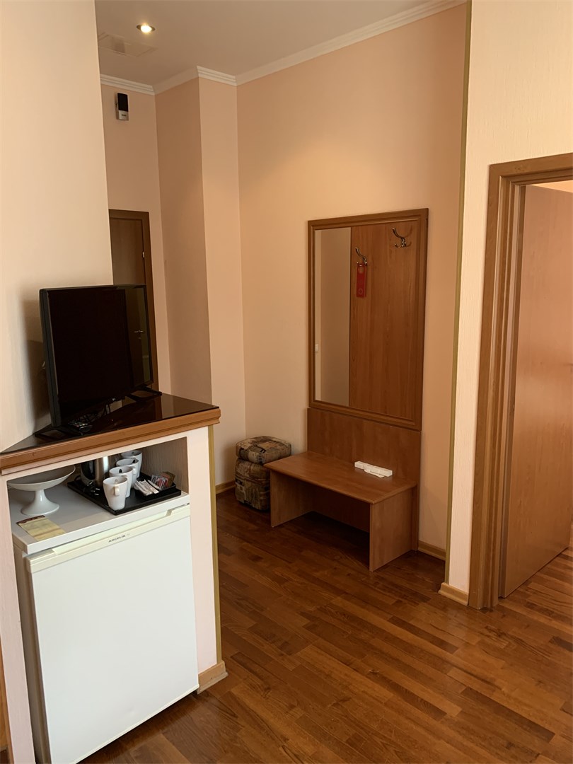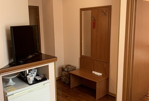В номере: вешалка, зеркало, кровать двуспальная, прикроватные тумбочки, столик журнальный, стулья, тумба под телевизор, шкаф, набор посуды, телевизор, телефон, холодильник