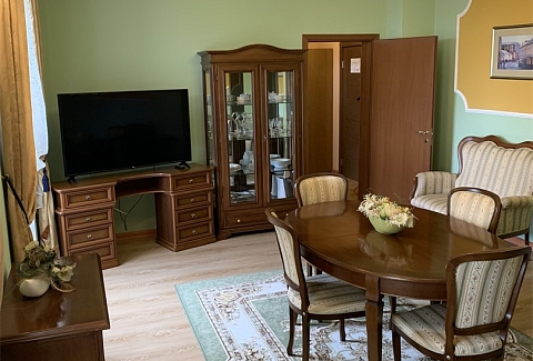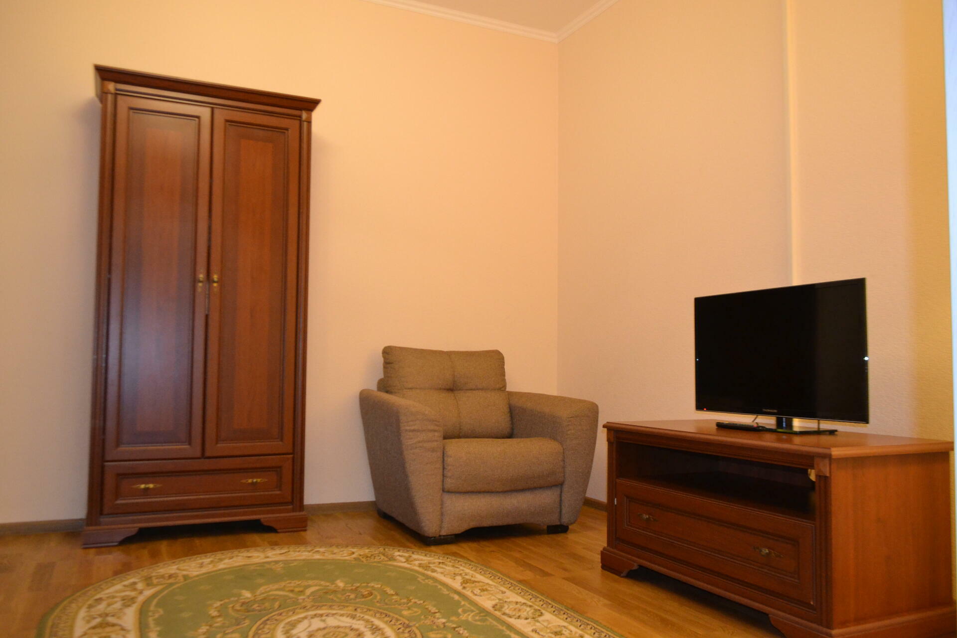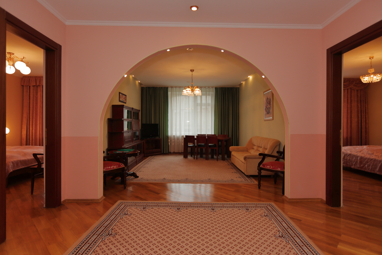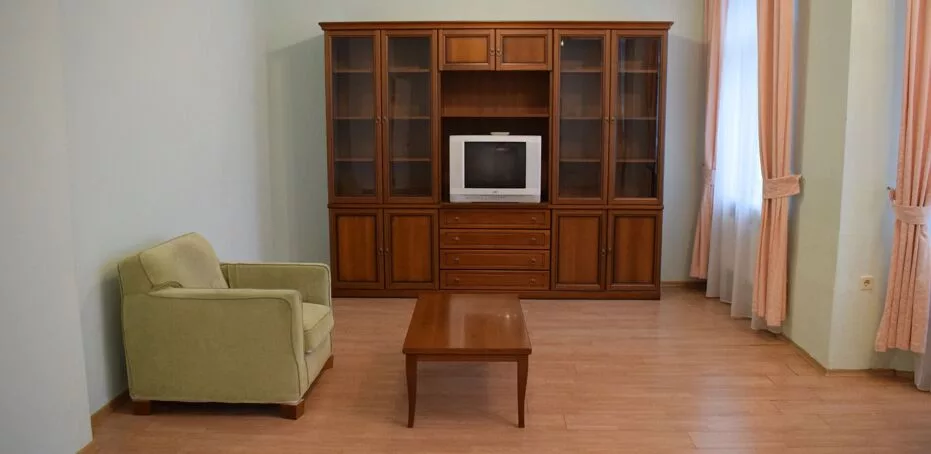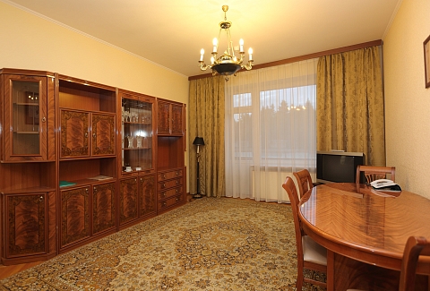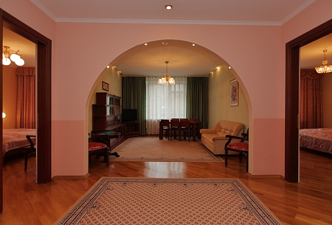 В номере: вешалка, диван, зеркало, кресла, кровать двуспальная, кровать односпальная, кухонная мебель, прикроватные тумбочки, стол, столик журнальный, стол обеденный, стулья, шкаф, микроволновая печь, набор посуды, плита электрическая, телевизор, телефон, холодильник, чайный набор посуды, электрочайник