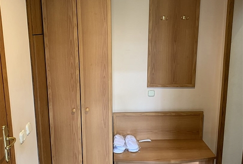 В номере: вешалка, зеркало, комод, кровати односпальные, кровать двуспальная, прикроватные тумбочки, стол, стулья, тумба, шкаф, кондиционер, набор посуды, телевизор, телефон