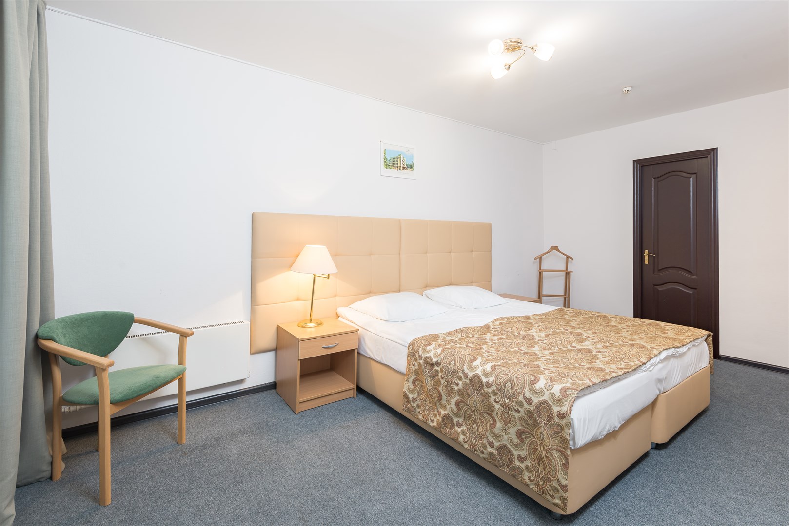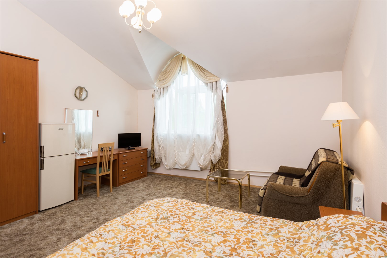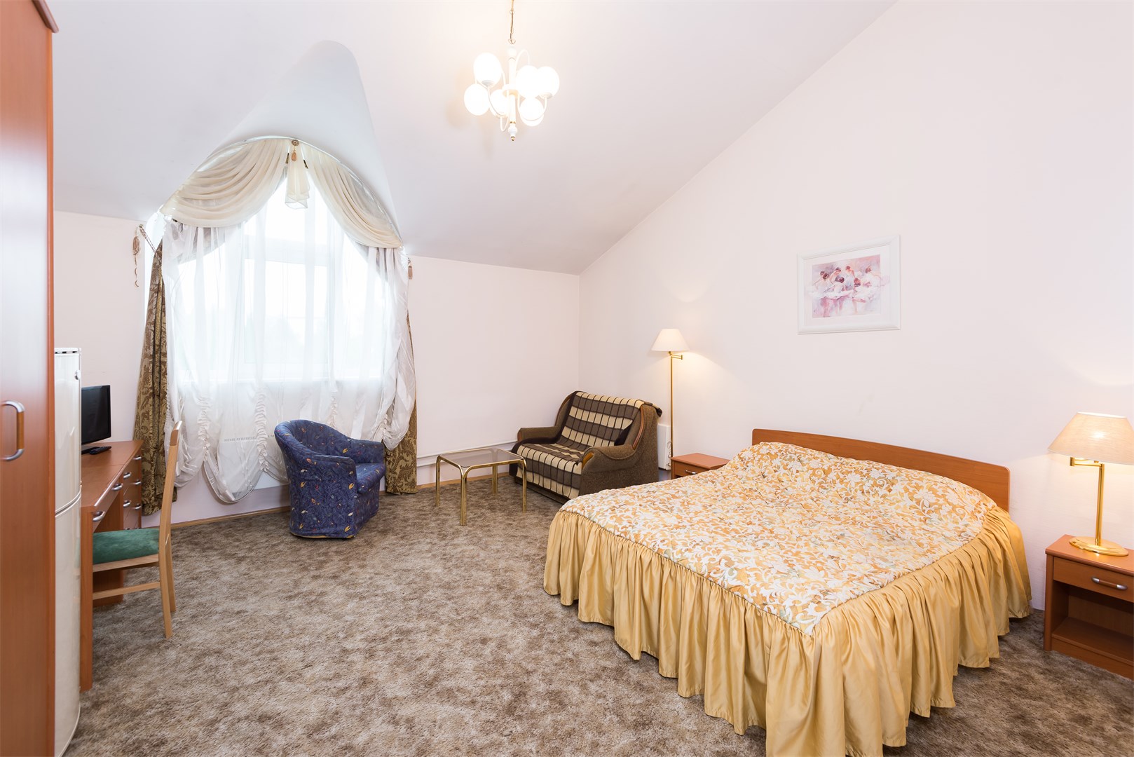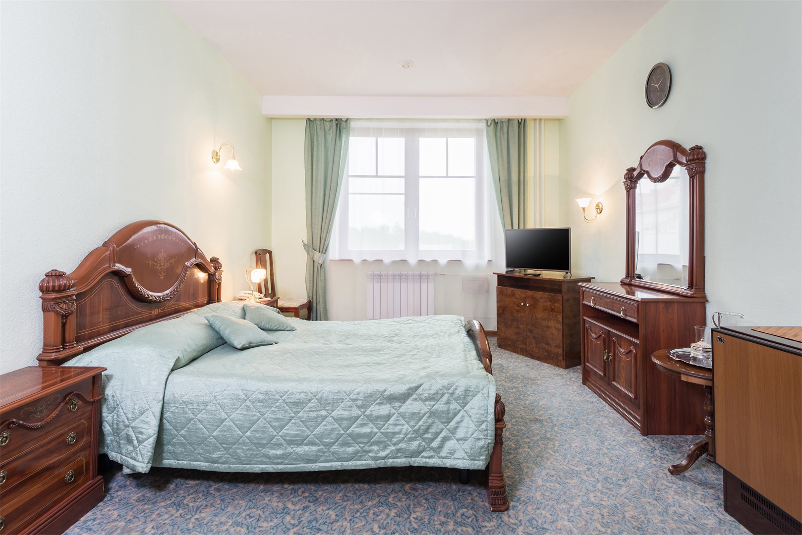 В номере: вешалка, зеркало, кровать двуспальная, прикроватные тумбочки, стол, стулья, шкаф, сейф, телевизор, телефон, холодильник, чайный набор посуды