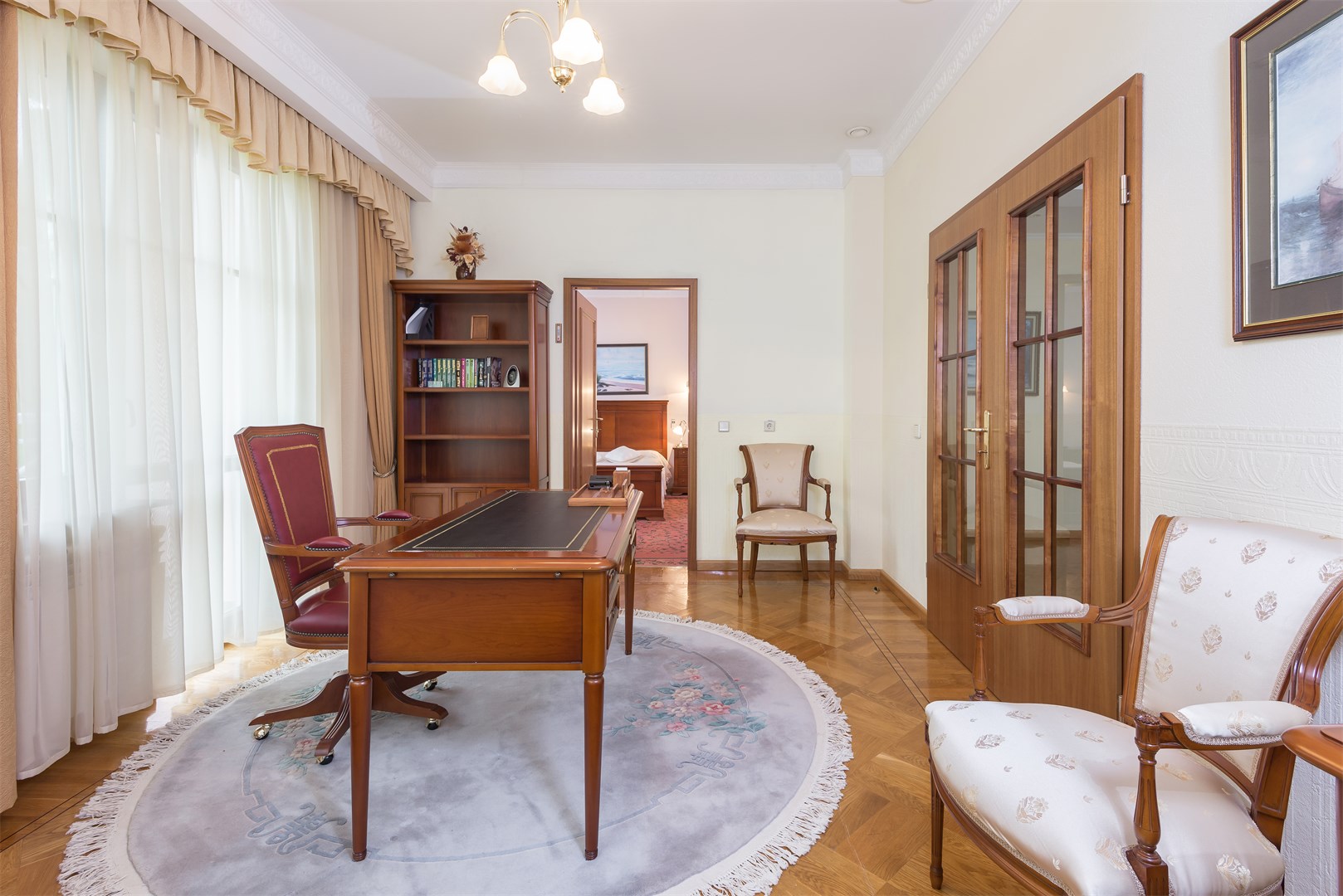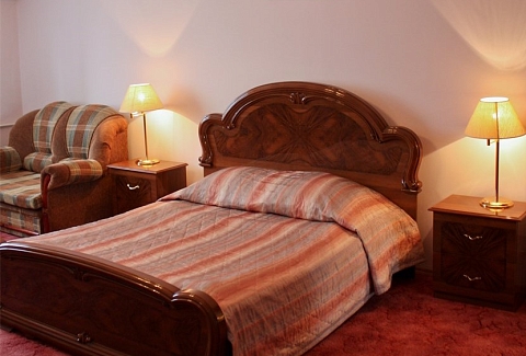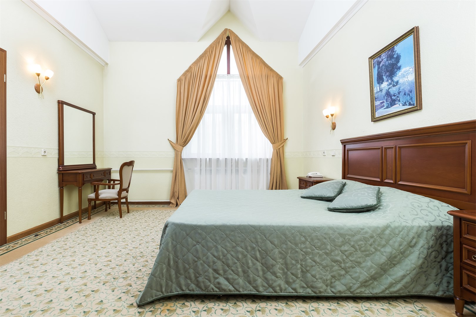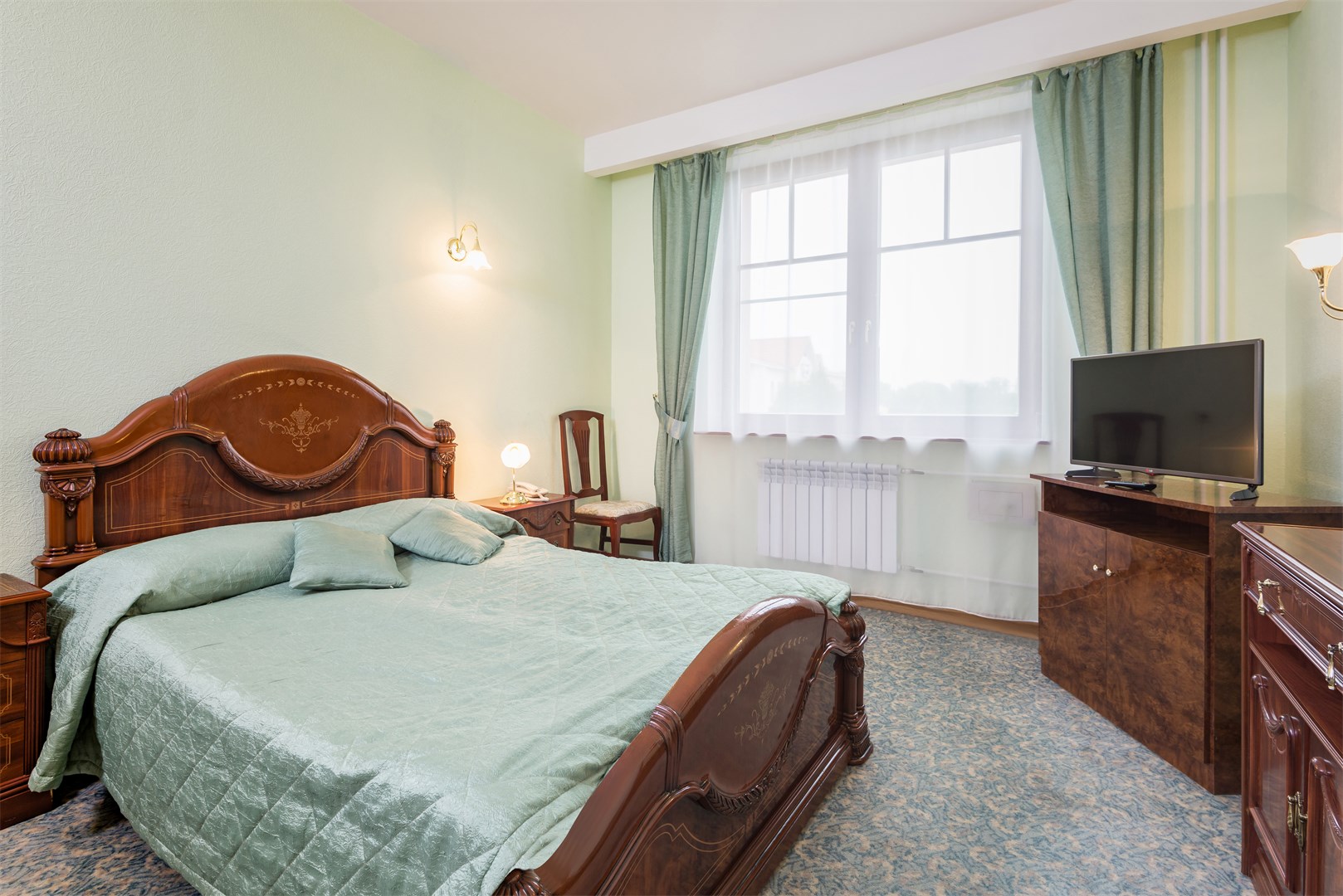 В номере: вешалка, зеркало, кровать двуспальная, прикроватные тумбочки, стол, стулья, шкаф, сейф, телевизор, телефон, холодильник, чайный набор посуды