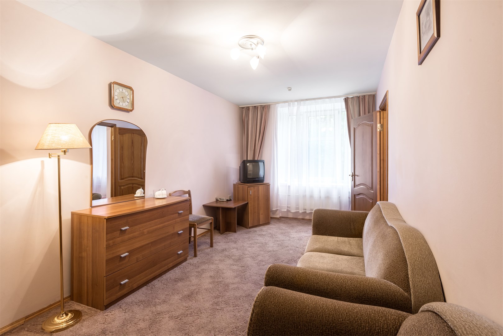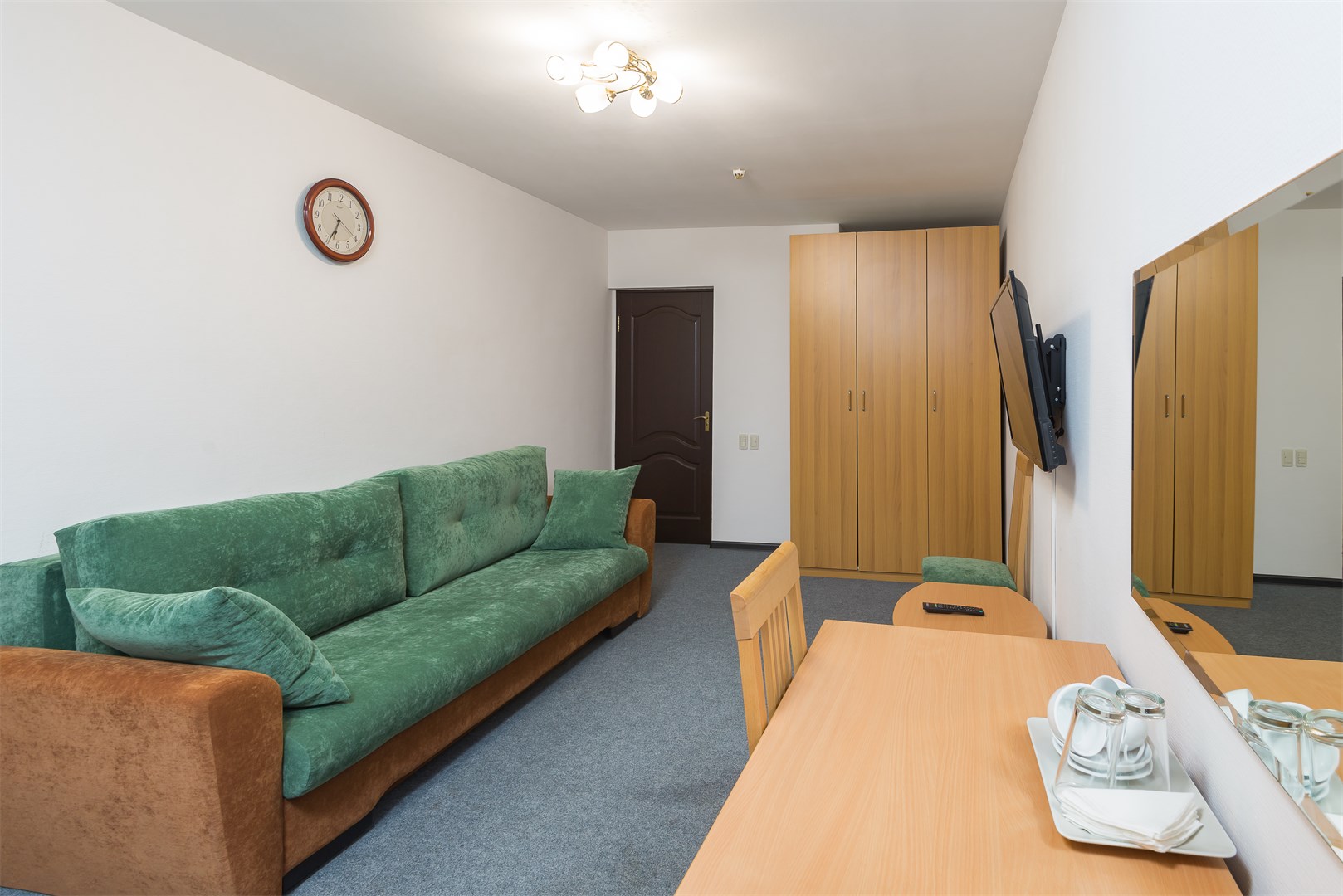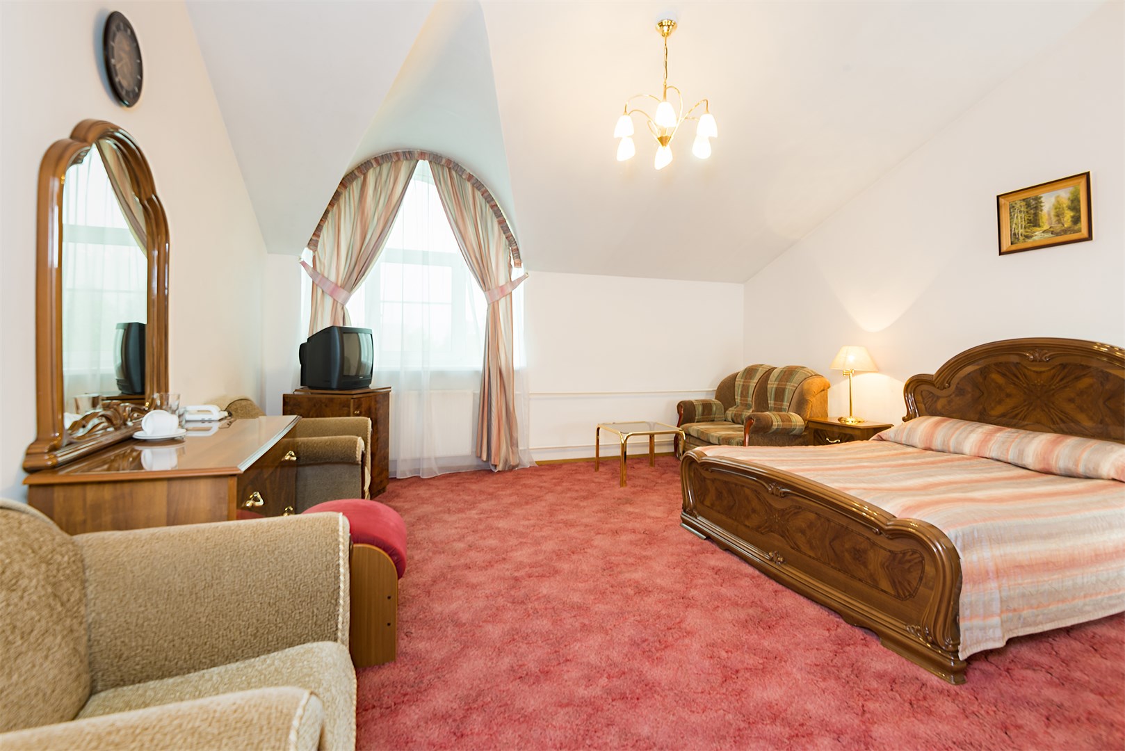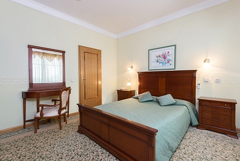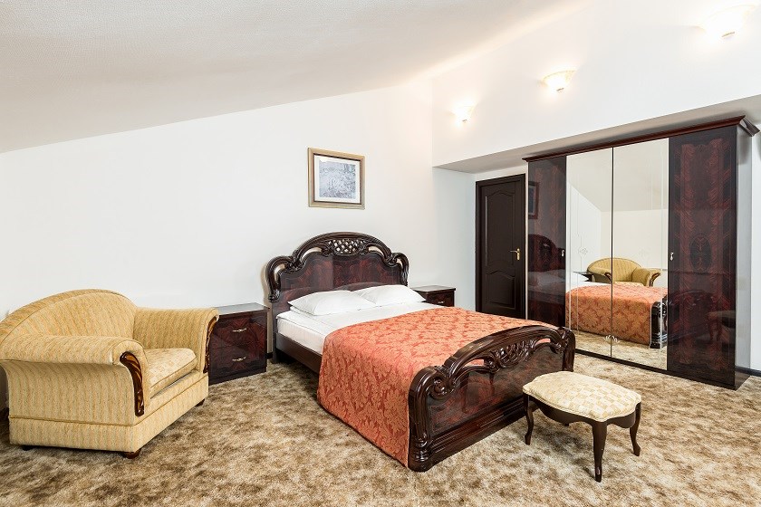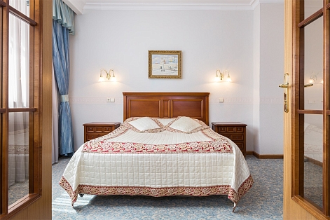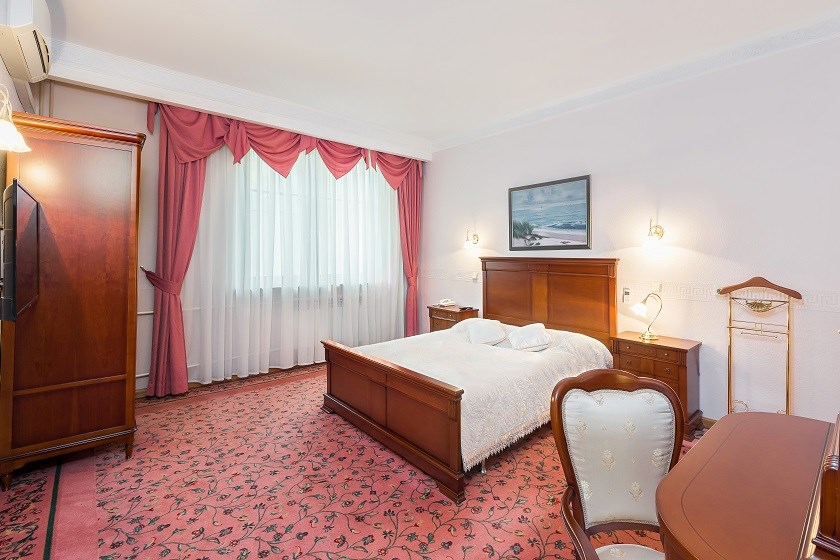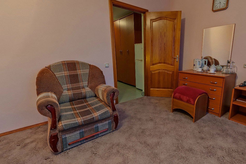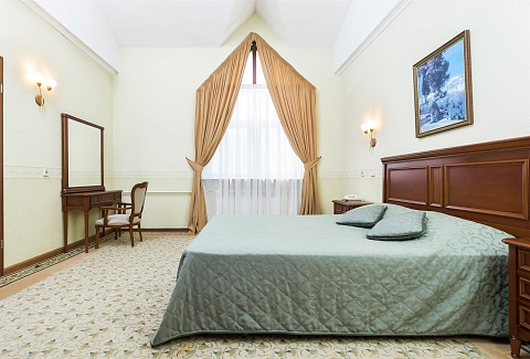 В номере: вешалка, зеркало, кровать двуспальная, набор мягкой мебели, стол, стулья, шкаф, сейф, телевизор, холодильник, чайный набор посуды, электрочайник