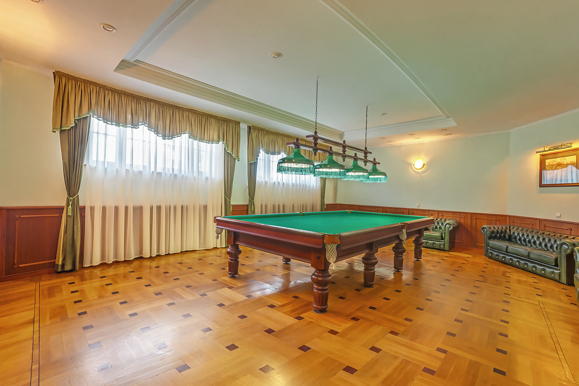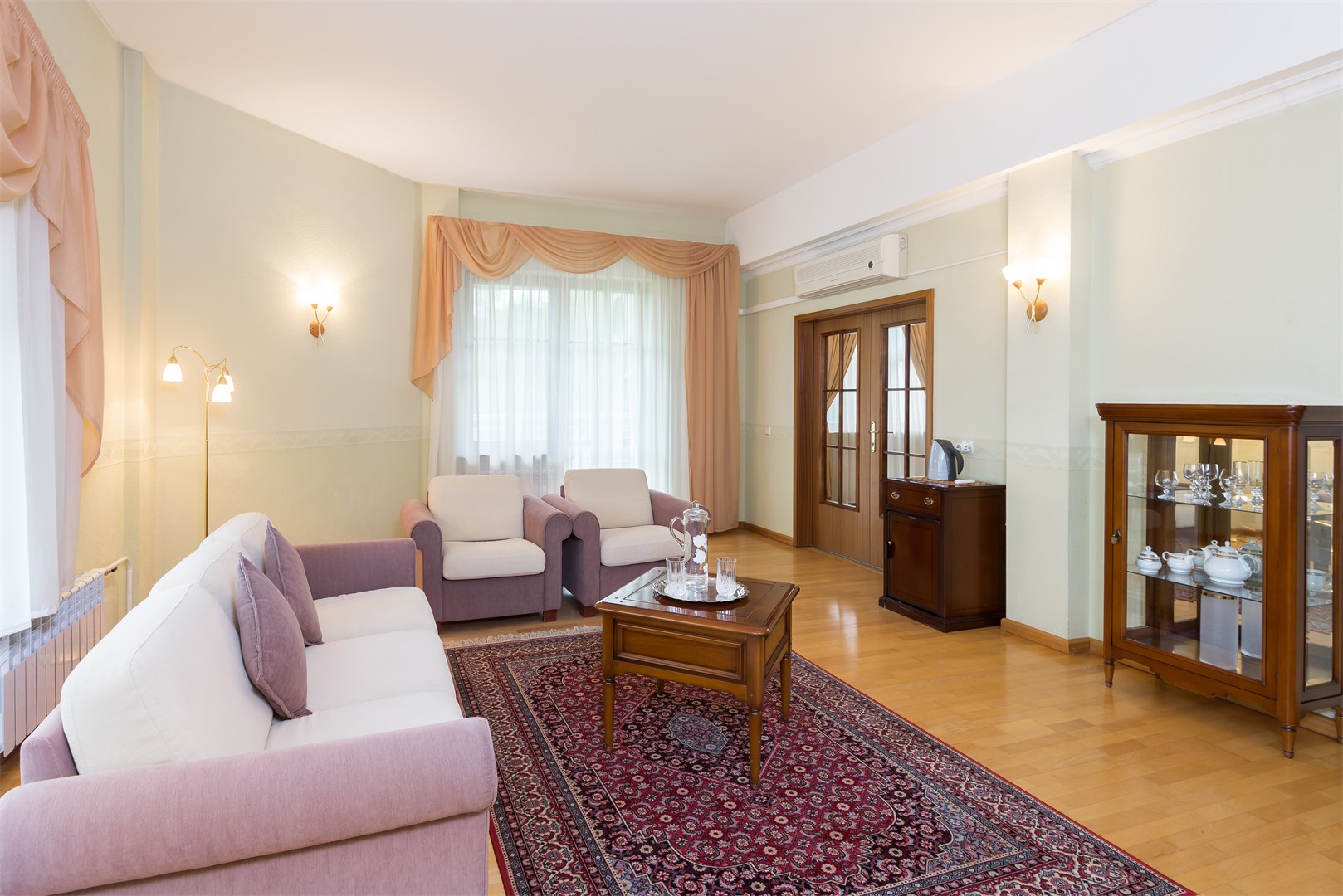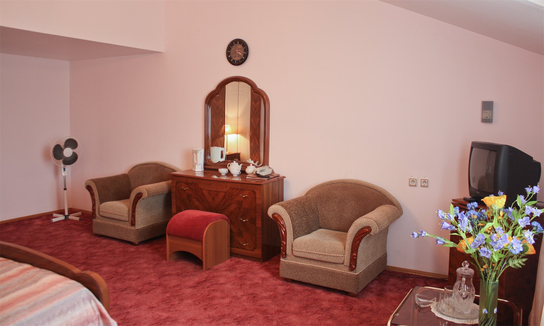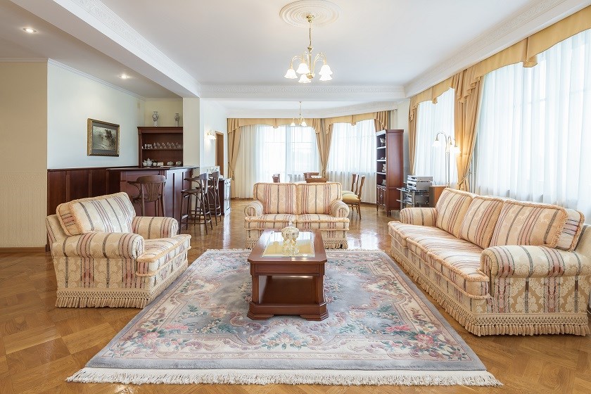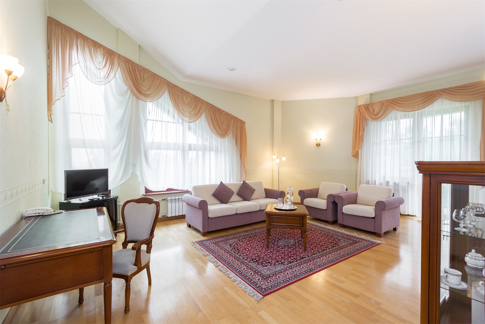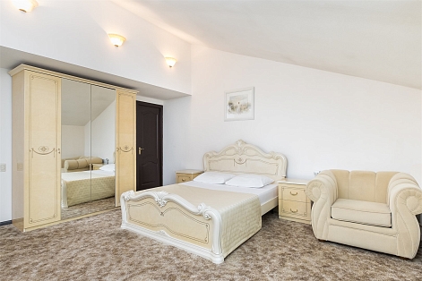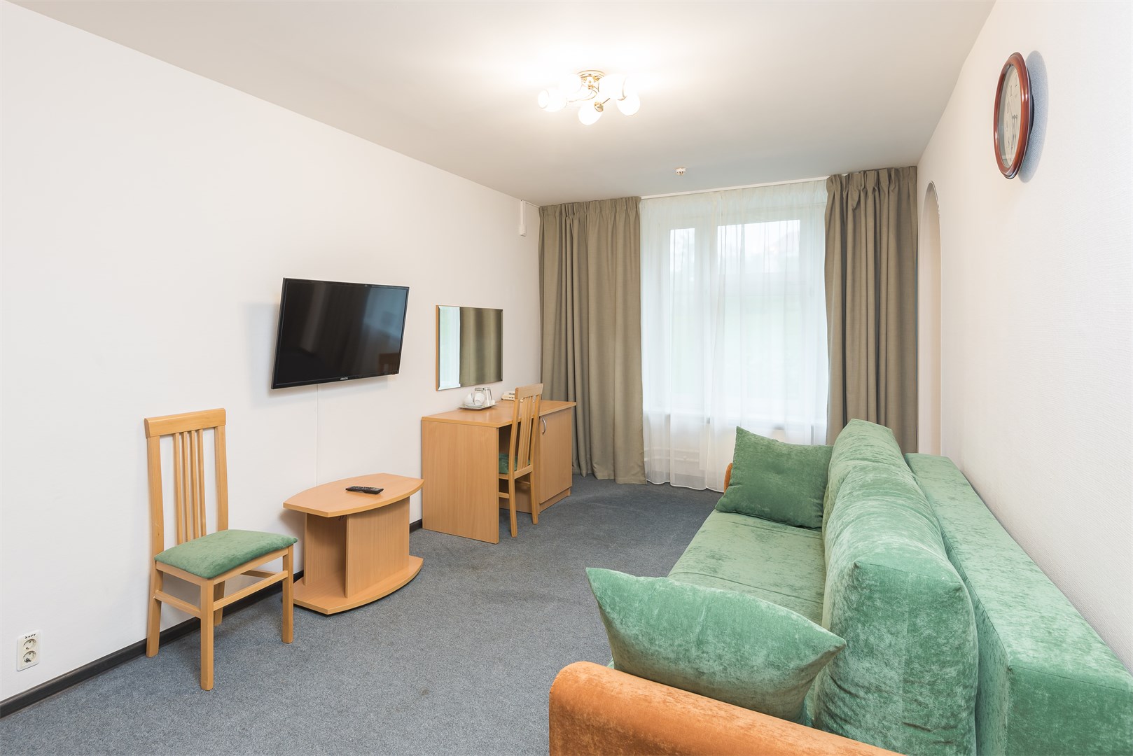 В номере: вешалка, зеркало, кровать двуспальная, набор мягкой мебели, стол, стулья, шкаф, сейф, телевизор, холодильник, чайный набор посуды, электрочайник