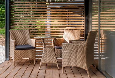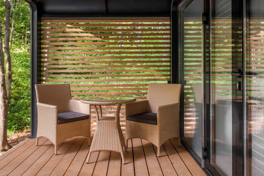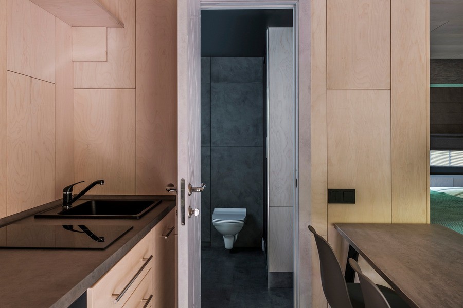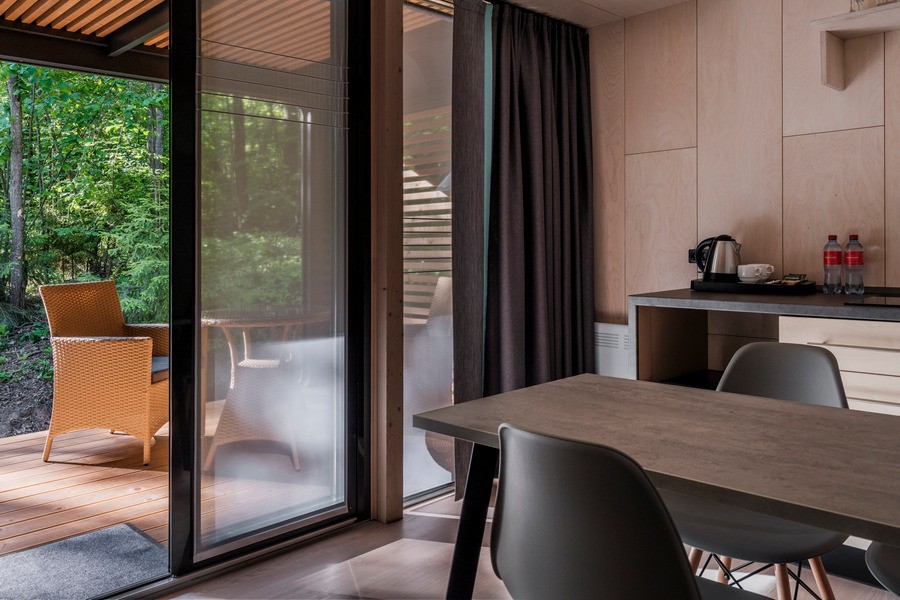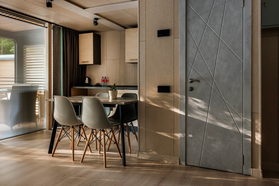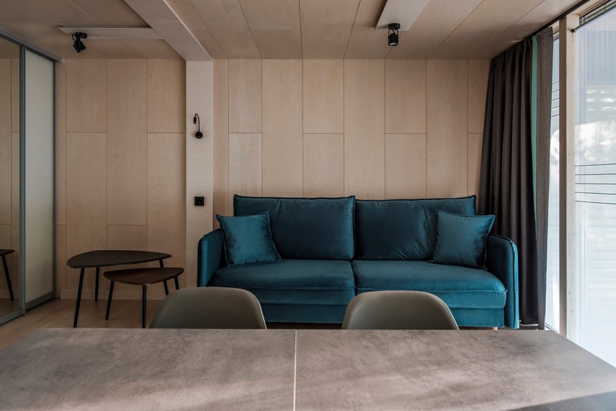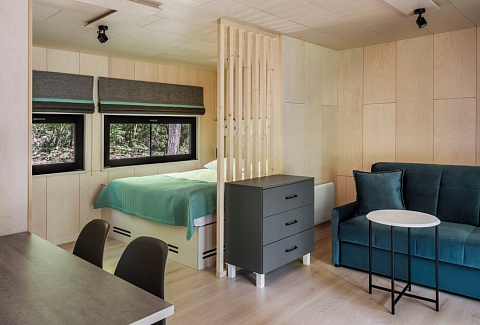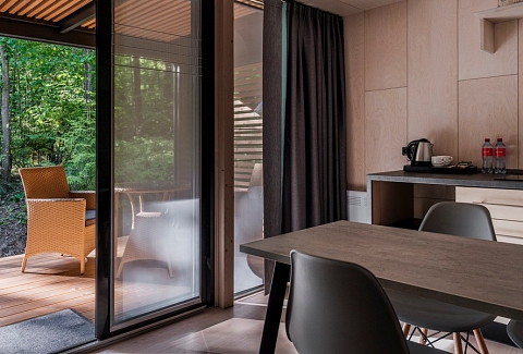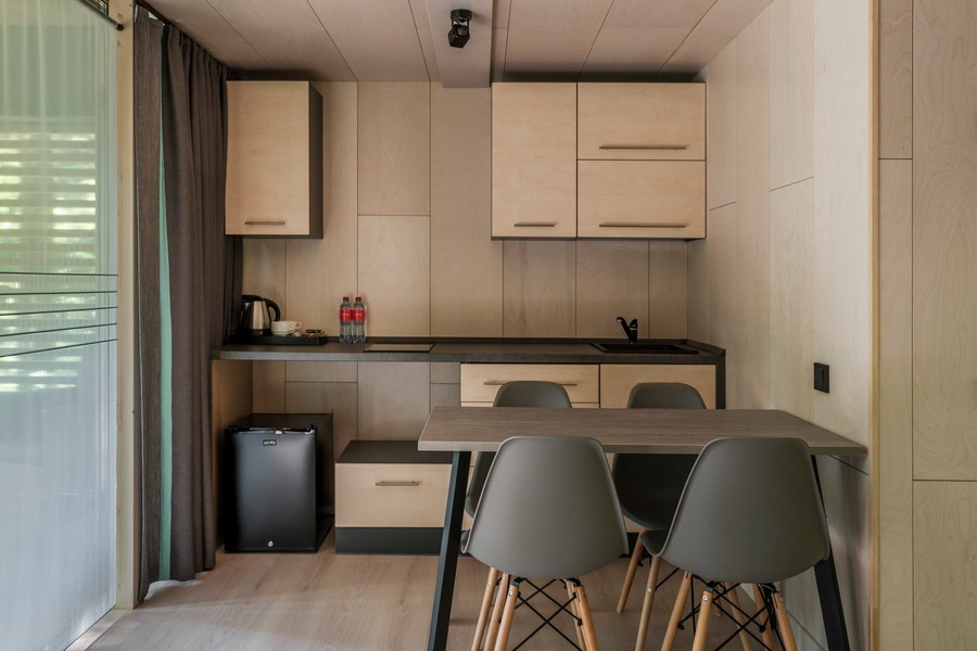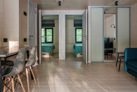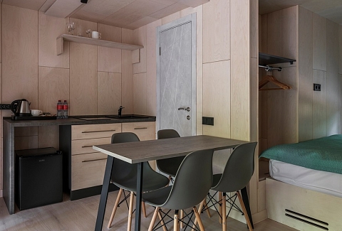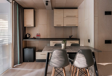 В номере: вешалка, диван, зеркало, кровать двуспальная, кухонная мебель, стол, стулья, шкаф, мини-холодильник, набор посуды, плита электрическая, чайная станция