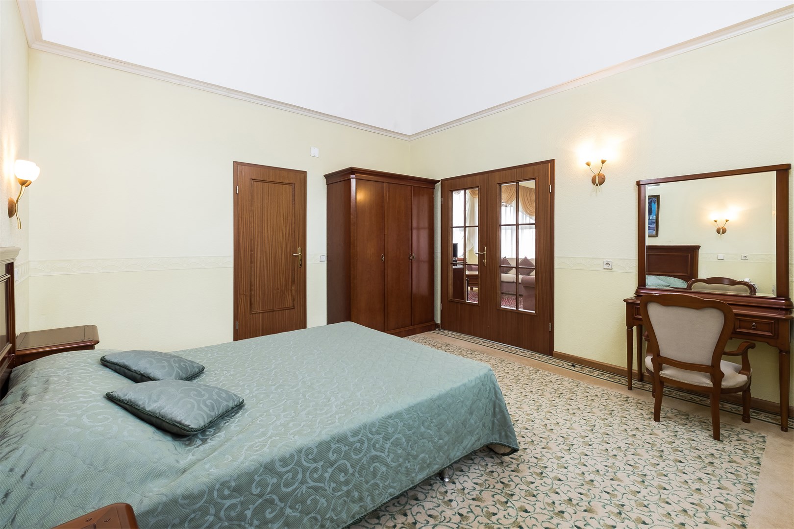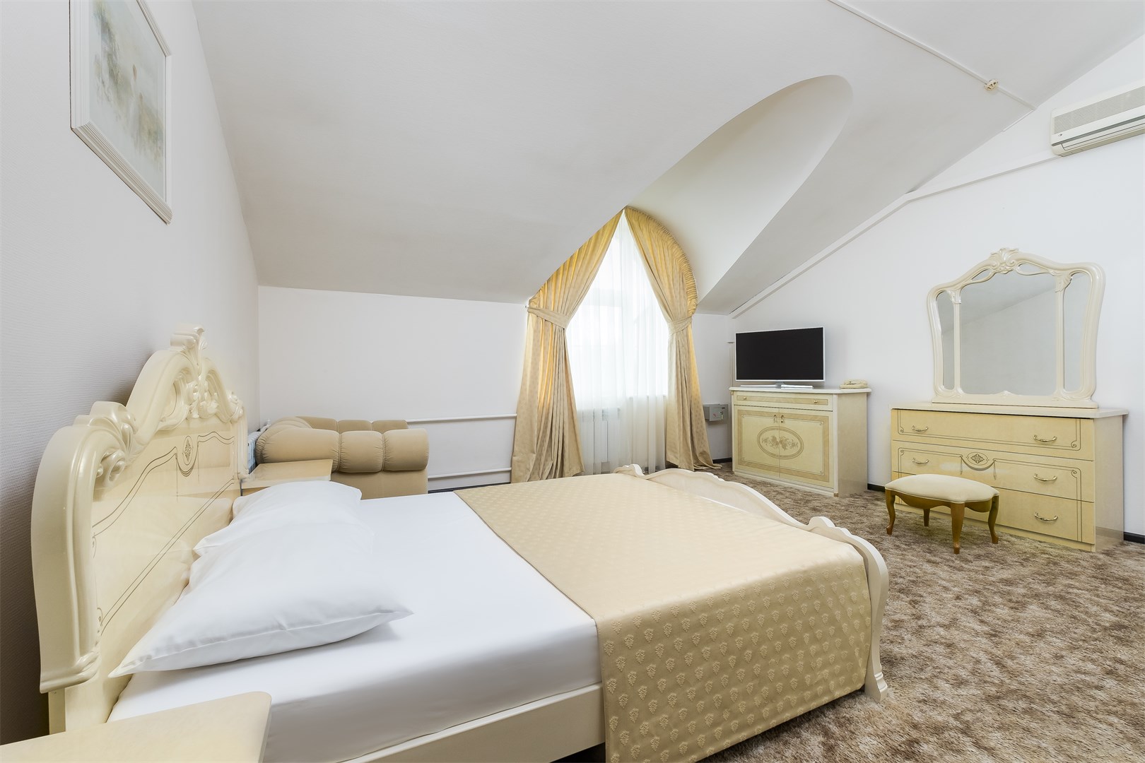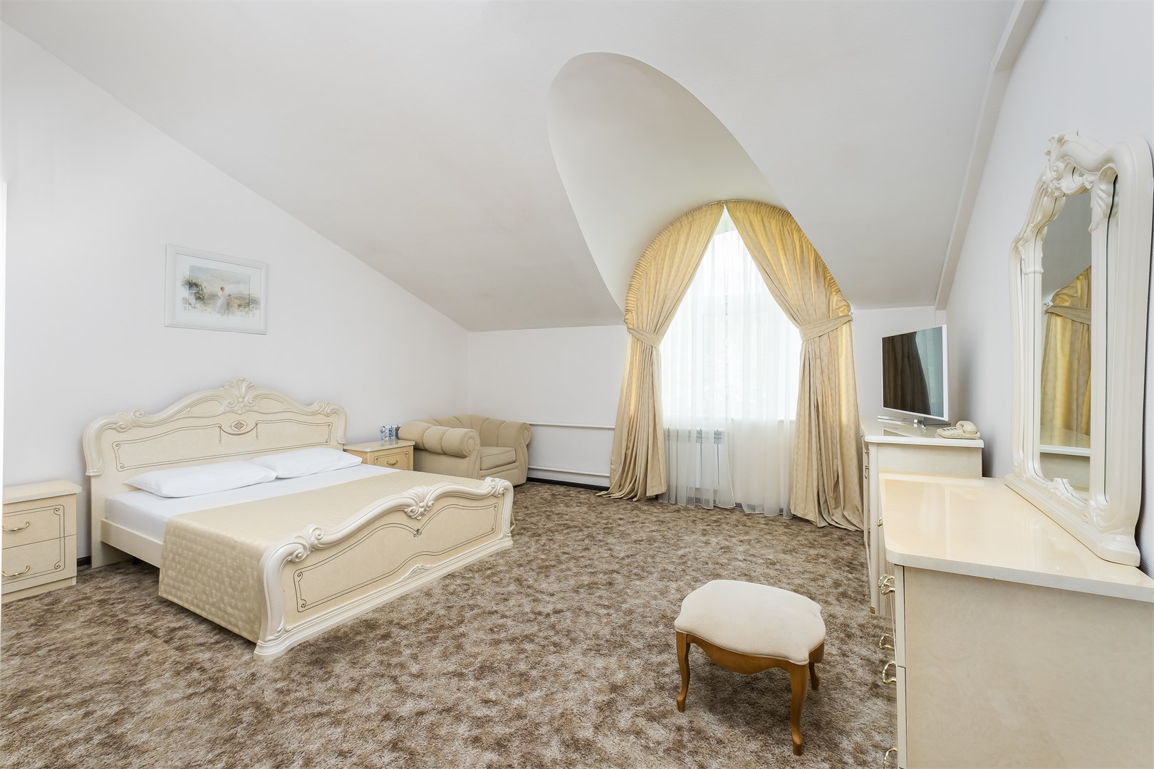 В номере: вешалка, зеркало, кровать двуспальная, прикроватные тумбочки, стол, столик журнальный, шкаф, кондиционер, набор посуды, сейф, телевизор, телефон, утюг, холодильник, чайный набор посуды, электрочайник