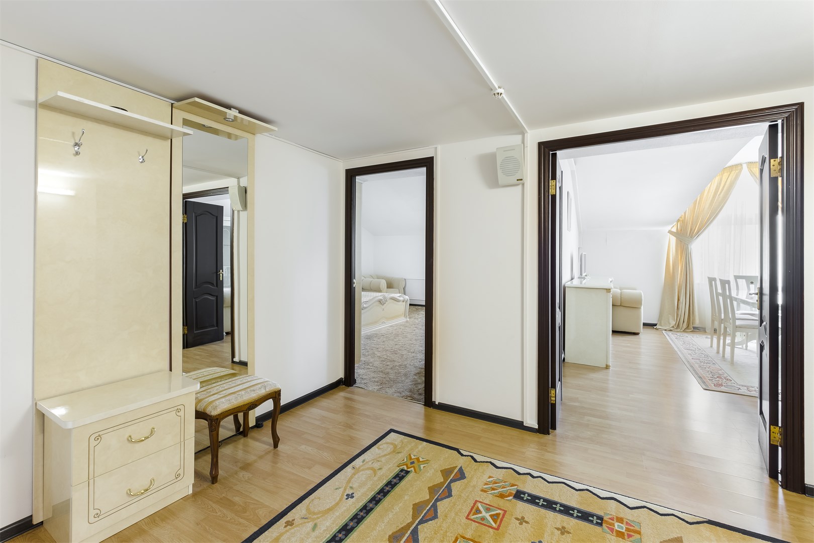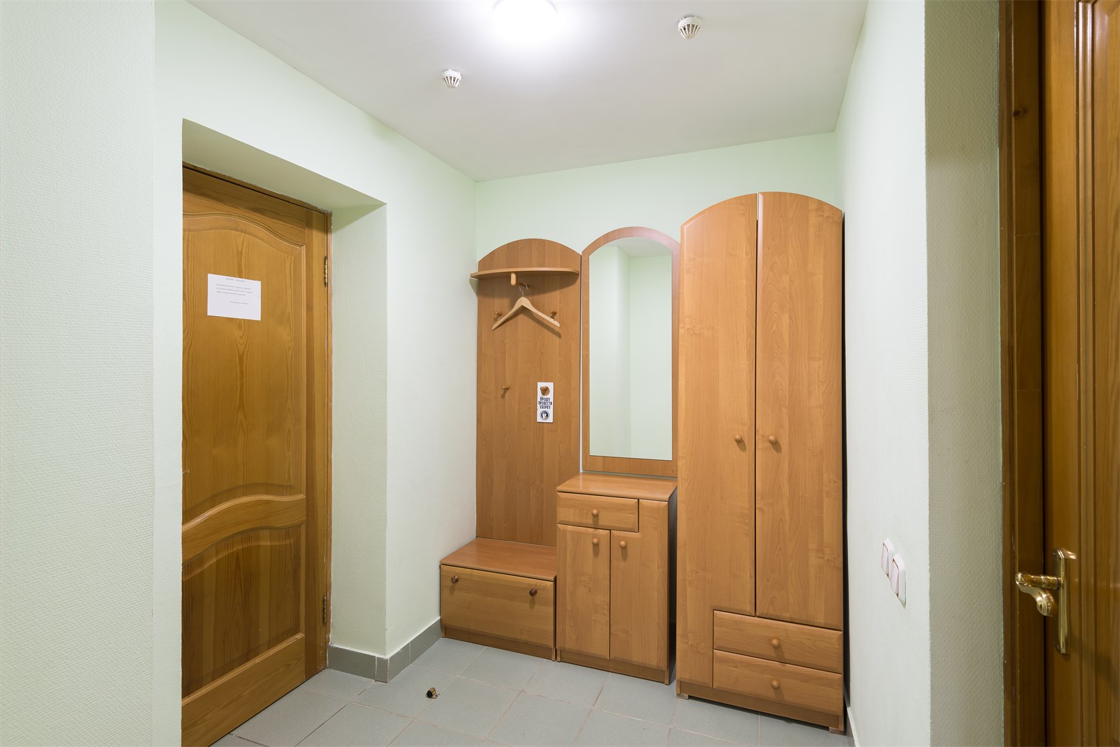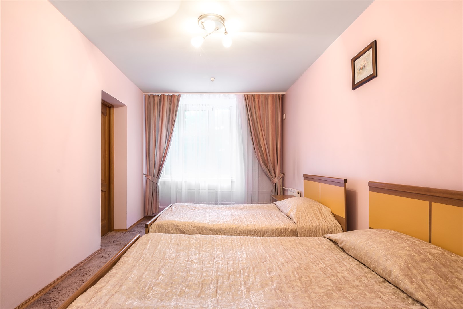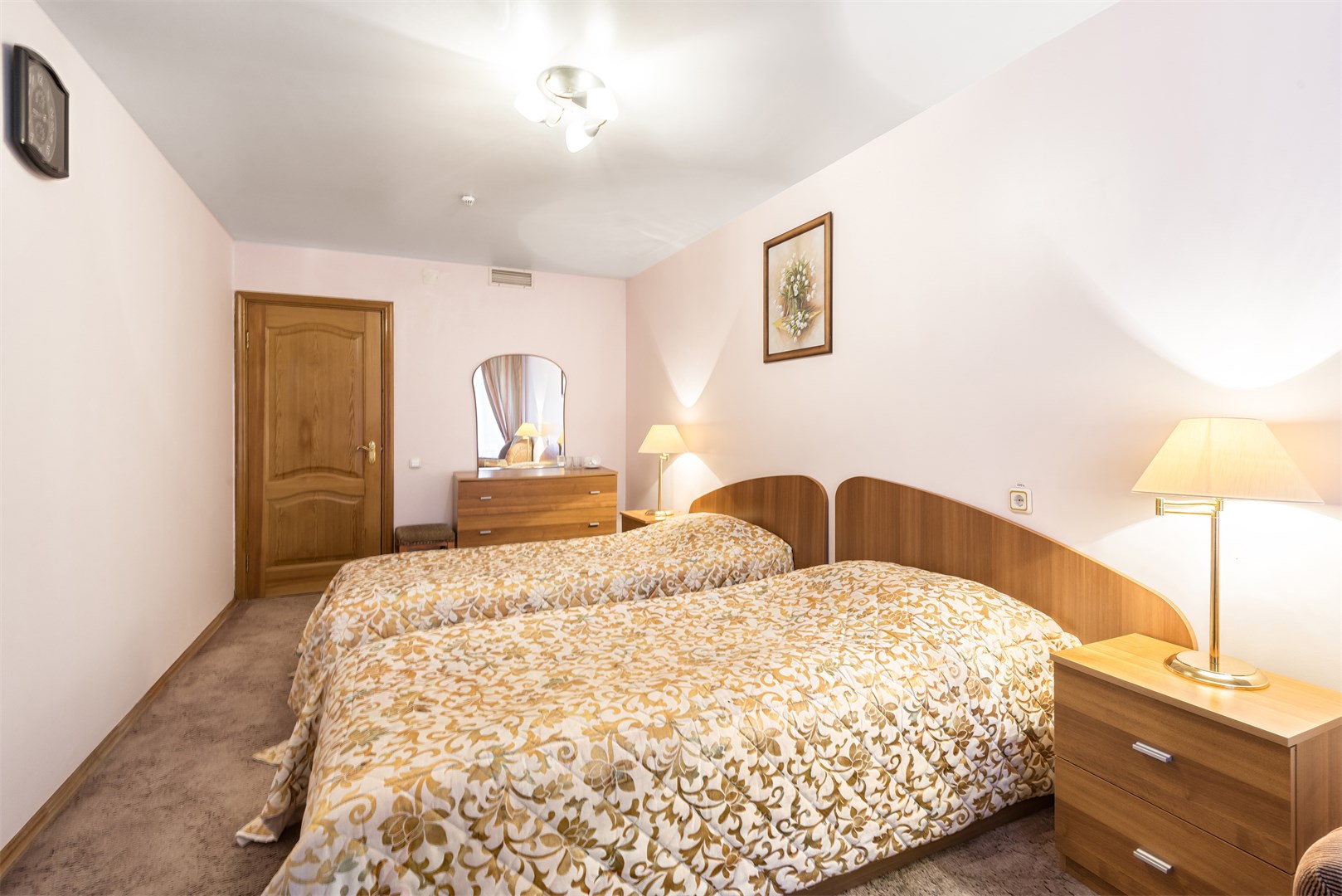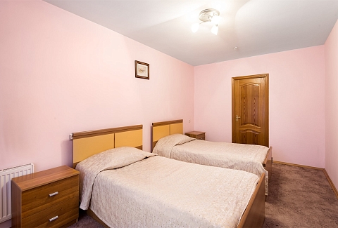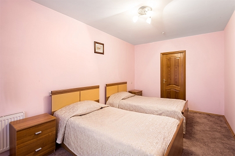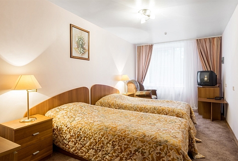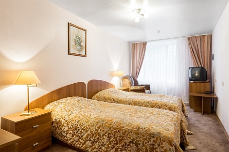 В номере: вешалка, зеркало, кровати односпальные, набор мягкой мебели, прикроватные тумбочки, стол, стулья, шкаф, сейф, телевизор, телефон, холодильник, чайный набор посуды