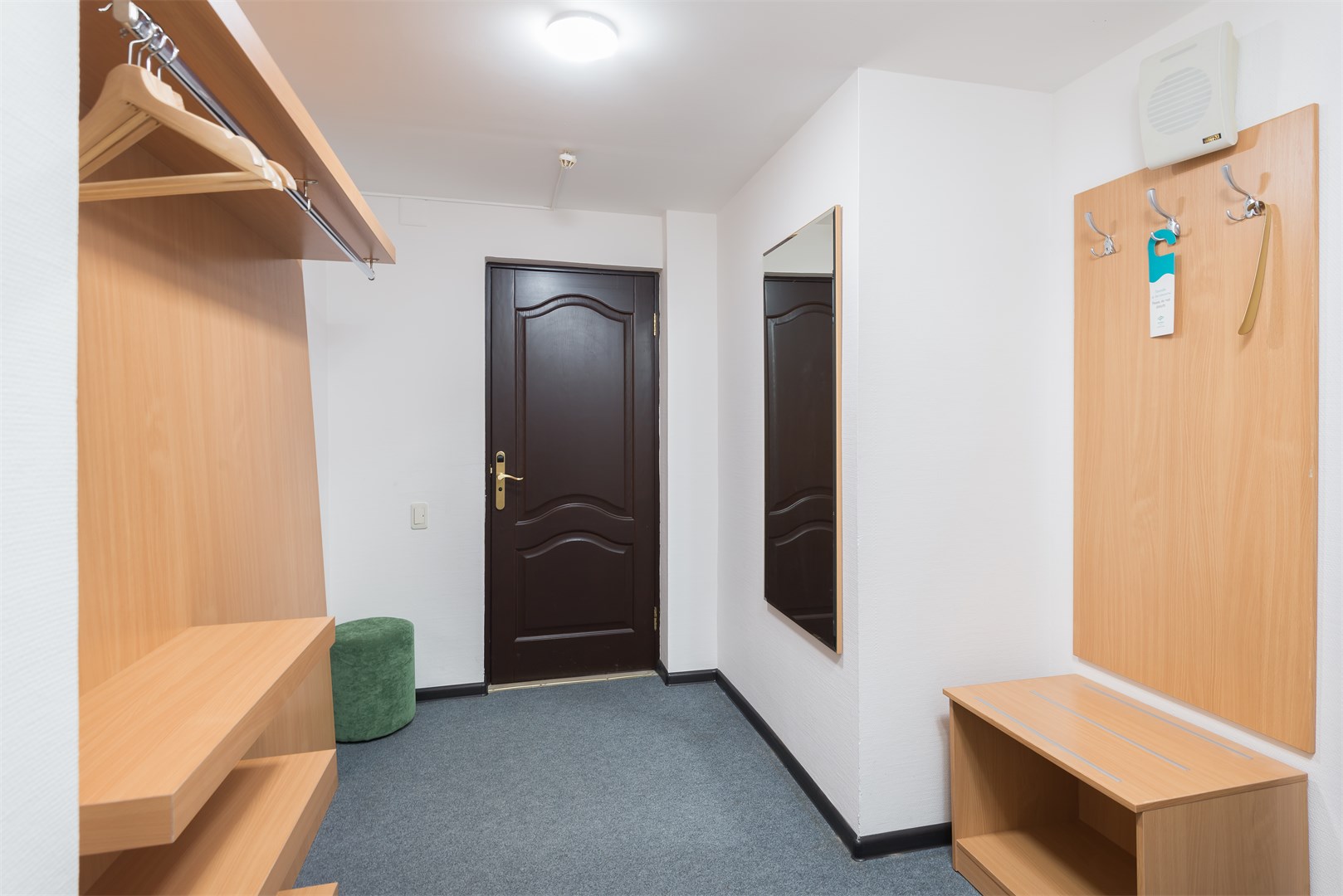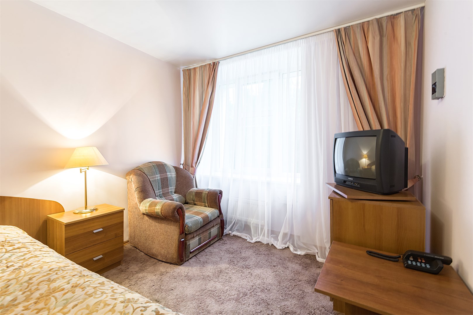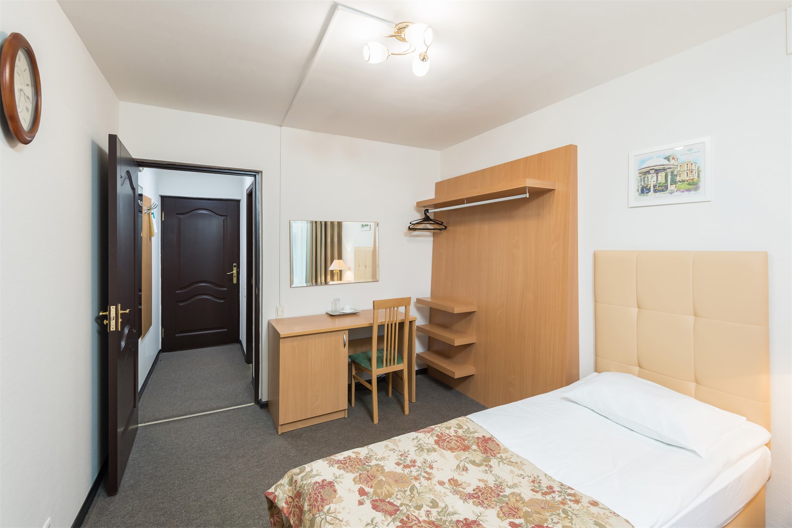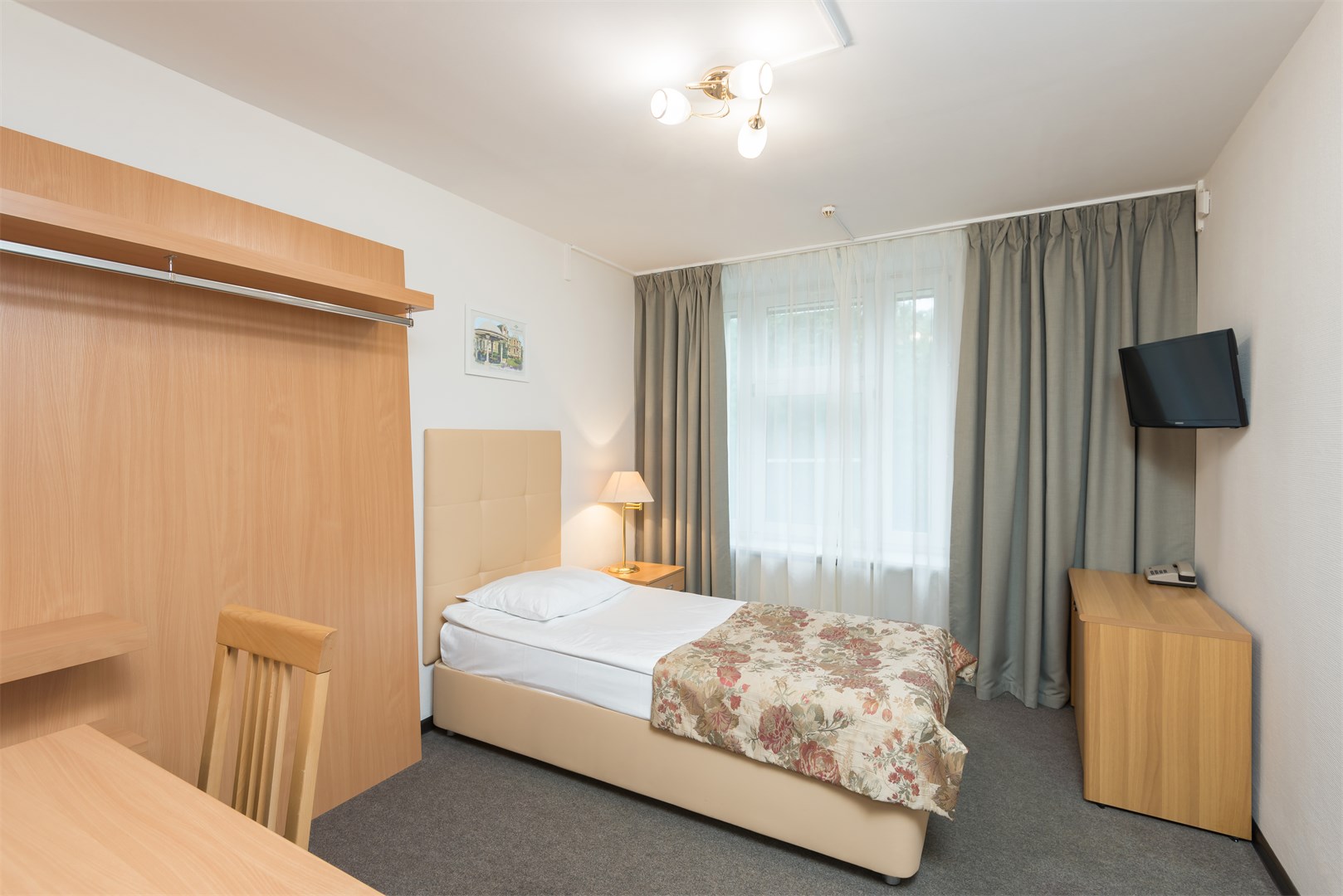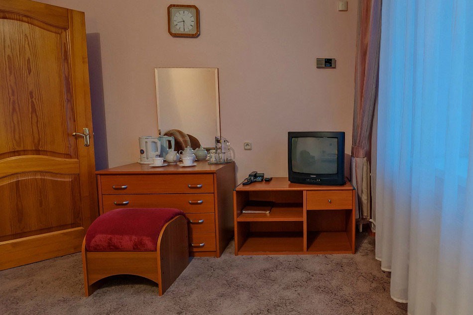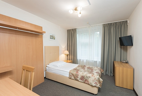 В номере: вешалка, зеркало, кровать односпальная, прикроватная тумбочка, стол, стул, шкаф, сейф, телевизор, холодильник, чайный набор посуды