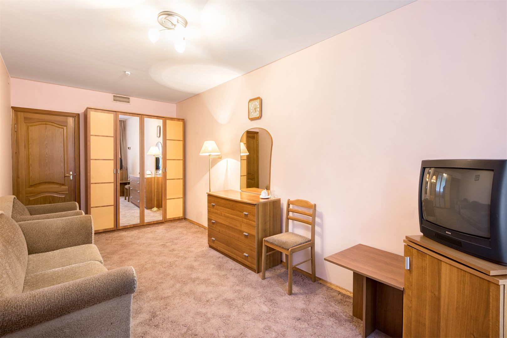В номере: вешалка, зеркало, кровать двуспальная, набор мягкой мебели, прикроватные тумбочки, стол, стулья, шкаф, телевизор, холодильник, чайный набор посуды