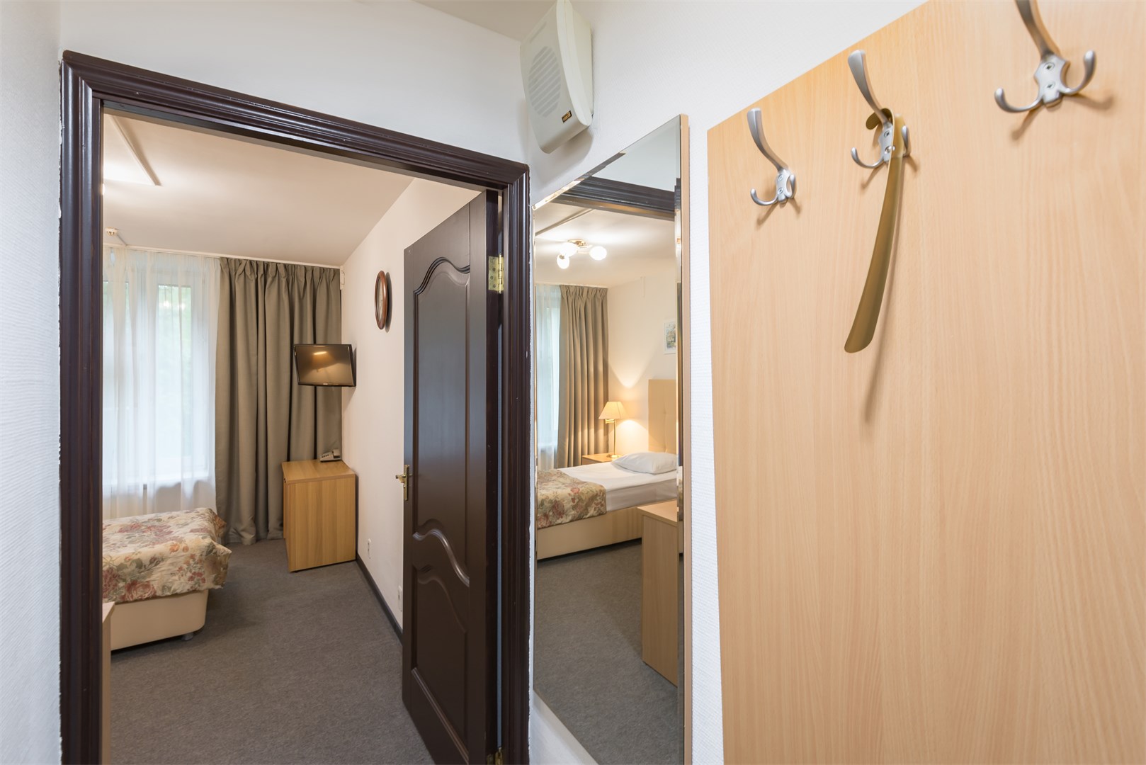 В номере: вешалка, зеркало, кровати односпальные, прикроватные тумбочки, стол, стулья, шкаф, сейф, телевизор, холодильник, чайный набор посуды