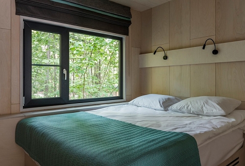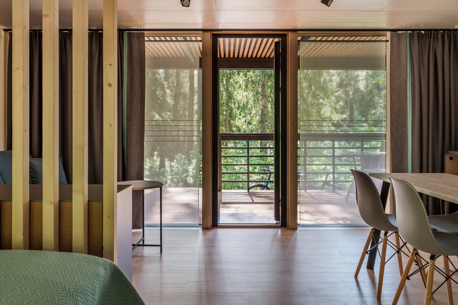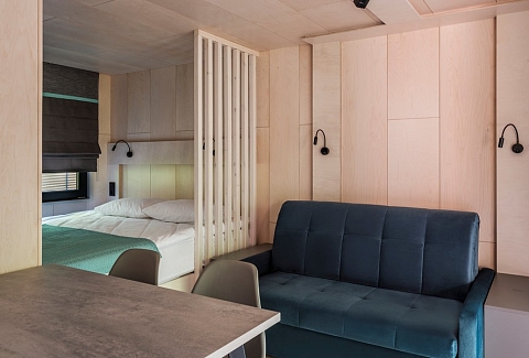 В номере: вешалка, диван раскладной, зеркало, кровать двуспальная, кухонная мебель, стол, стулья, шкаф, мини-холодильник, набор посуды, плита электрическая, чайная станция