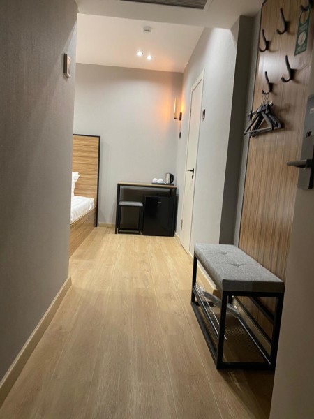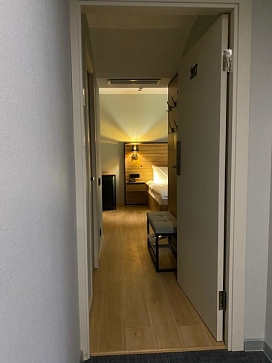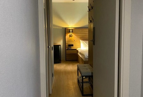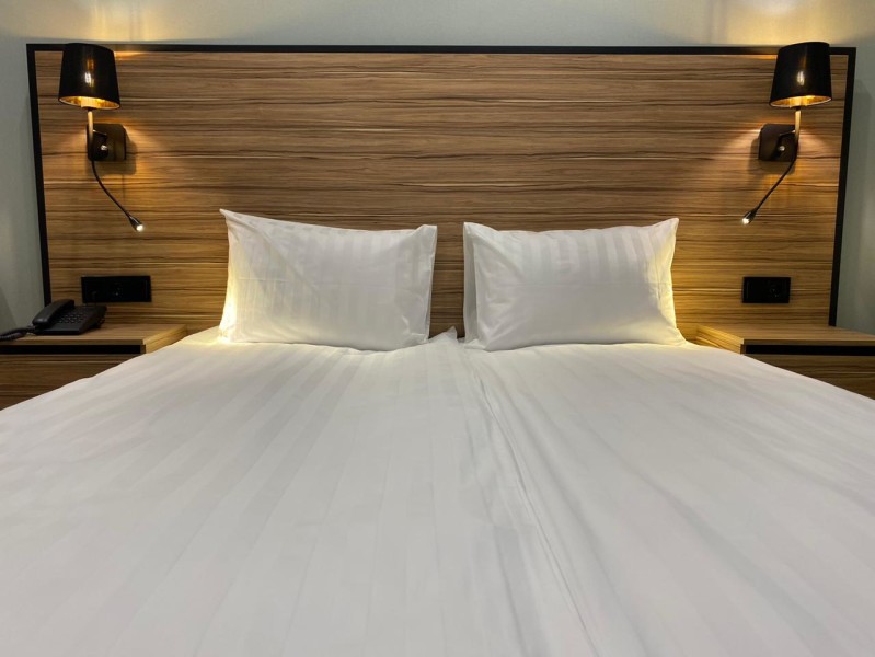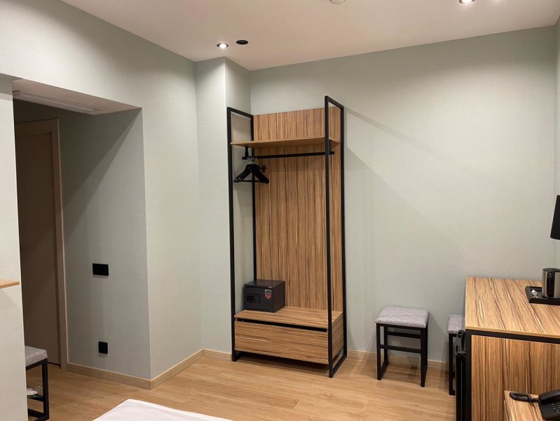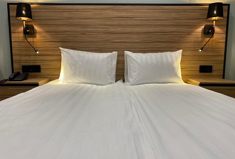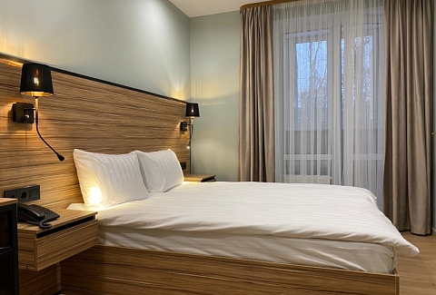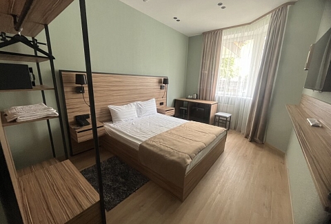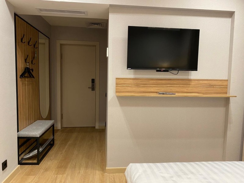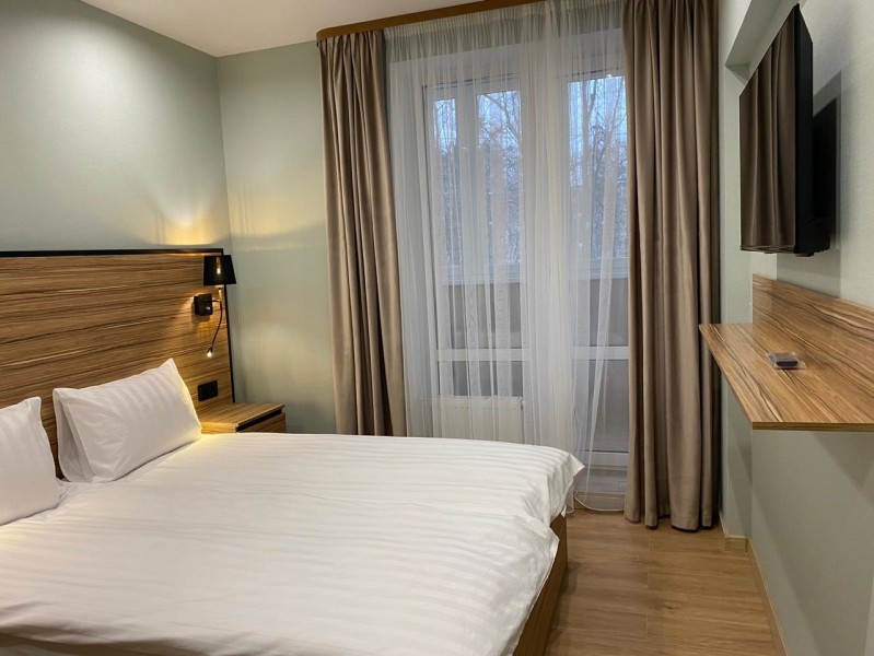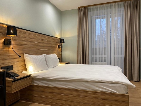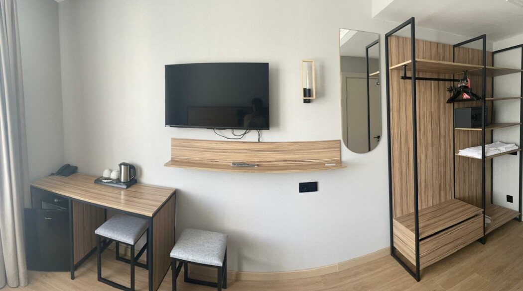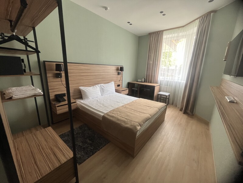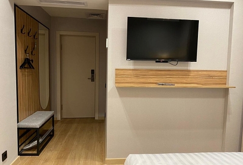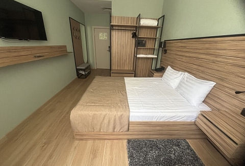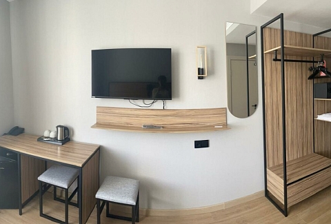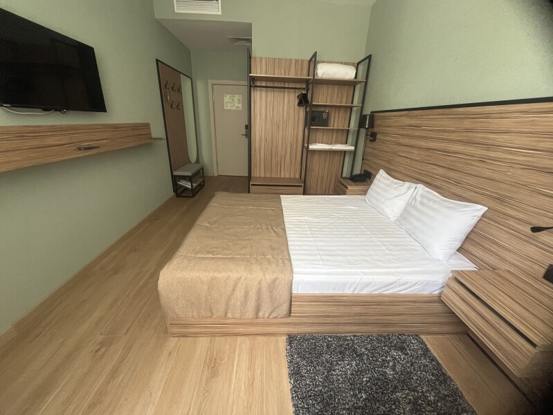В номере: зеркало, кровать двуспальная, прикроватные тумбочки, стол, стул, шкаф, мини-холодильник, сейф, телевизор ЖК, электрочайник