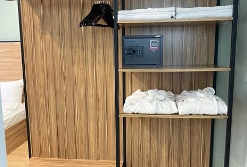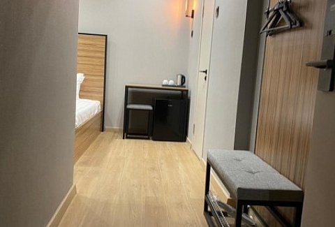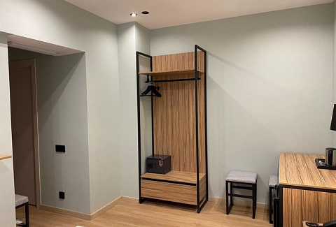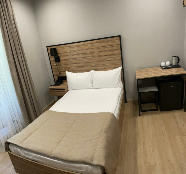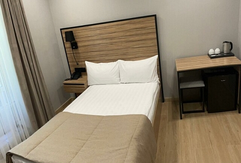В номере: зеркало, кровать односпальная, прикроватная тумбочка, стол, стул, шкаф, мини-холодильник, сейф, телевизор ЖК, электрочайник