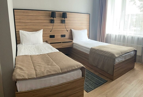 В номере: зеркало, кровати односпальные, прикроватные тумбочки, стол, стул, шкаф, мини-холодильник, сейф, телевизор ЖК, электрочайник