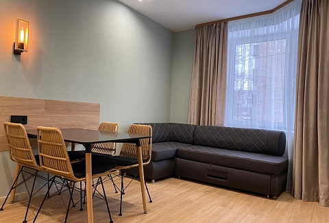 В номере: диван, зеркало, кровать двуспальная, прикроватные тумбочки, стол, стул, шкаф, микроволновая печь, набор посуды, сейф, телевизор ЖК, электрочайник