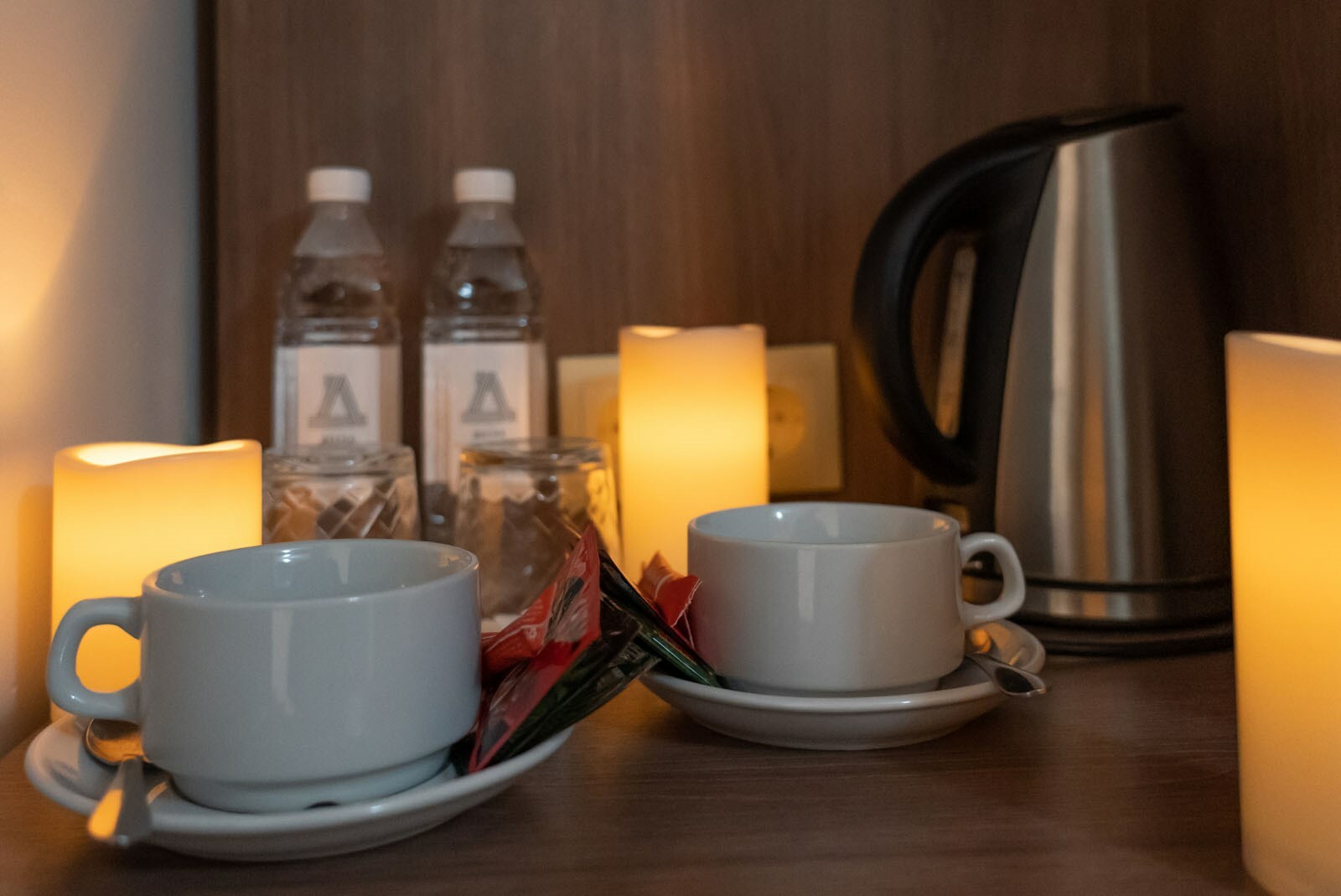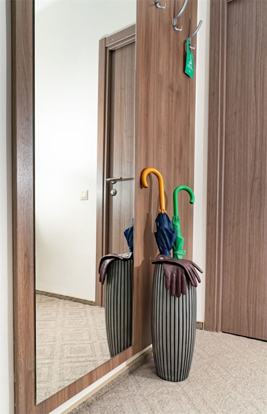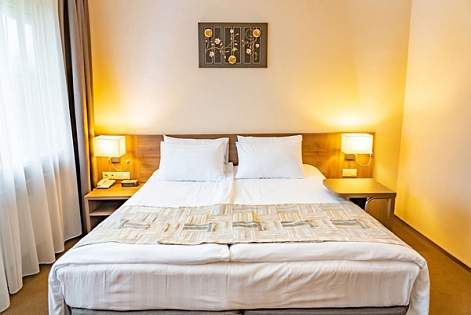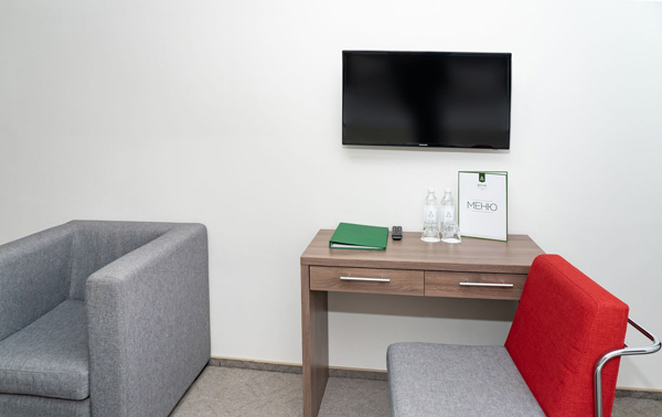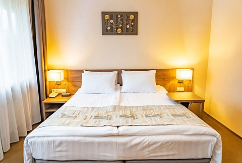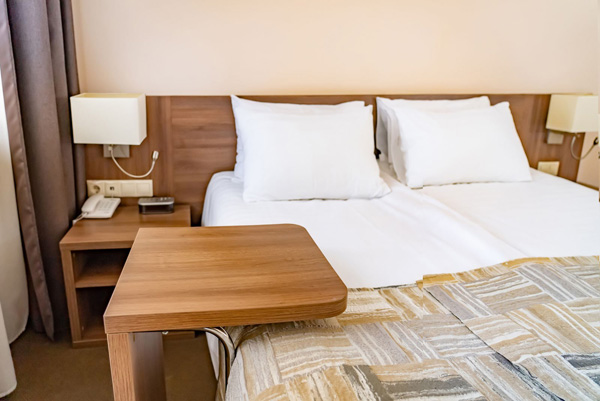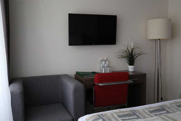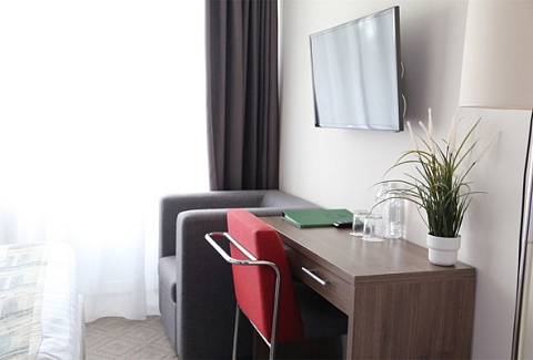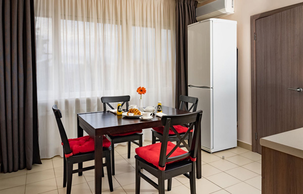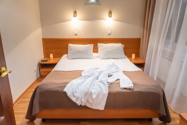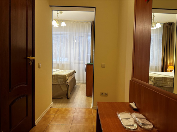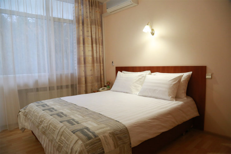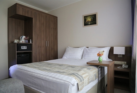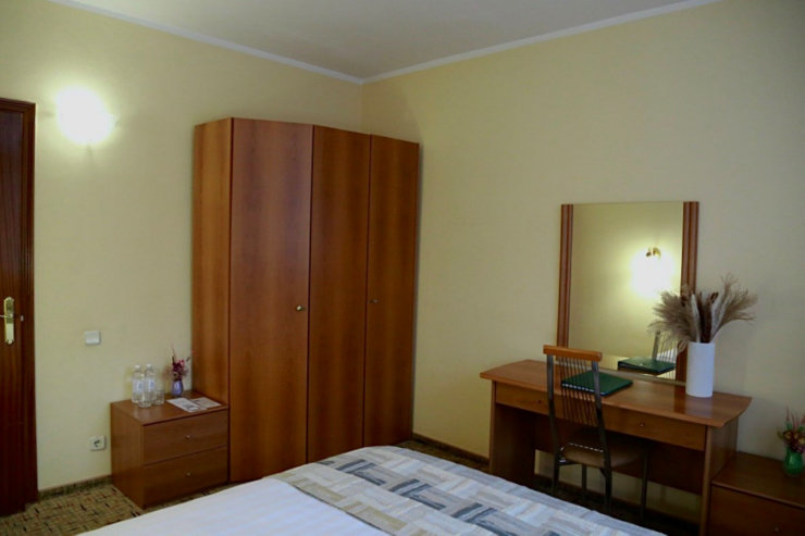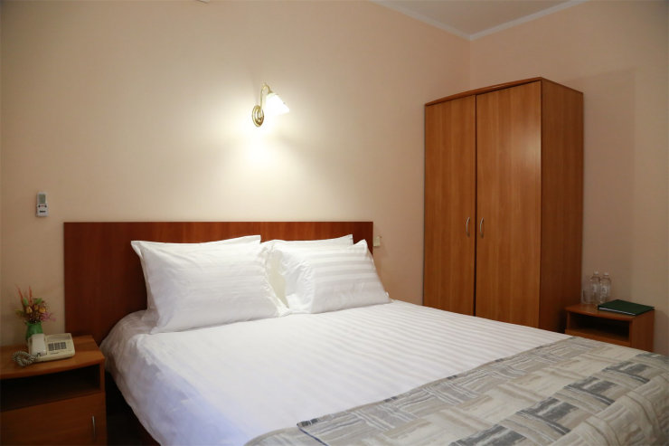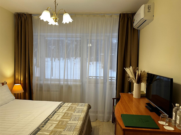 В номере: зеркало, кровать двуспальная, прикроватные тумбочки, стол, стулья, шкаф, кондиционер, мини-холодильник, телевизор, телефон, чайный набор посуды, электрочайник