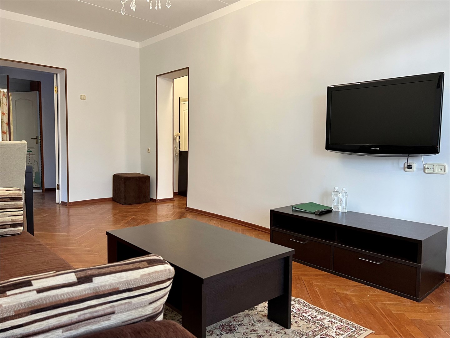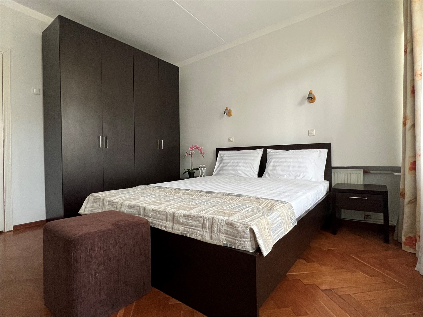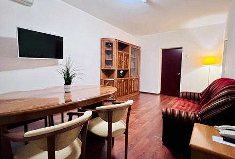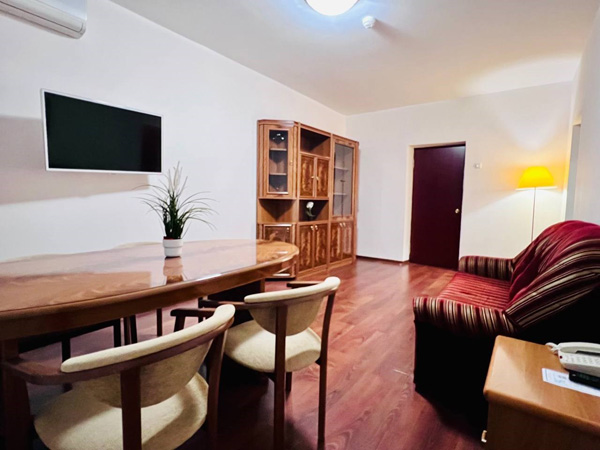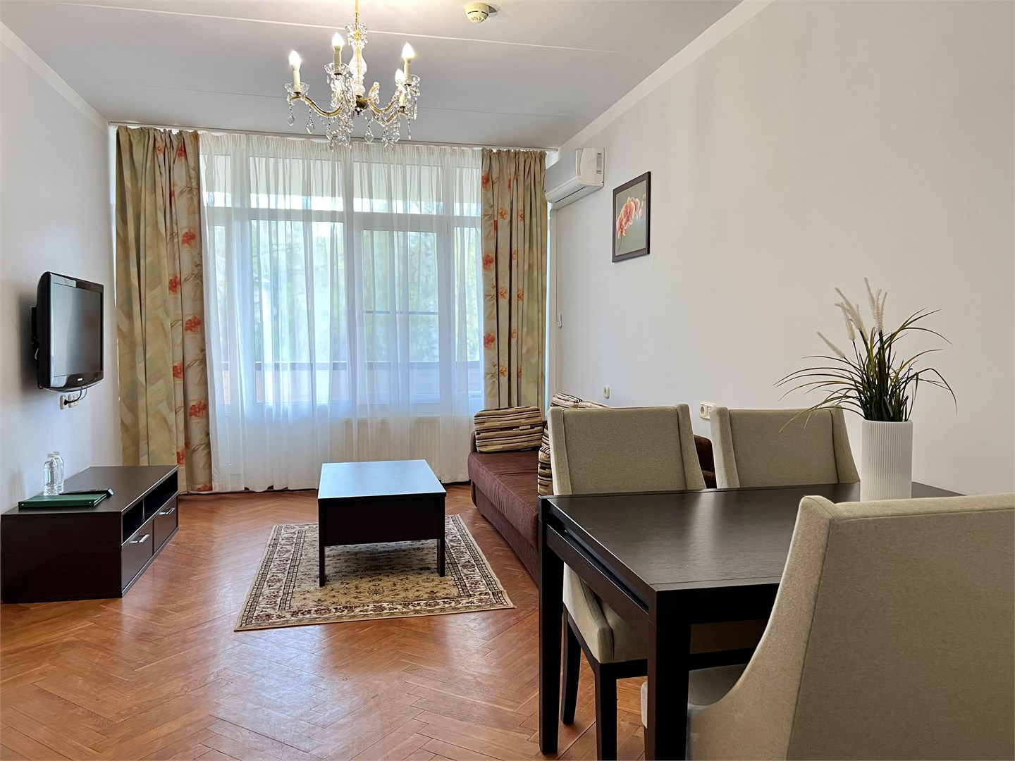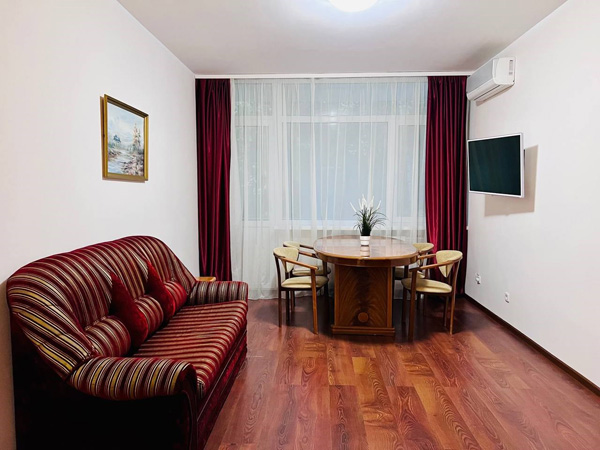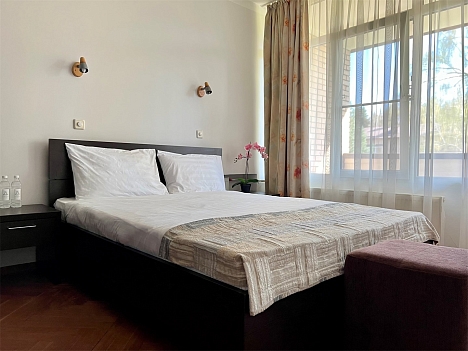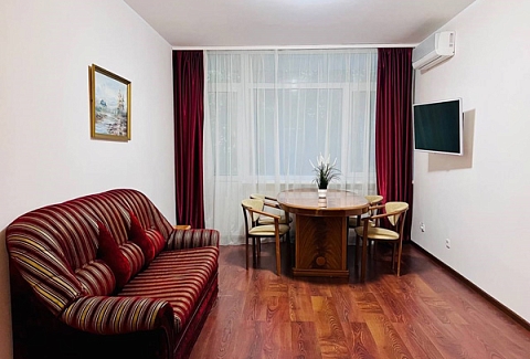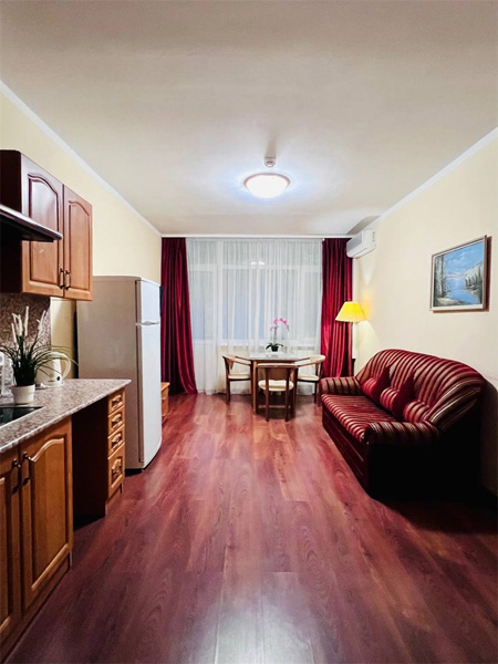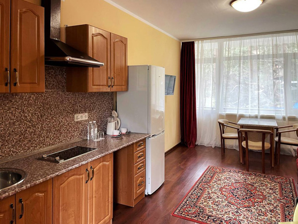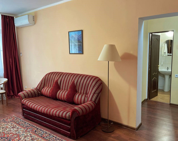 В номере: вешалка, диван раскладной, зеркало, кровать двуспальная, прикроватные тумбочки, стол, стулья, шкаф, кондиционер, набор посуды, телевизор, холодильник, электрочайник