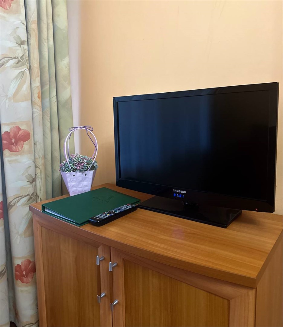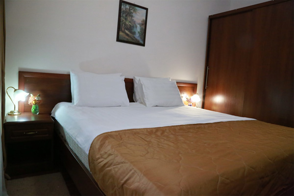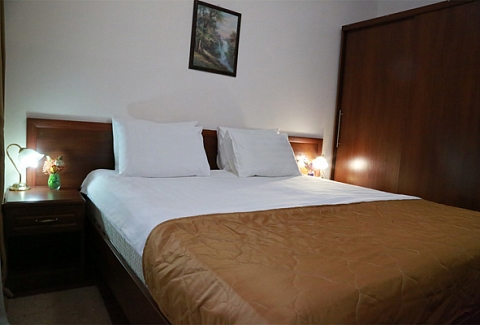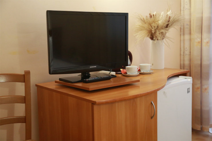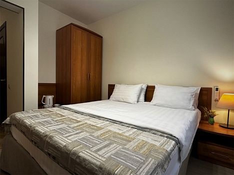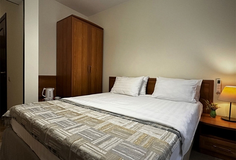 В номере: вешалка, зеркало, кровать двуспальная, прикроватные тумбочки, стол, стулья, шкаф, кондиционер, мини-холодильник, телевизор, чайный набор посуды, электрочайник