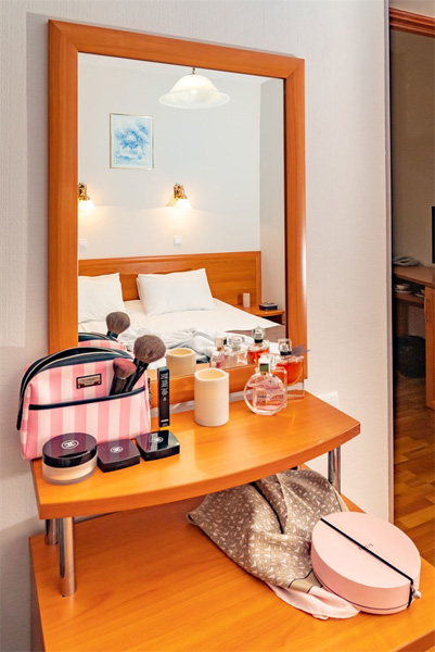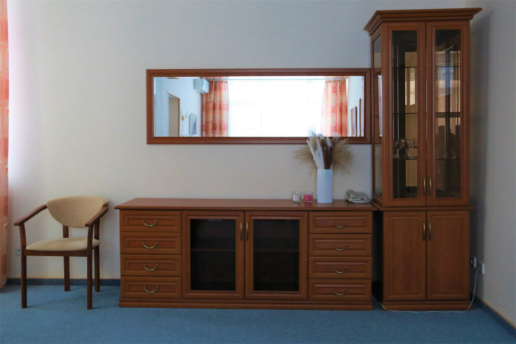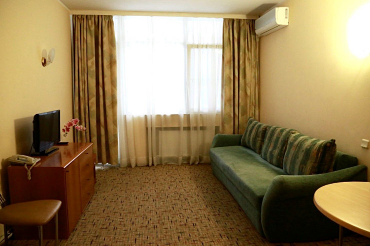 В номере: диван, зеркало, кровать двуспальная, прикроватные тумбочки, стол, столик туалетный, стулья, шкаф, кондиционер, мини-холодильник, телевизор, телефон, чайный набор посуды, электрочайник