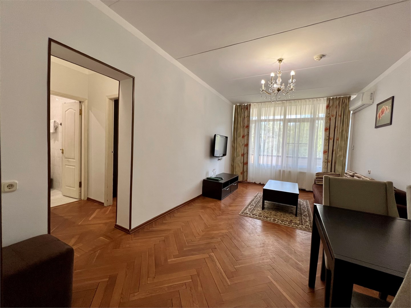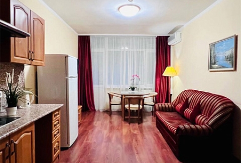 В номере: вешалка, диван, зеркало, комод, кресла, кровать двуспальная, прикроватные тумбочки, стол, стулья, тумба, шкаф-купе, кондиционер, набор посуды, плита электрическая, телевизор ЖК, телефон, холодильник, чайный набор посуды, электрочайник