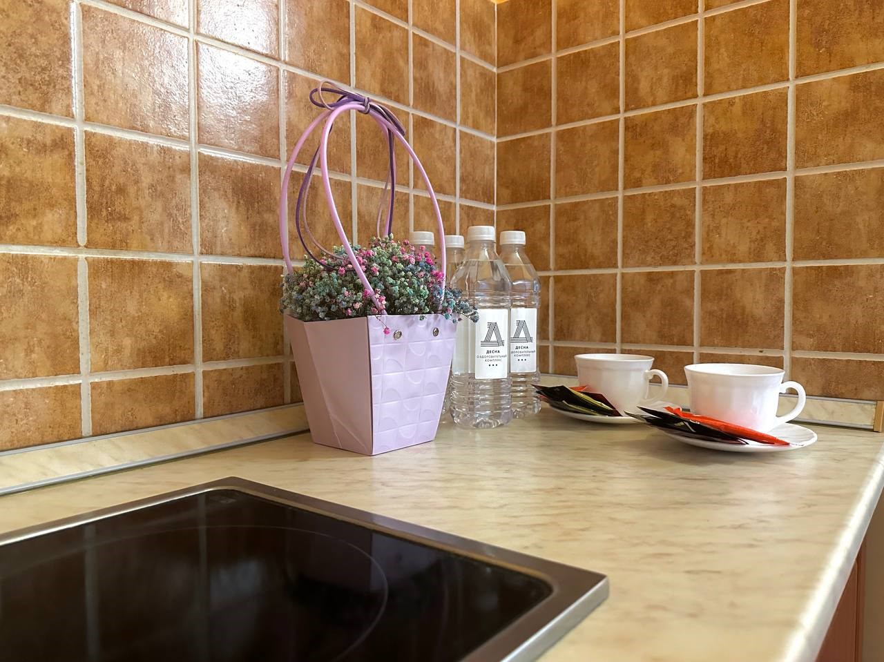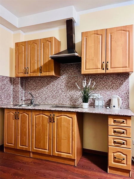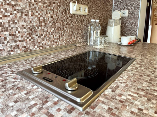 В номере: зеркало, кровать двуспальная, прикроватные тумбочки, пуфик, стол, стул, шкаф, кондиционер, плита газовая, телевизор ЖК, холодильник, чайный набор посуды, электрочайник