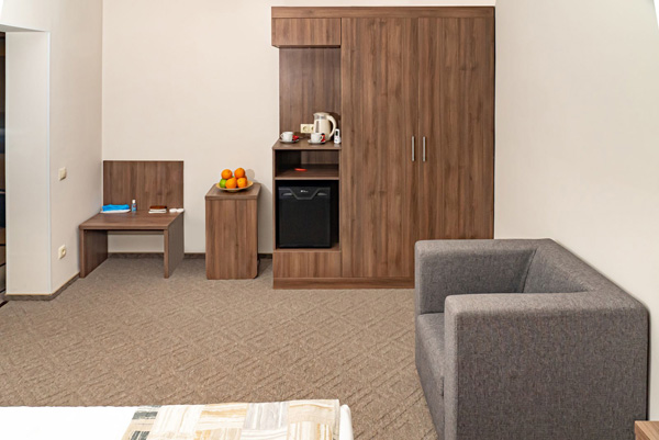 В номере: диван, зеркало, кресло, кровать двуспальная, прикроватные тумбочки, стол, столик кофейный, тумба, шкаф, кондиционер, мини-холодильник, телевизор, телефон, чайный набор посуды, электрочайник